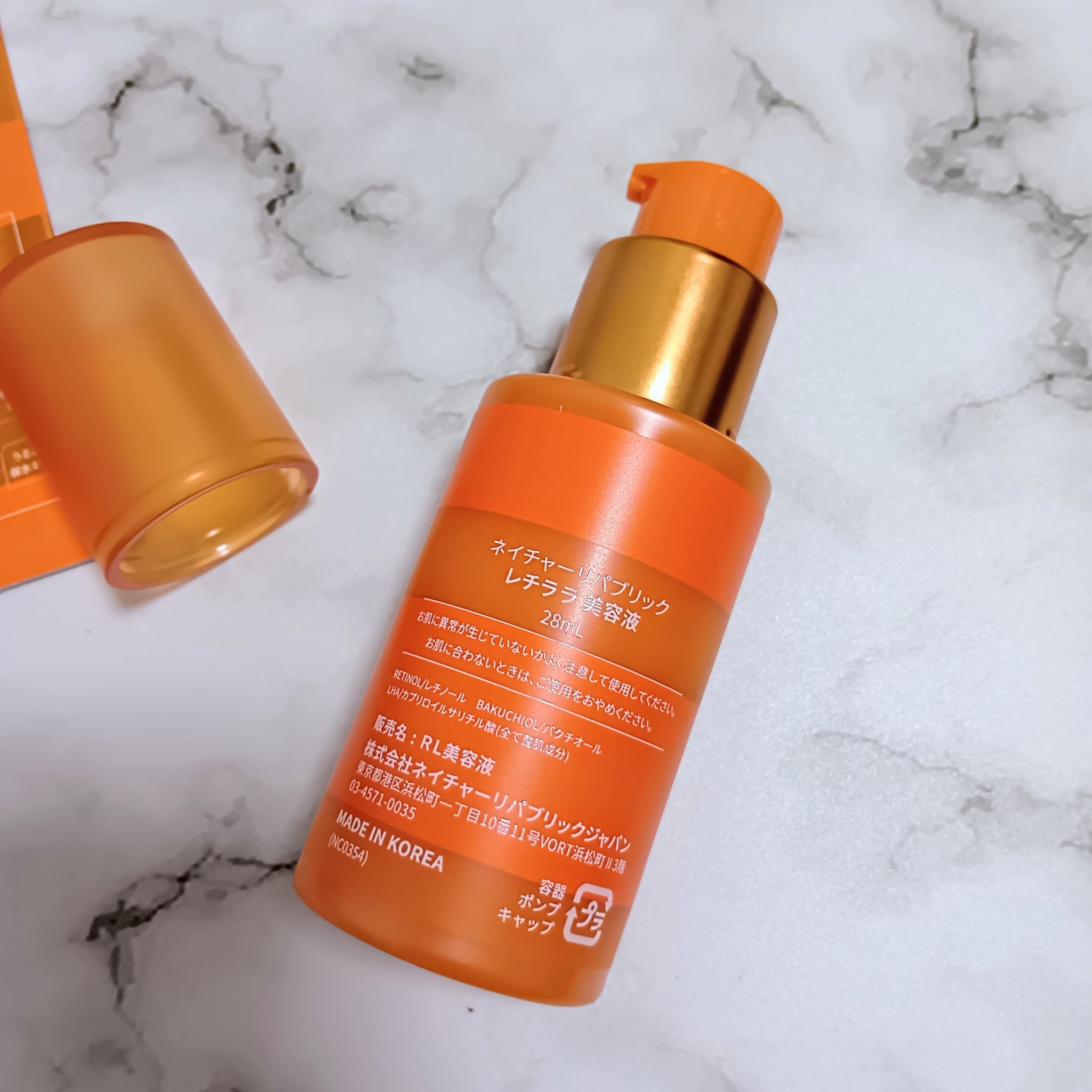 ネイチャーリパブリック レチララ美容液を使ってみました🩷レチノール、パクチオール、LHAが配合された導入ピール美容液✨ポンプ式で使いやすい量が小出しで出せるのが嬉しいところ👌そして容器もオレンジのビタミンカラーで可愛くてお気に入りです♡テクス...