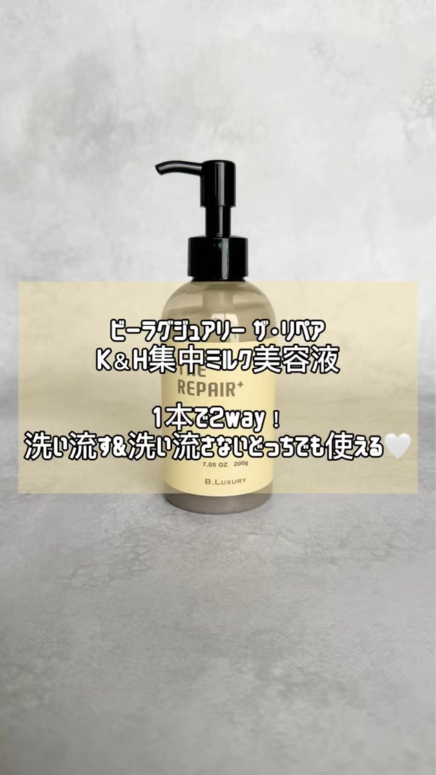 \髪にも美容液/ビーラグジュアリー ザ・リペア K&H集中ミルク美容液を使用しました🙆💛グレーのとろっとしたテクスチャーです✨たっぷり髪につけると、しっとりとした使用感でした☺️ポンプ式で手軽に使えるのも嬉しいです💕●質感アップサポート成分「...