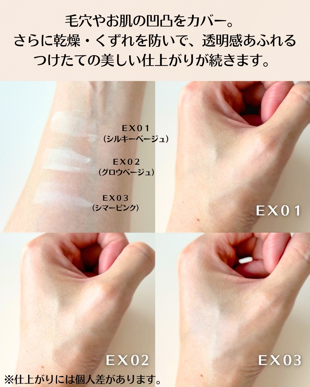 - <EX01 シルキーベージュ> (ビニルジメチコン/メチコンシルセスキオキサン)クロスポリマー、窒化ホウ素、ラウリン酸亜鉛、シリカ、ジラウロイルグルタミン酸リシンNa、塩化Mg、コメヌカスフィンゴ糖脂質、コメヌカ油、シクロデキストリン、ナイロン-12、シルク、オクテニルコハク酸デンプンAl、ジメチコン、合成フルオロフロゴパイト、酸化スズ、シア脂、硫酸Ca水和物、セチルPGヒドロキシエチルパルミタミド、水酸化Al、ハイドロゲンジメチコン、ナイアシンアミド、パルミチン酸アスコルビルリン酸3Na、セラミドEOP、セラミドNG、セラミドNP、セラミドAP、ジペプチド-15、アゼロイルジグリシンK、ノイバラ果実エキス、エクトイン、パンテノール、アラントイン、グリチルレチン酸ステアリル、ツボクサエキス、ピリドキシンHCl、トコフェリルリン酸Na、ポリクオタニウム-51、スイゼンジノリ細胞外多糖体、シロキクラゲ多糖体、(HDI/トリメチロールヘキシルラクトン)クロスポリマー、1,2-ヘキサンジオール、BG、エチルヘキシルグリセリン、ジステアリン酸Al、ステアロイルグルタミン酸2Na、セバシン酸イソステアリル、トコフェロール、トリ(カプリル酸/カプリン酸)グリセリル、ヒドロキシアパタイト、フィトステロールズ、メチコン、ラウロイルリシン、水、水添レシチン、野菜油、フェノキシエタノール、メチルパラベン、(+/-)カオリン、グンジョウ、タルク、マイカ、酸化チタン、酸化亜鉛、酸化鉄 <EX02 グロウベージュ> (ビニルジメチコン/メチコンシルセスキオキサン)クロスポリマー、窒化ホウ素、ラウリン酸亜鉛、シリカ、ジラウロイルグルタミン酸リシンNa、塩化Mg、コメヌカスフィンゴ糖脂質、コメヌカ油、シクロデキストリン、ナイロン-12、シルク、オクテニルコハク酸デンプンAl、ジメチコン、合成フルオロフロゴパイト、酸化スズ、シア脂、硫酸Ca水和物、セチルPGヒドロキシエチルパルミタミド、水酸化Al、ハイドロゲンジメチコン、ナイアシンアミド、パルミチン酸アスコルビルリン酸3Na、セラミドEOP、セラミドNG、セラミドNP、セラミドAP、ジペプチド-15、アゼロイルジグリシンK、ノイバラ果実エキス、エクトイン、パンテノール、アラントイン、グリチルレチン酸ステアリル、ツボクサエキス、ピリドキシンHCl、トコフェリルリン酸Na、ポリクオタニウム-51、スイゼンジノリ細胞外多糖体、シロキクラゲ多糖体、(HDI/トリメチロールヘキシルラクトン)クロスポリマー、1,2-ヘキサンジオール、BG、エチルヘキシルグリセリン、ジステアリン酸Al、ステアロイルグルタミン酸2Na、セバシン酸イソステアリル、トコフェロール、トリ(カプリル酸/カプリン酸)グリセリル、ヒドロキシアパタイト、フィトステロールズ、メチコン、ラウロイルリシン、水、水添レシチン、野菜油、フェノキシエタノール、メチルパラベン、(+/-)カオリン、グンジョウ、タルク、マイカ、酸化チタン、酸化亜鉛、酸化鉄 <EX03 シマーピンク> (ビニルジメチコン/メチコンシルセスキオキサン)クロスポリマー、窒化ホウ素、ラウリン酸亜鉛、シリカ、ジラウロイルグルタミン酸リシンNa、塩化Mg、コメヌカスフィンゴ糖脂質、コメヌカ油、シクロデキストリン、ナイロン-12、シルク、オクテニルコハク酸デンプンAl、ジメチコン、合成フルオロフロゴパイト、酸化スズ、シア脂、硫酸Ca水和物、セチルPGヒドロキシエチルパルミタミド、水酸化Al、ハイドロゲンジメチコン、ナイアシンアミド、パルミチン酸アスコルビルリン酸3Na、セラミドEOP、セラミドNG、セラミドNP、セラミドAP、ジペプチド-15、アゼロイルジグリシンK、ノイバラ果実エキス、エクトイン、パンテノール、アラントイン、グリチルレチン酸ステアリル、ツボクサエキス、ピリドキシンHCl、トコフェリルリン酸Na、ポリクオタニウム-51、スイゼンジノリ細胞外多糖体、シロキクラゲ多糖体、(HDI/トリメチロールヘキシルラクトン)クロスポリマー、1,2-ヘキサンジオール、BG、エチルヘキシルグリセリン、ジステアリン酸Al、ステアロイルグルタミン酸2Na、セバシン酸イソステアリル、トコフェロール、トリ(カプリル酸/カプリン酸)グリセリル、ヒドロキシアパタイト、フィトステロールズ、メチコン、ラウロイルリシン、水、水添レシチン、野菜油、フェノキシエタノール、メチルパラベン、(+/-)カオリン、グンジョウ、タルク、マイカ、酸化チタン、酸化亜鉛、酸化鉄 <EX04 シマ―ラベンダー(限定)> (ビニルジメチコン/メチコンシルセスキオキサン)クロスポリマー、窒化ホウ素、ラウリン酸亜鉛、シリカ、ジラウロイルグルタミン酸リシンNa、塩化Mg、コメヌカスフィンゴ糖脂質、コメヌカ油、シクロデキストリン、ナイロン-12、シルク、オクテニルコハク酸デンプンAl、ジメチコン、合成フルオロフロゴパイト、酸化スズ、シア脂、硫酸Ca水和物、セチルPGヒドロキシエチルパルミタミド、水酸化Al、ハイドロゲンジメチコン、ナイアシンアミド、パルミチン酸アスコルビルリン酸3Na、セラミ