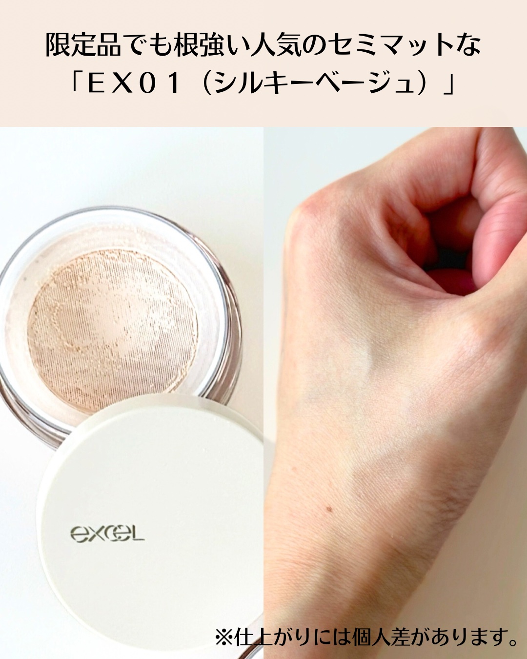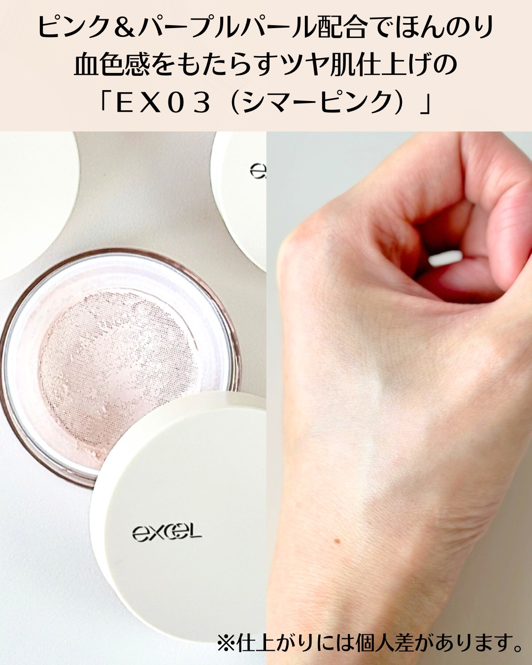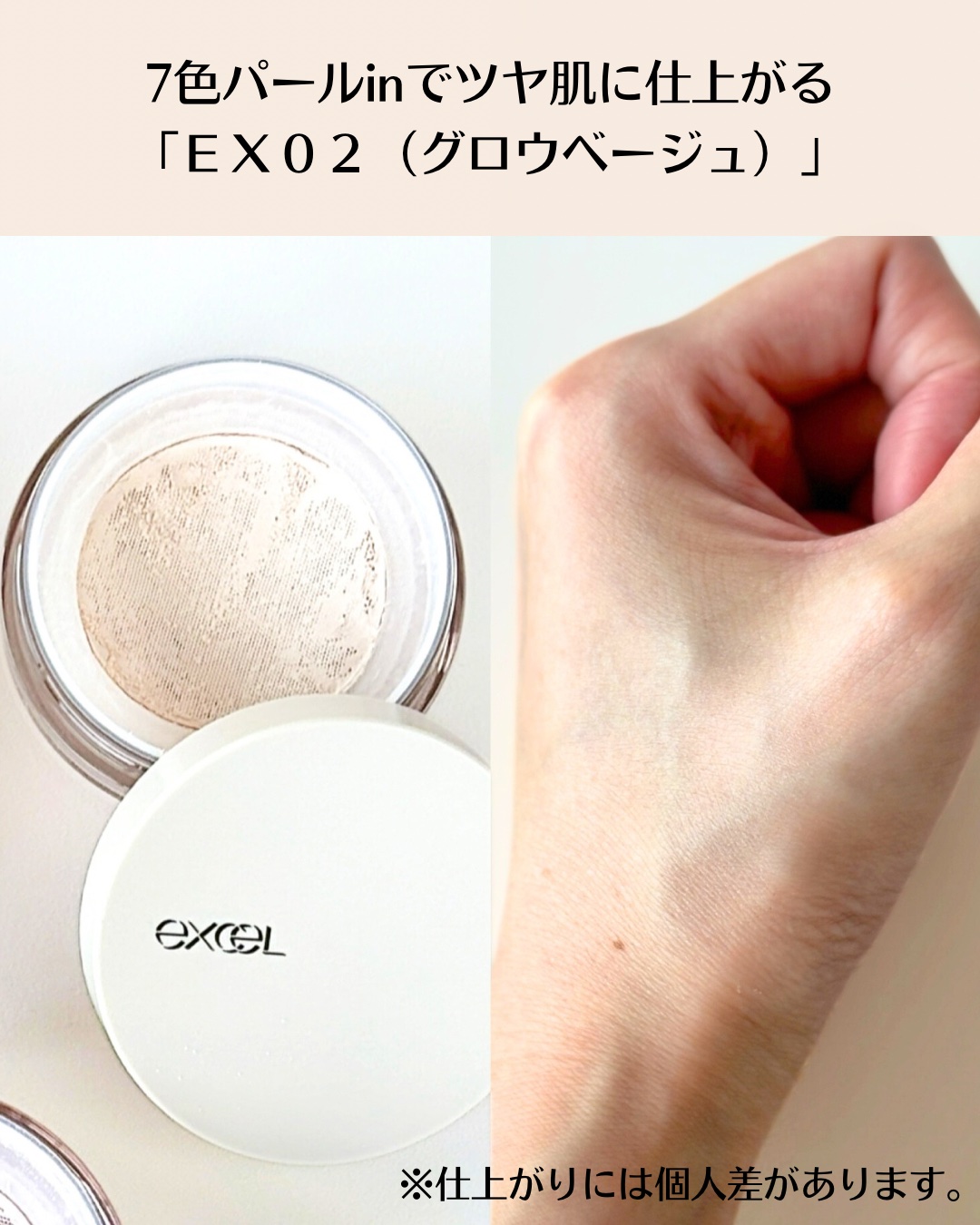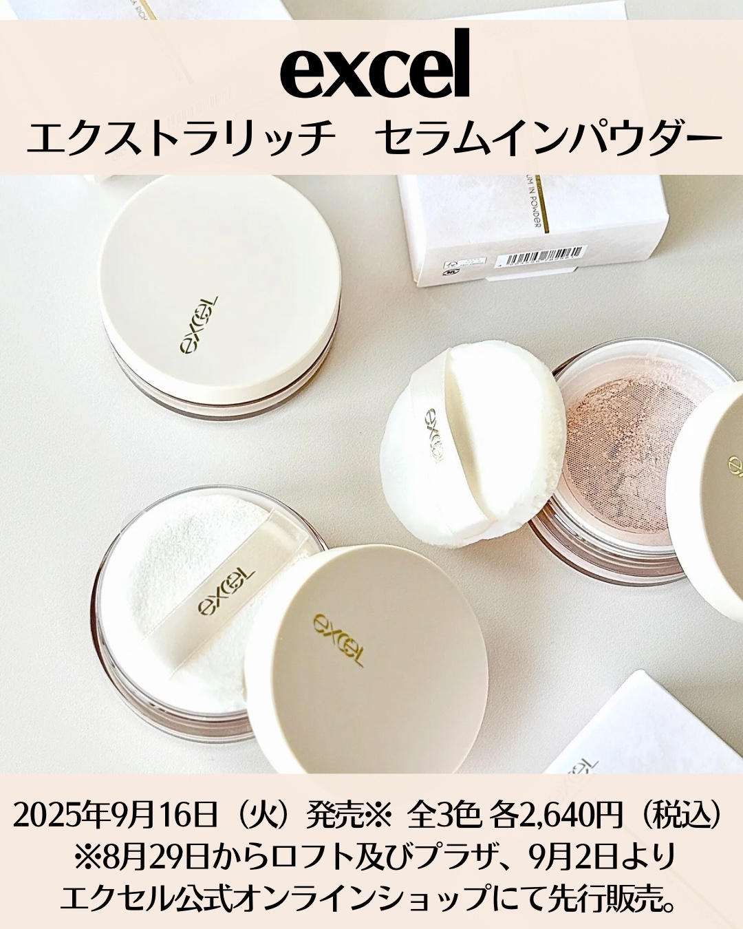 - 触れた瞬間お肌に溶け込むようにとろけて、贅沢うるふわ肌へ 美容液で包み込む、プレミアムなスキンケアパウダー 1. しっとりとお肌に溶け込むように馴染む、美肌パウダー設計。 上質な肌ざわりを叶えます。 ・メルティレア処方(NEW) お肌の上でとろけるようなパウダーで、なめらかでやわらかい仕上がりに。 ・アミノ酸コーティング処方 ベースとなるパウダーをアミノ酸*1でコーティング。お肌にしっとりと密着し、贅沢うるふわ肌に仕上げます。 ・セラミド内包パウダー*2 お肌のうるおいバリアをサポートし、乾燥から守ります。 2. お肌をケアするこだわりの 20 種の美容液成分(保湿)を贅沢配合。 3. 毛穴やお肌の凹凸をカバー。 乾燥・くずれを防いで、透明感*3あふれるようなつけたての美しい仕上がりが続きます。 <EX01 シルキーベージュ> やわらかなセミマット肌に。ピンクパール配合。 <EX02 グロウベージュ> 明るく華やかな印象のツヤ肌に。 7色(ピンク、パープル、ブルー、グリーン、オレンジ、 ゴールド、シルバー)の微細パール配合。 <EX03 シマーピンク> ほんのり血色感をもたらすツヤ肌に。 ピンク&パープルパール配合。 *1 ジラウロイルグルタミン酸リシンNa(保湿) *2 コメヌカスフィンゴ糖脂質、コメヌカ油、シクロデキストリン(すべて保湿) *3 メイクアップ効果 <EX01 シルキーベージュ,EX02 グロウベージュ,EX03 シマーピンク> ◆2025年8月29日からロフト及びプラザ、9月2日よりエクセル公式オンラインショップにて先行販売