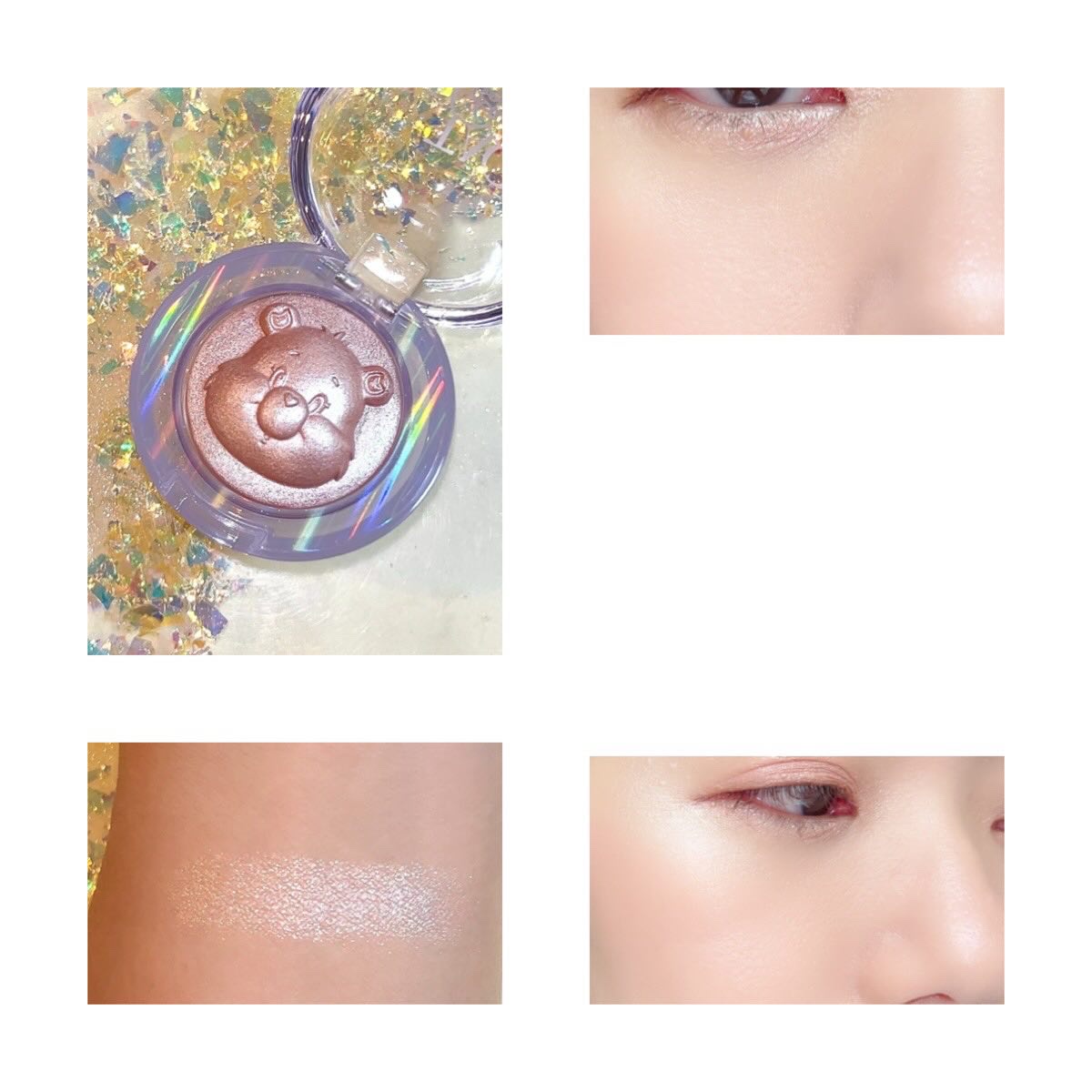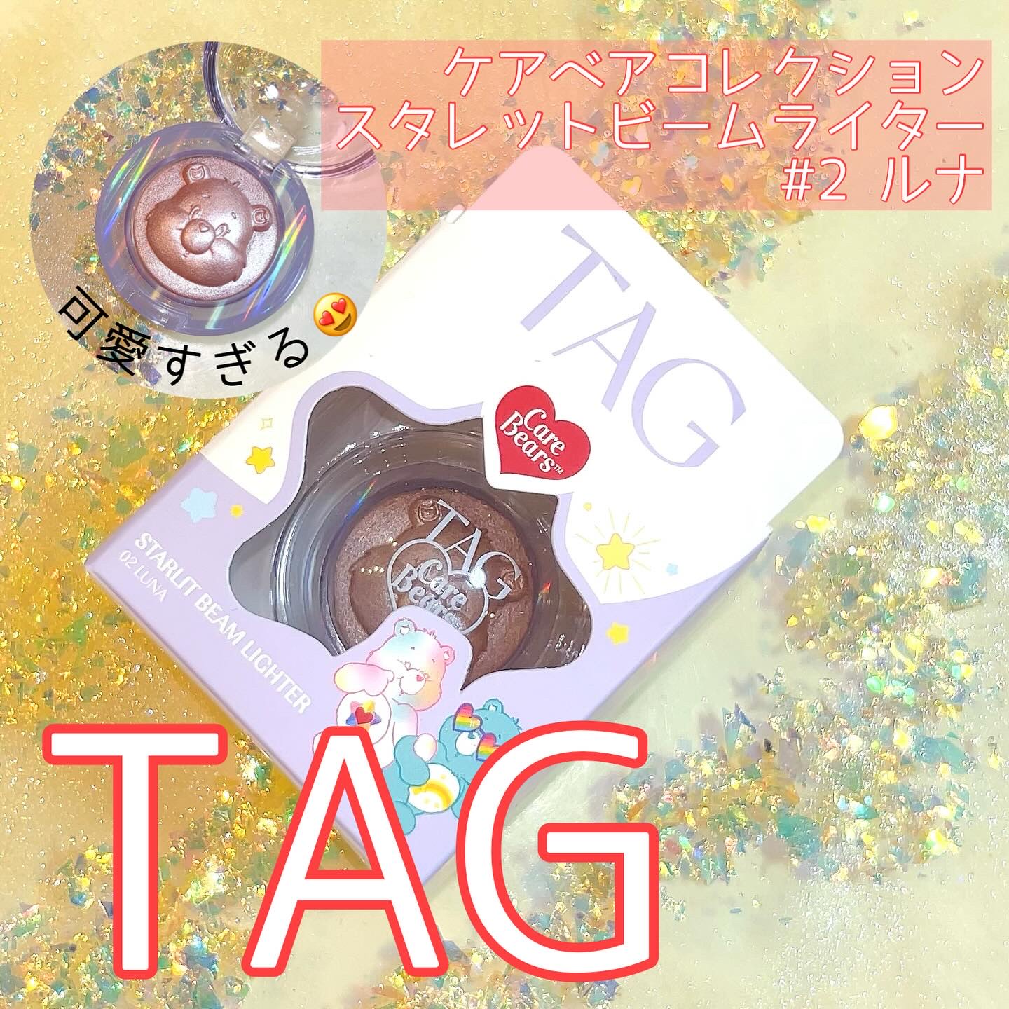 ころんと可愛いクマのラメ🧸🌙✨TAG-StarlitBeamLighterハイライターに刻まれたケアベアのお顔がめちゃめちゃ可愛い🎀ピンクのラメもキラキラ可愛いです⭐︎ポーチに入れて持ち歩きたくなる、まんまるくて可愛い見た目だしアイシャドウと...