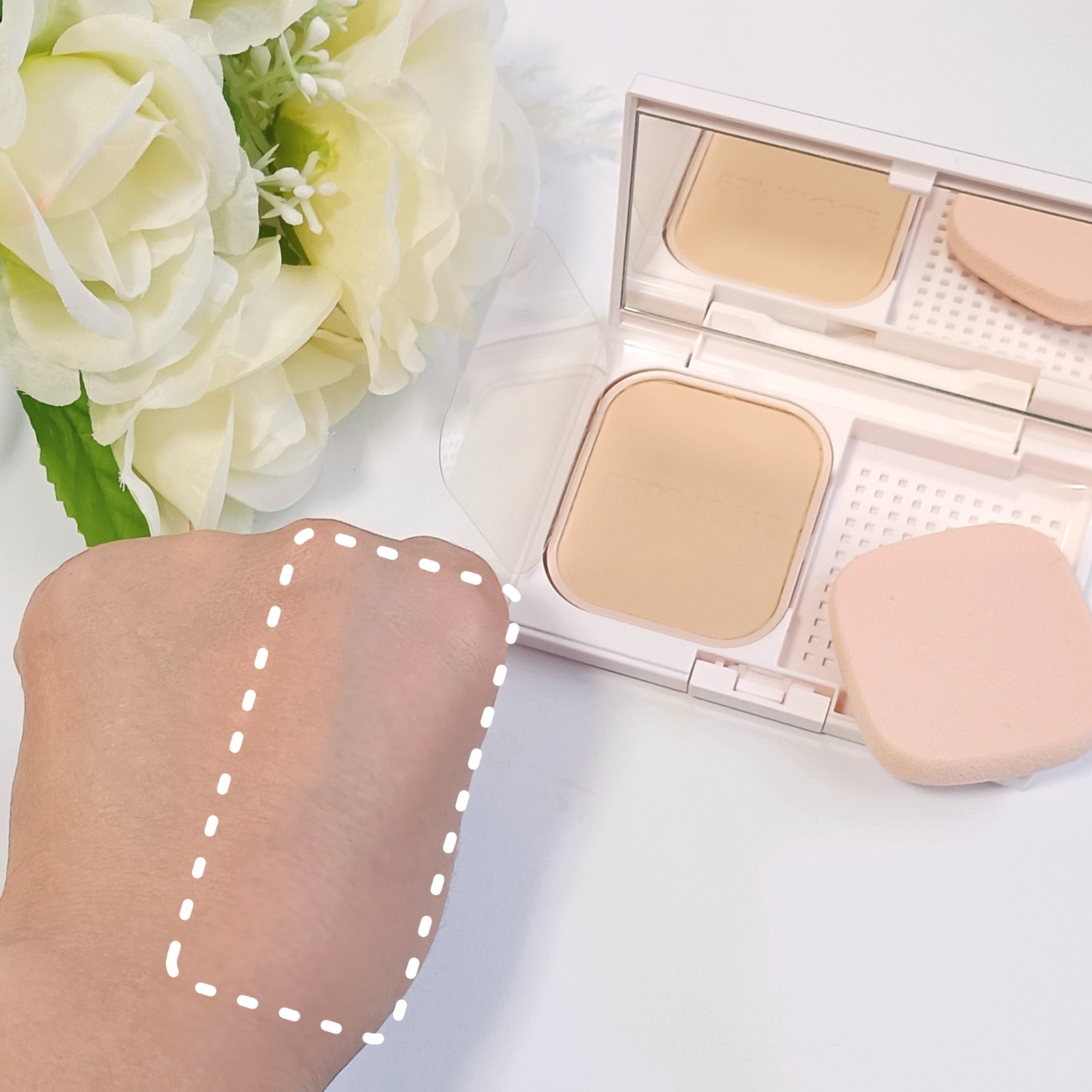 ファンデのカラーは2色展開。 明るめの「01 ナチュラルベージュ」を選択。 普段標準色を使うことが多いワタシで、ちょうどいいくらいかなと感じました。 パフは弾力があって気持ちいい使い心地。 しずく型なので、細かいところを仕上げるのにも使いやすい。 クッションファンデなので、ポンポンと肌にのせていくだけ。 薄づきながら肌悩みをカバーしてくれて、しっとりした使用感。 ポンポンするだけで密着してくれて、簡単にベースメイクが出来ました。 1つで6役なので、下地も日焼け止めも不要の忙しい朝に嬉しいな。 紫外線対策は SPF50+ PA++++ なので、これからの季節も嬉しい。