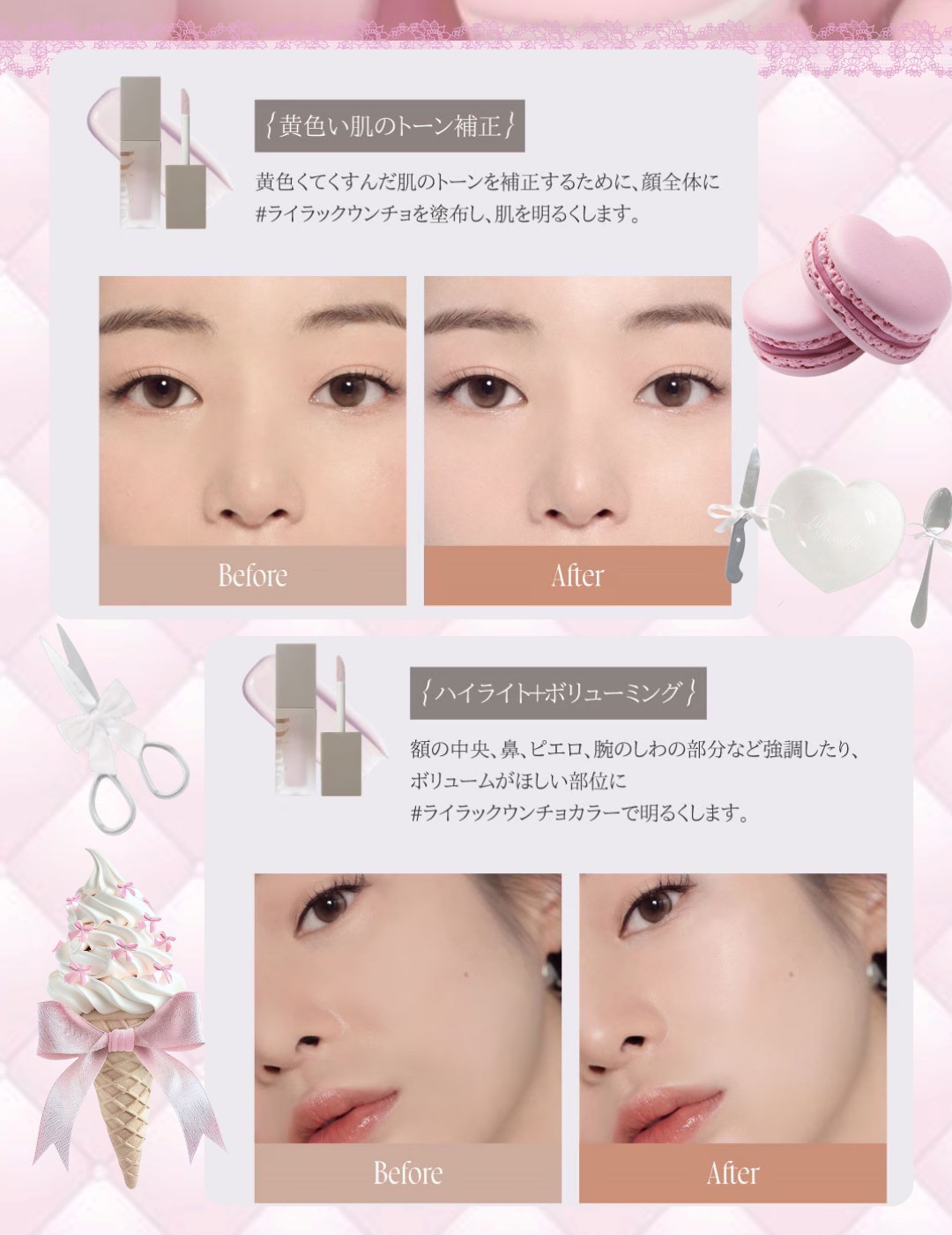- しっとりタイプのトーンコンシーラー、ファンデーション使用前の暗くて均一ではないトーンを整えるためのカラーコレクターです。 使用期間または開封後の使用期間 : 製造日から開封前36ヶ月、開封後12ヶ月 使用時注意事項 : 高温または低温の場所および直射日光の当たる場所には保管しないこと 使用方法 - 隠したい部位や明らかにしたい部位に塗布して塗ります。 - カバーをもっと要する部分にはもう一度伸ばしてください。好きなだけ積み上げても軽い使用感が維持されます。
