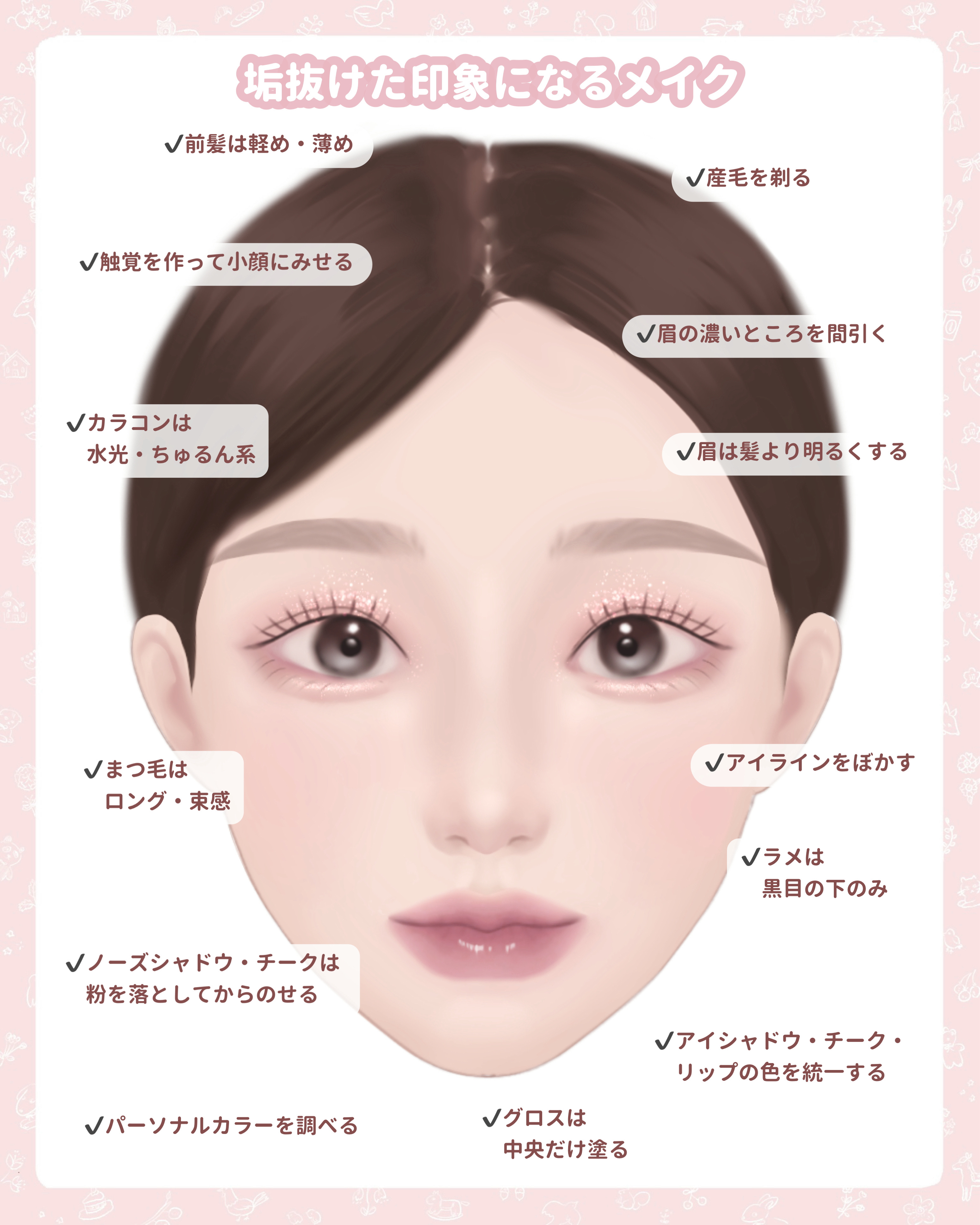 ・涙袋の影の部分まで、ベースを塗ることで縦幅がかなり強調されて丸目にみえる! ・アイシャドウの陰影とラメのハイライト効果で奥まった目に光を取り込んで出目っぽくみせる! ・淡いピンクのアイシャドウ、艶のようなラメ、細くて短いブラックアイラインが特徴 ・つり目を自然にいかせて、美人な雰囲気になれる! ・単色メイクは簡単そうに見えて難しいけど、ブラシを使うと綺麗なグラデーションになる! ・目の形によって中間色をどこまで入れるか変わるけど「目を開けた時に5mm見える」を基準にする