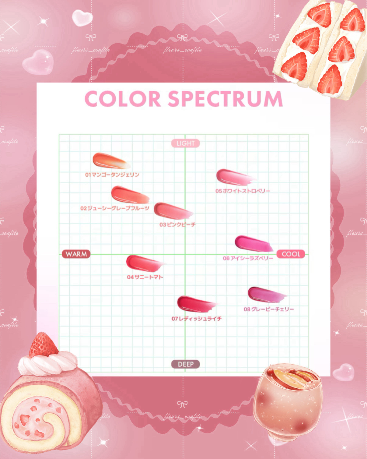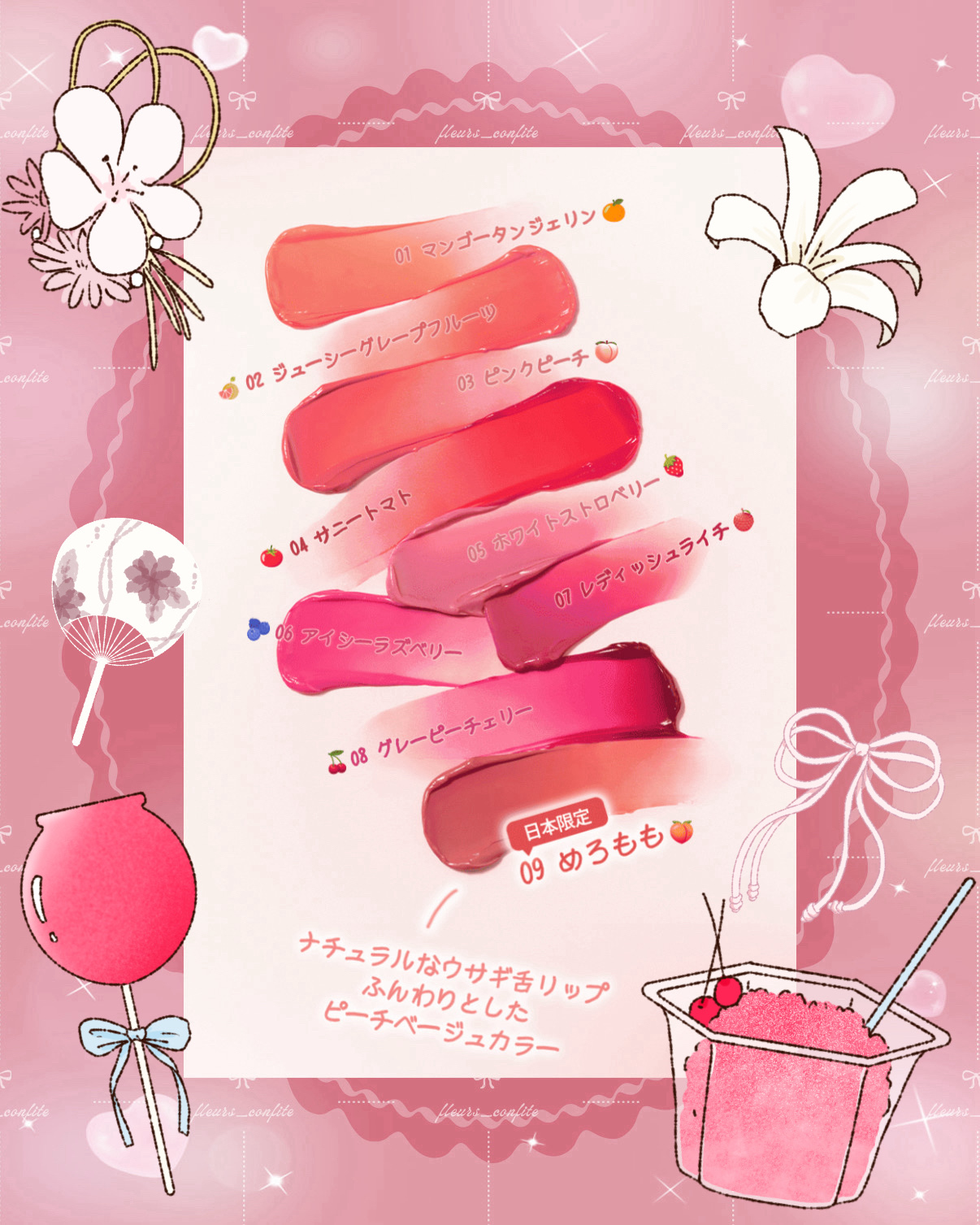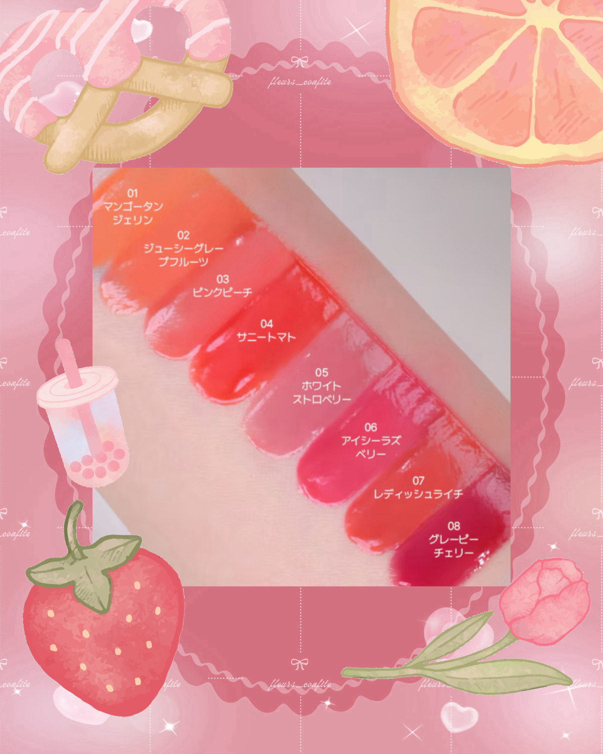 - <01 マンゴータンジェリン> ジメチコン、水、ジメチコンクロスポリマー、ポリソルベート60、セチルPEG/PPG-10/1ジメチコン、ペンチレングリコール、1,2-ヘキサンジオール、グリセリン、アクリレーツクロスポリマー-2-Na、フェノキシエタノール、(アクリル酸ヒドロキシエチル/アクリロイルジメチルタウリンNa)コポリマー、酸化チタン、スクワラン、黄5、香料、エチレンジアミンジコハク酸3Na、イソステアリン酸ソルビタン、水酸化Al、ポリアクリル酸アンモニウム、赤227、赤104(1)、BG <02 ジューシーグレープフルーツ> ジメチコン、水、ジメチコンクロスポリマー、ポリソルベート60、セチルPEG/PPG-10/1ジメチコン、ペンチレングリコール、1,2-ヘキサンジオール、グリセリン、アクリレーツクロスポリマー-2-Na、フェノキシエタノール、(アクリル酸ヒドロキシエチル/アクリロイルジメチルタウリンNa)コポリマー、スクワラン、酸化チタン、香料、黄5、エチレンジアミンジコハク酸3Na、イソステアリン酸ソルビタン、赤104(1)、赤227、水酸化Al、ポリアクリル酸アンモニウム、BG、青1 <03 ピンクピーチ> ジメチコン、水、ジメチコンクロスポリマー、ポリソルベート60、セチルPEG/PPG-10/1ジメチコン、ペンチレングリコール、1,2-ヘキサンジオール、グリセリン、アクリレーツクロスポリマー-2-Na、フェノキシエタノール、(アクリル酸ヒドロキシエチル/アクリロイルジメチルタウリンNa)コポリマー、スクワラン、酸化チタン、香料、黄5、エチレンジアミンジコハク酸3Na、赤104(1)、イソステアリン酸ソルビタン、赤227、水酸化Al、ポリアクリル酸アンモニウム、青1、BG <04 サニートマト> ジメチコン、水、ジメチコンクロスポリマー、ポリソルベート60、セチルPEG/PPG-10/1ジメチコン、ペンチレングリコール、1,2-ヘキサンジオール、グリセリン、アクリレーツクロスポリマー-2-Na、フェノキシエタノール、(アクリル酸ヒドロキシエチル/アクリロイルジメチルタウリンNa)コポリマー、スクワラン、香料、黄5、エチレンジアミンジコハク酸3Na、赤227、イソステアリン酸ソルビタン、赤104(1) <05 ホワイトストロベリー> ジメチコン、水、ジメチコンクロスポリマー、ポリソルベート60、セチルPEG/PPG-10/1ジメチコン、ペンチレングリコール、1,2-ヘキサンジオール、グリセリン、アクリレーツクロスポリマー-2-Na、フェノキシエタノール、(アクリル酸ヒドロキシエチル/アクリロイルジメチルタウリンNa)コポリマー、スクワラン、酸化チタン、香料、エチレンジアミンジコハク酸3Na、黄5、赤227、イソステアリン酸ソルビタン、赤104(1)、水酸化Al、ポリアクリル酸アンモニウム、BG、青1 <06 アイシーラズベリー> ジメチコン、水、ジメチコンクロスポリマー、ポリソルベート60、セチルPEG/PPG-10/1ジメチコン、ペンチレングリコール、1,2-ヘキサンジオール、グリセリン、アクリレーツクロスポリマー-2-Na、フェノキシエタノール、(アクリル酸ヒドロキシエチル/アクリロイルジメチルタウリンNa)コポリマー、スクワラン、酸化チタン、香料、エチレンジアミンジコハク酸3Na、赤227、黄5、イソステアリン酸ソルビタン、赤104(1)、水酸化Al、ポリアクリル酸アンモニウム、BG <07 レディッシュライチ> ジメチコン、水、ジメチコンクロスポリマー、ポリソルベート60、セチルPEG/PPG-10/1ジメチコン、ペンチレングリコール、1,2-ヘキサンジオール、グリセリン、アクリレーツクロスポリマー-2-Na、フェノキシエタノール、(アクリル酸ヒドロキシエチル/アクリロイルジメチルタウリンNa)コポリマー、スクワラン、酸化チタン、香料、黄5、エチレンジアミンジコハク酸3Na、赤227、赤104(1)、イソステアリン酸ソルビタン、水酸化Al、ポリアクリル酸アンモニウム、BG、青1 <08 グレーピーチェリー> ジメチコン、水、ジメチコンクロスポリマー、ポリソルベート60、セチルPEG/PPG-10/1ジメチコン、ペンチレングリコール、1,2-ヘキサンジオール、グリセリン、アクリレーツクロスポリマー-2-Na、フェノキシエタノール、(アクリル酸ヒドロキシエチル/アクリロイルジメチルタウリンNa)コポリマー、スクワラン、香料、エチレンジアミンジコハク酸3Na、赤227、黄5、イソステアリン酸ソルビタン、青1 <09 めろもも(日本限定)> ジメチコン、水、ジメチコンクロスポリマー、ポリソルベート60、セチルPEG/PPG-10/1ジメチコン、ペンチレングリコール、1,2-ヘキサンジオール、グリセリン、アクリレーツクロスポリマー-2-Na、フェノキシエタノール、(アクリル酸ヒドロキシエチル/アクリロイルジメチルタウリンNa)コポリマー、酸化チタン、スクワラン、黄5、香料、エチレンジアミンジコハク酸3Na、赤104(1)、赤227、イソステアリン酸ソルビタン、水酸化Al、ポリアクリル酸アンモニウム、青1、BG
