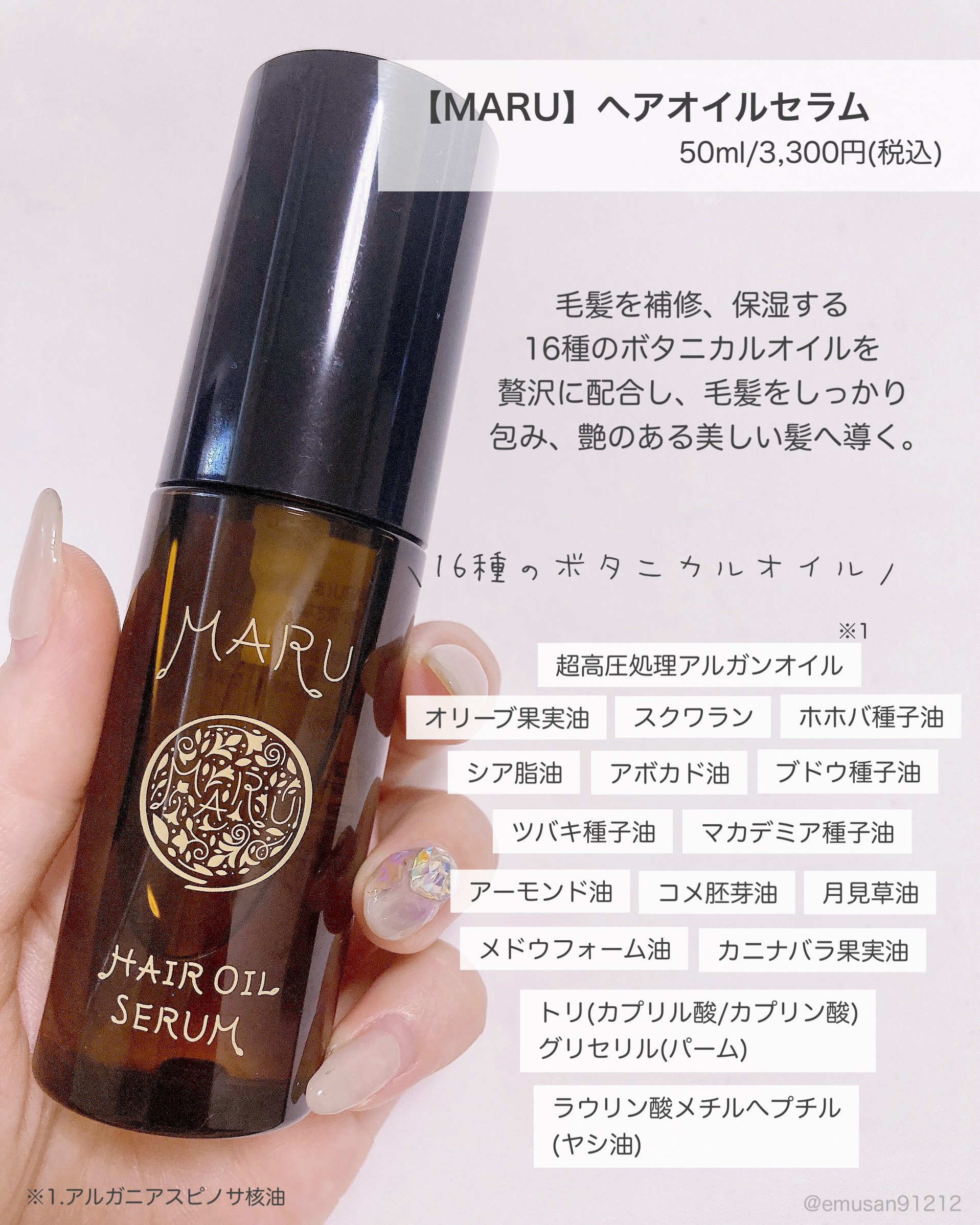MARUヘアオイルセラム@maru_official.haircare様よりお試しさせていただきました✨☑︎10種類の合成化学成分他を不使用合成香料や鉱物油など10種類の合成化学成分を含む添加物不使用🧚☑︎16種のボタニカルオイル配合超高圧処...