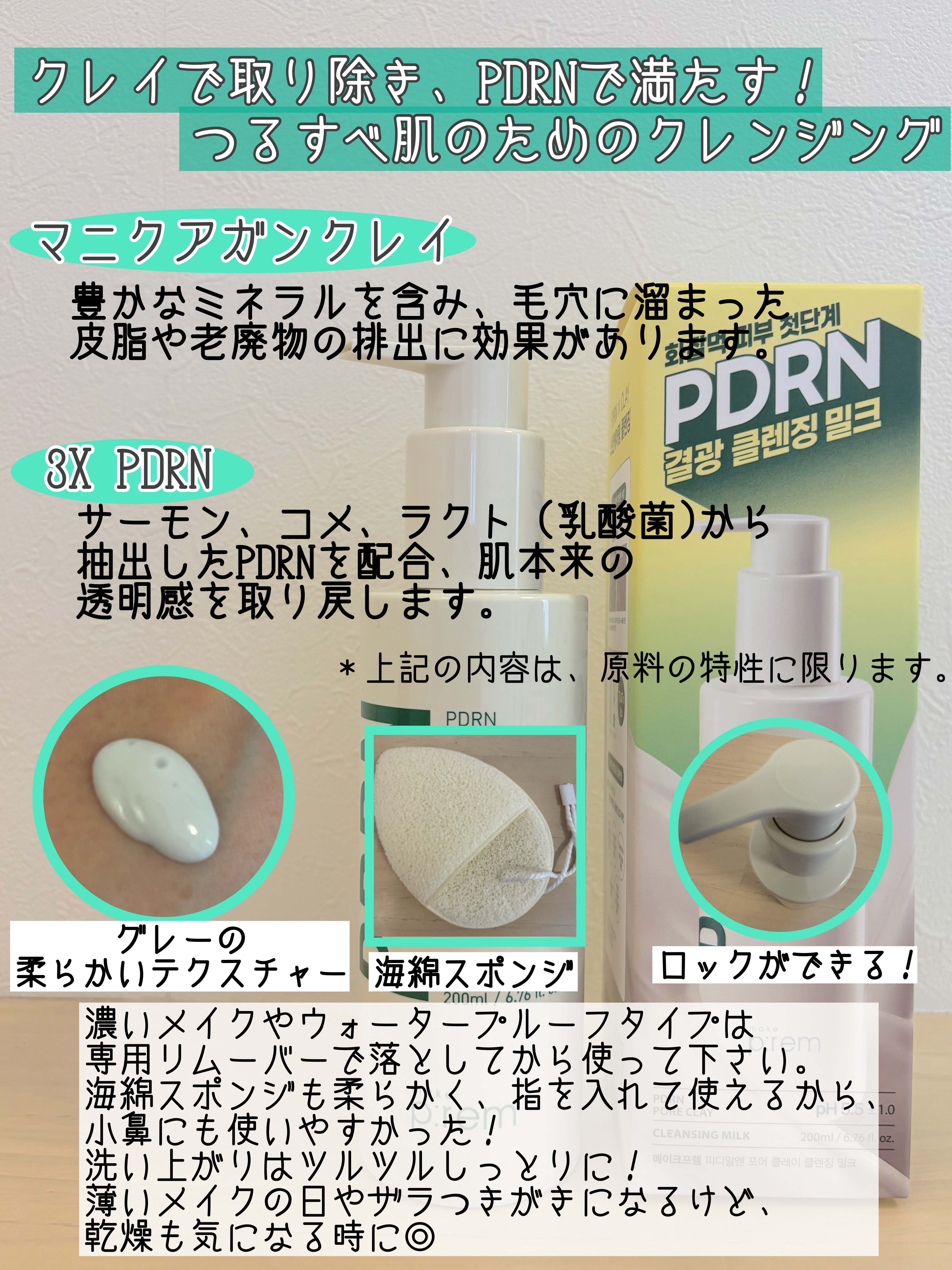 - PDRN107.5ppm*1とクレイ*2配合で、毛穴の汚れまでスッキリ洗浄。 洗顔後は透明感となめらかさあふれる肌へ導く、スキンケア発想のクレンジングミルク。 *1保湿成分 *2洗浄成分