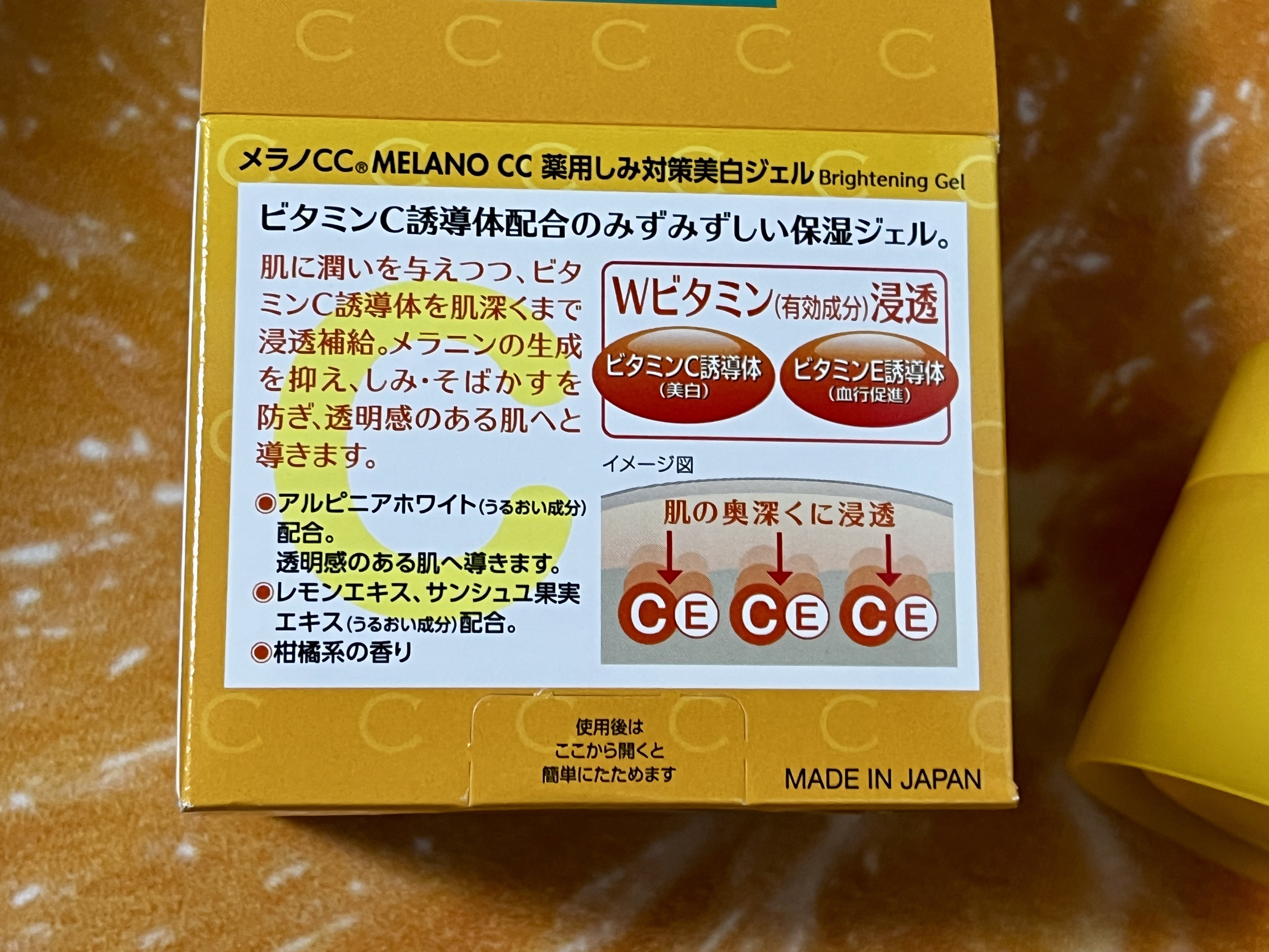 - 「メラノCC 薬用しみ対策美白ジェル」は、有効成分ビタミンC誘導体※1配合のみずみずしい保湿ジェル。 肌に潤いを与えつつ、ビタミンC誘導体を角質層の奥深くまで浸透補給。メラニンの生成を抑え、しみ・そばかすを防ぎ、透明感のある肌へと導きます。 整肌成分「ビタミンE誘導体※2」・抗炎症成分「グリチルリチン酸ジカリウム」も配合。気になるニキビもしっかり予防します。さらに、うるおい成分「アルピニアホワイト※3」も配合。ニキビ痕が気になる肌にもうるおいを与えて肌を整えます。 化粧水や美容液などの後、うるおいを補給したい時に乳液やクリーム代わりとしてお使いいただけます。また、紫外線を浴びてしまったボディへの使用もオススメです。朝晩のお手入れにどうぞ。 柑橘系の香り。 ※1:L-アスコルビン酸2-グルコシド ※2:トコフェロール酢酸エステル ※3:アルピニアカツマダイ種子エキス