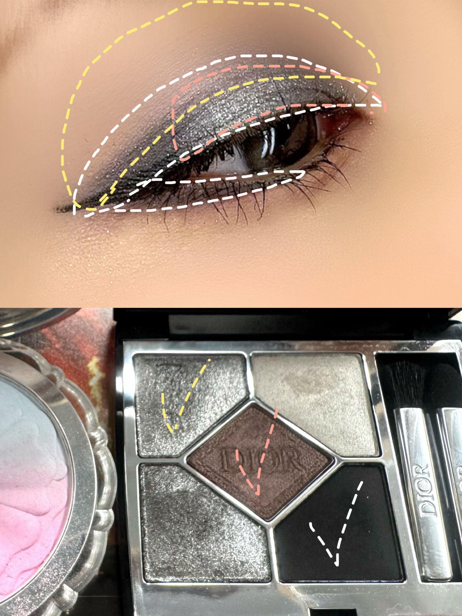 ピエドプールのブラックをメインに使って細めのヘイロー&強めなアイラインメイク🖤 アイホール上と下瞼全体に使ったピンクのアイシャドウは別のパレットから使ってるけどどのパレットか忘れました😖 Diorディオールショウ サンク クルール 073ピエ・ド・プール