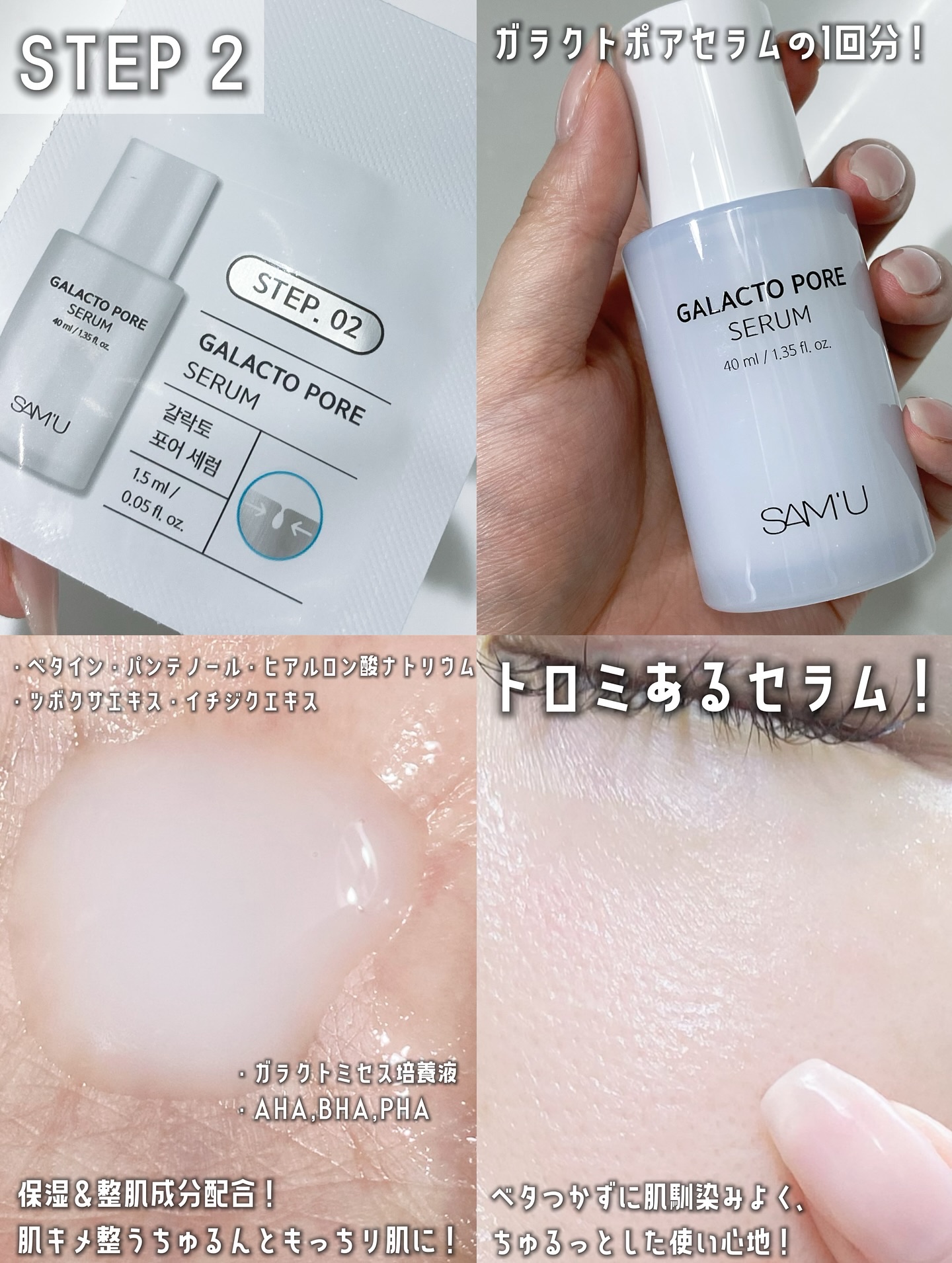 - うるおい成分たっぷりのバイオセルロースマスクが肌に密着し、肌をなめらかに整えます。 さらにセラムがうるおいをプラスし、なめらかでもちもちとした肌印象へ導く2ステップスペシャルケアセット ガラクトシリーズより登場したスペシャルケアマスク! こだわりの2ステップケアで毛穴ケア+保湿効果のダブルケア。 果物や植物発酵エキスで作られた密着性の高い自然由来のやわらかバイオセルロースシートが肌にピタッと密着し毛穴に詰まった汚れを柔らかくしシートマスクへ吸着させることで角質除去と肌のキメを整えます。 さらにスペシャル毛穴ケアの仕上げとして毛穴ケアガラクトポアセラムで保湿、ハリケアや肌のキメを整え、毛穴を目立ちにくく肌をなめらかに整えます。