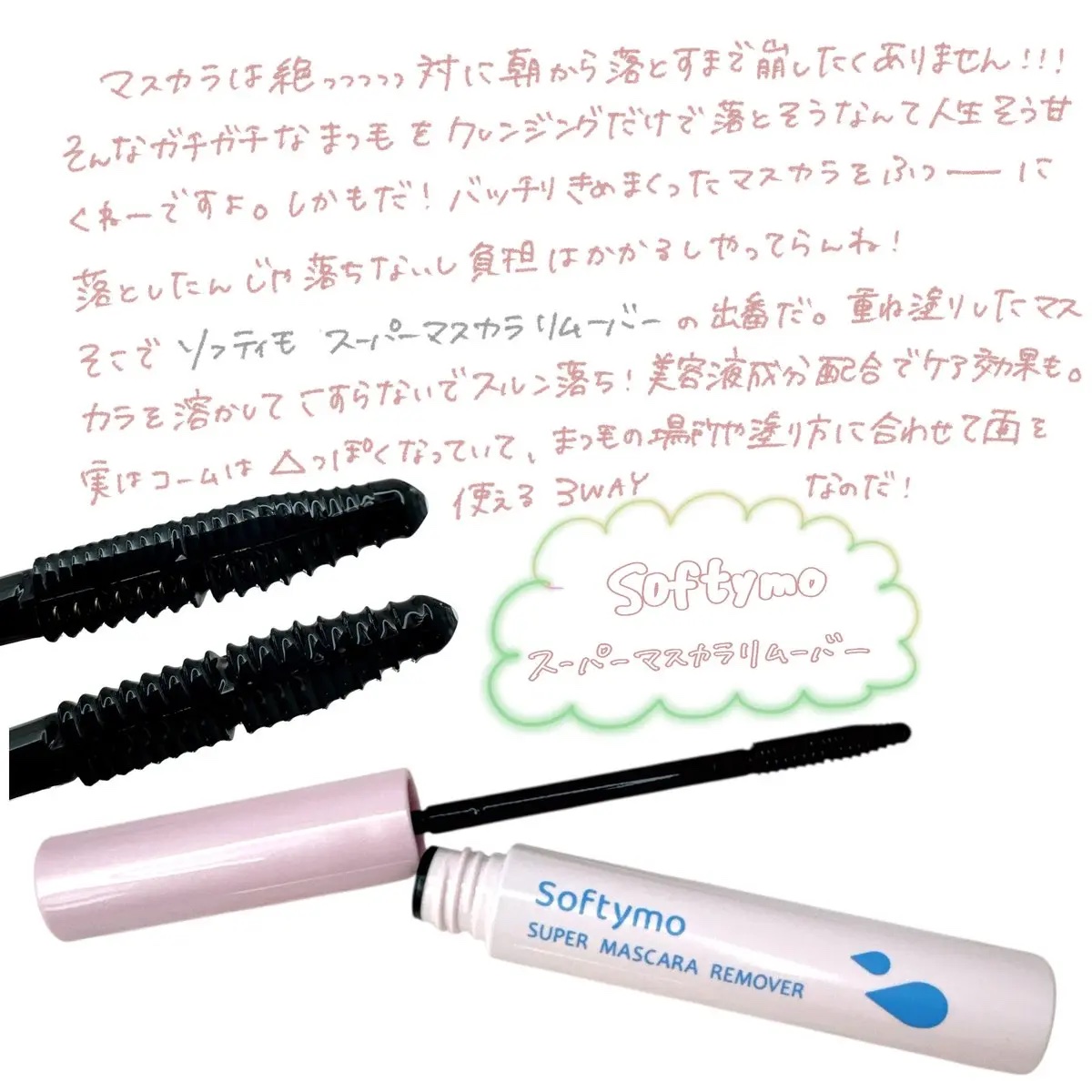 #PR#ソフティモ\強力マスカラもとろけてスルン!/ソフティモスーパーマスカラリムーバー重ね塗りしたウォータープルーフマスカラもこすらずスルン✨どんなまつ毛にもフィットする3WAYコームがとっても塗りやすい👍✨塗った後コットンでオフしてるよ✯...