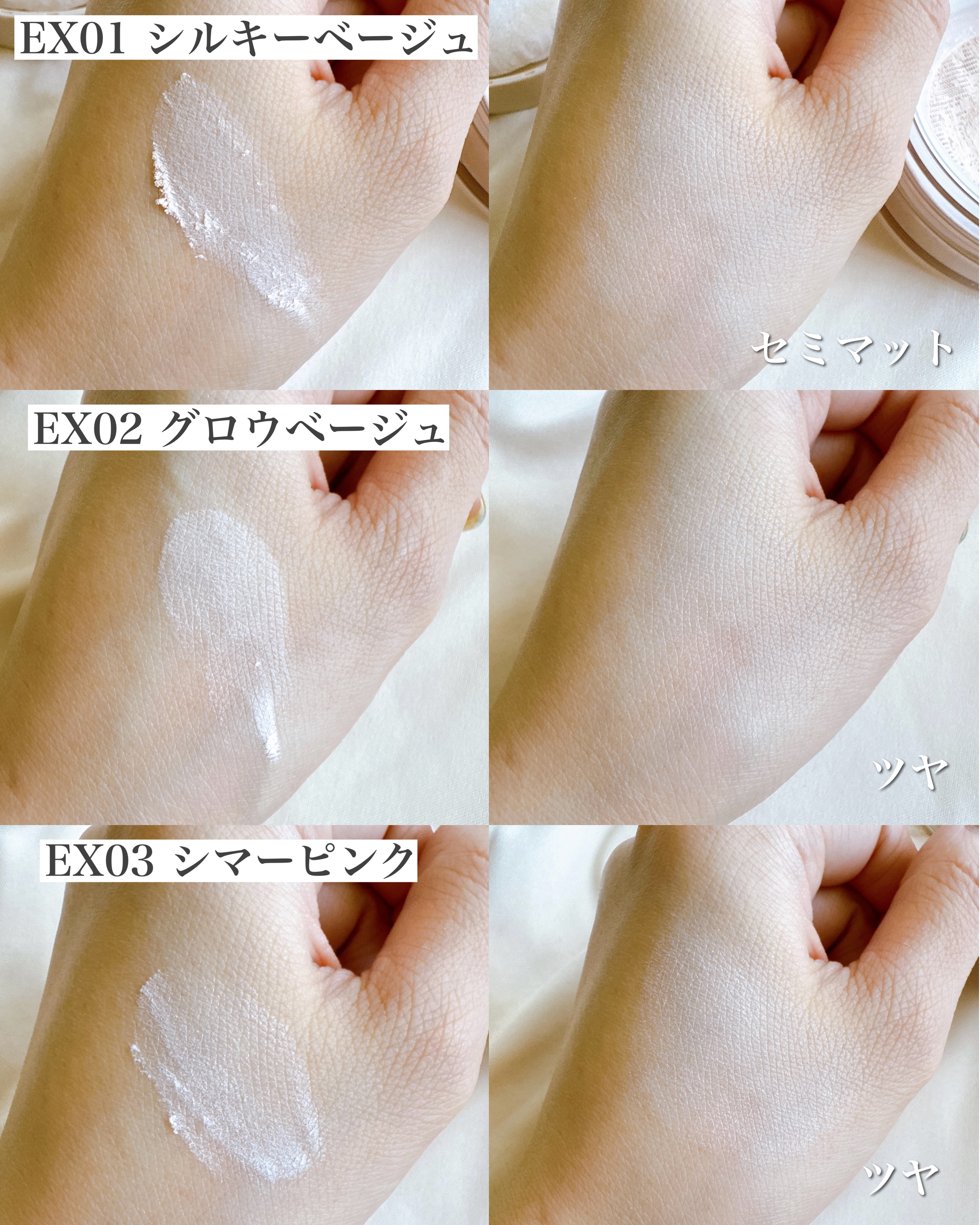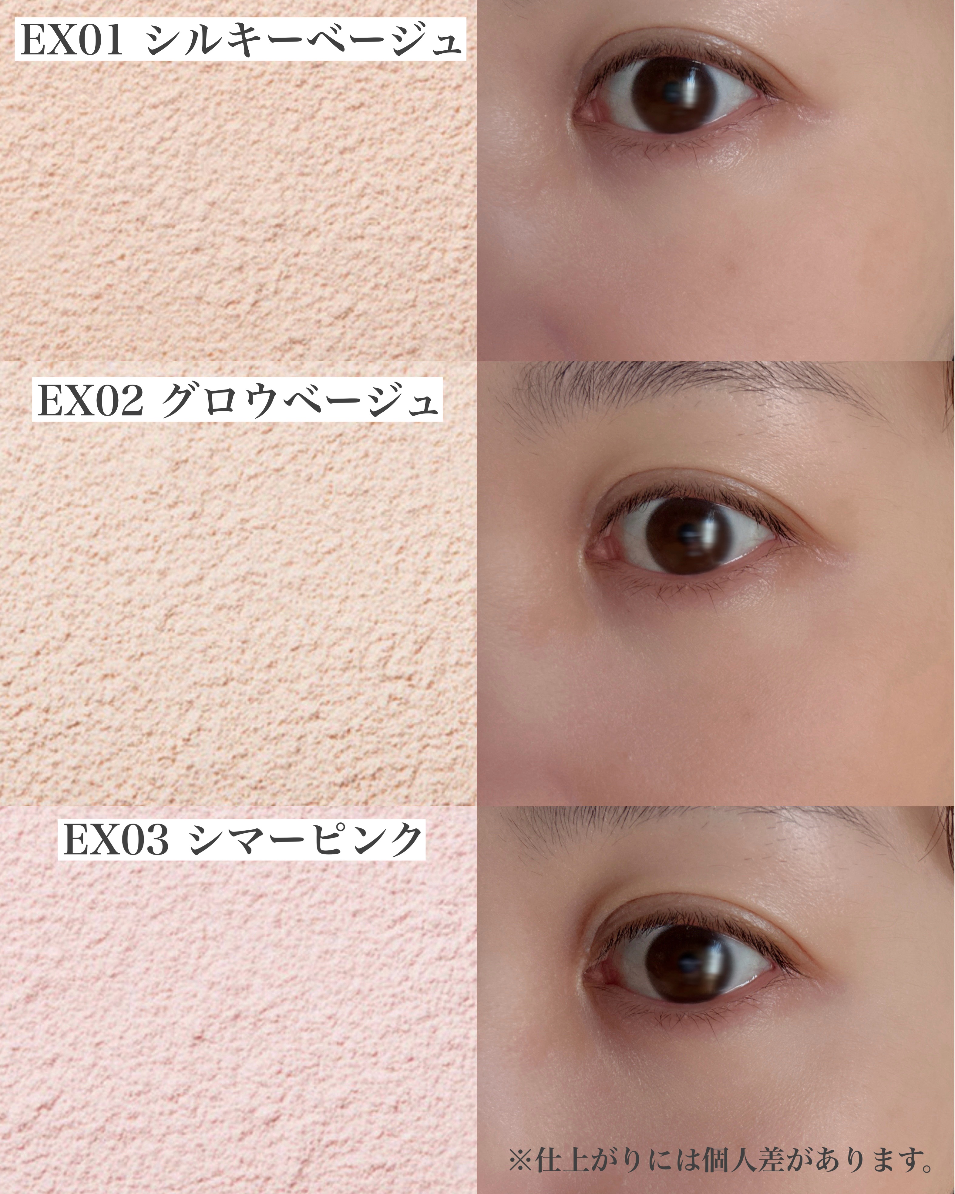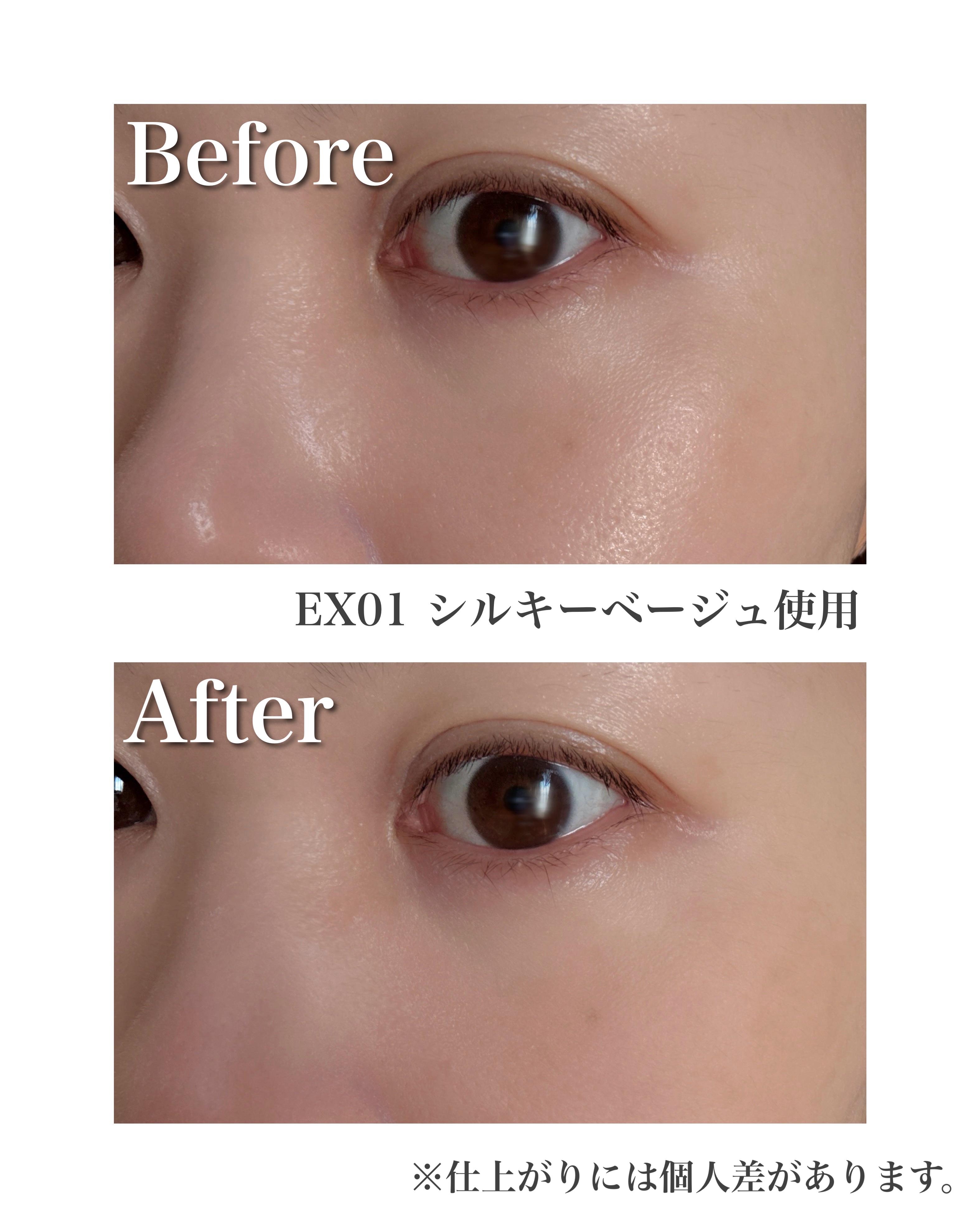 - <EX01 シルキーベージュ> (ビニルジメチコン/メチコンシルセスキオキサン)クロスポリマー、窒化ホウ素、ラウリン酸亜鉛、シリカ、ジラウロイルグルタミン酸リシンNa、塩化Mg、コメヌカスフィンゴ糖脂質、コメヌカ油、シクロデキストリン、ナイロン-12、シルク、オクテニルコハク酸デンプンAl、ジメチコン、合成フルオロフロゴパイト、酸化スズ、シア脂、硫酸Ca水和物、セチルPGヒドロキシエチルパルミタミド、水酸化Al、ハイドロゲンジメチコン、ナイアシンアミド、パルミチン酸アスコルビルリン酸3Na、セラミドEOP、セラミドNG、セラミドNP、セラミドAP、ジペプチド-15、アゼロイルジグリシンK、ノイバラ果実エキス、エクトイン、パンテノール、アラントイン、グリチルレチン酸ステアリル、ツボクサエキス、ピリドキシンHCl、トコフェリルリン酸Na、ポリクオタニウム-51、スイゼンジノリ細胞外多糖体、シロキクラゲ多糖体、(HDI/トリメチロールヘキシルラクトン)クロスポリマー、1,2-ヘキサンジオール、BG、エチルヘキシルグリセリン、ジステアリン酸Al、ステアロイルグルタミン酸2Na、セバシン酸イソステアリル、トコフェロール、トリ(カプリル酸/カプリン酸)グリセリル、ヒドロキシアパタイト、フィトステロールズ、メチコン、ラウロイルリシン、水、水添レシチン、野菜油、フェノキシエタノール、メチルパラベン、(+/-)カオリン、グンジョウ、タルク、マイカ、酸化チタン、酸化亜鉛、酸化鉄 <EX02 グロウベージュ> (ビニルジメチコン/メチコンシルセスキオキサン)クロスポリマー、窒化ホウ素、ラウリン酸亜鉛、シリカ、ジラウロイルグルタミン酸リシンNa、塩化Mg、コメヌカスフィンゴ糖脂質、コメヌカ油、シクロデキストリン、ナイロン-12、シルク、オクテニルコハク酸デンプンAl、ジメチコン、合成フルオロフロゴパイト、酸化スズ、シア脂、硫酸Ca水和物、セチルPGヒドロキシエチルパルミタミド、水酸化Al、ハイドロゲンジメチコン、ナイアシンアミド、パルミチン酸アスコルビルリン酸3Na、セラミドEOP、セラミドNG、セラミドNP、セラミドAP、ジペプチド-15、アゼロイルジグリシンK、ノイバラ果実エキス、エクトイン、パンテノール、アラントイン、グリチルレチン酸ステアリル、ツボクサエキス、ピリドキシンHCl、トコフェリルリン酸Na、ポリクオタニウム-51、スイゼンジノリ細胞外多糖体、シロキクラゲ多糖体、(HDI/トリメチロールヘキシルラクトン)クロスポリマー、1,2-ヘキサンジオール、BG、エチルヘキシルグリセリン、ジステアリン酸Al、ステアロイルグルタミン酸2Na、セバシン酸イソステアリル、トコフェロール、トリ(カプリル酸/カプリン酸)グリセリル、ヒドロキシアパタイト、フィトステロールズ、メチコン、ラウロイルリシン、水、水添レシチン、野菜油、フェノキシエタノール、メチルパラベン、(+/-)カオリン、グンジョウ、タルク、マイカ、酸化チタン、酸化亜鉛、酸化鉄 <EX03 シマーピンク> (ビニルジメチコン/メチコンシルセスキオキサン)クロスポリマー、窒化ホウ素、ラウリン酸亜鉛、シリカ、ジラウロイルグルタミン酸リシンNa、塩化Mg、コメヌカスフィンゴ糖脂質、コメヌカ油、シクロデキストリン、ナイロン-12、シルク、オクテニルコハク酸デンプンAl、ジメチコン、合成フルオロフロゴパイト、酸化スズ、シア脂、硫酸Ca水和物、セチルPGヒドロキシエチルパルミタミド、水酸化Al、ハイドロゲンジメチコン、ナイアシンアミド、パルミチン酸アスコルビルリン酸3Na、セラミドEOP、セラミドNG、セラミドNP、セラミドAP、ジペプチド-15、アゼロイルジグリシンK、ノイバラ果実エキス、エクトイン、パンテノール、アラントイン、グリチルレチン酸ステアリル、ツボクサエキス、ピリドキシンHCl、トコフェリルリン酸Na、ポリクオタニウム-51、スイゼンジノリ細胞外多糖体、シロキクラゲ多糖体、(HDI/トリメチロールヘキシルラクトン)クロスポリマー、1,2-ヘキサンジオール、BG、エチルヘキシルグリセリン、ジステアリン酸Al、ステアロイルグルタミン酸2Na、セバシン酸イソステアリル、トコフェロール、トリ(カプリル酸/カプリン酸)グリセリル、ヒドロキシアパタイト、フィトステロールズ、メチコン、ラウロイルリシン、水、水添レシチン、野菜油、フェノキシエタノール、メチルパラベン、(+/-)カオリン、グンジョウ、タルク、マイカ、酸化チタン、酸化亜鉛、酸化鉄 <EX04 シマ―ラベンダー(限定)> (ビニルジメチコン/メチコンシルセスキオキサン)クロスポリマー、窒化ホウ素、ラウリン酸亜鉛、シリカ、ジラウロイルグルタミン酸リシンNa、塩化Mg、コメヌカスフィンゴ糖脂質、コメヌカ油、シクロデキストリン、ナイロン-12、シルク、オクテニルコハク酸デンプンAl、ジメチコン、合成フルオロフロゴパイト、酸化スズ、シア脂、硫酸Ca水和物、セチルPGヒドロキシエチルパルミタミド、水酸化Al、ハイドロゲンジメチコン、ナイアシンアミド、パルミチン酸アスコルビルリン酸3Na、セラミ