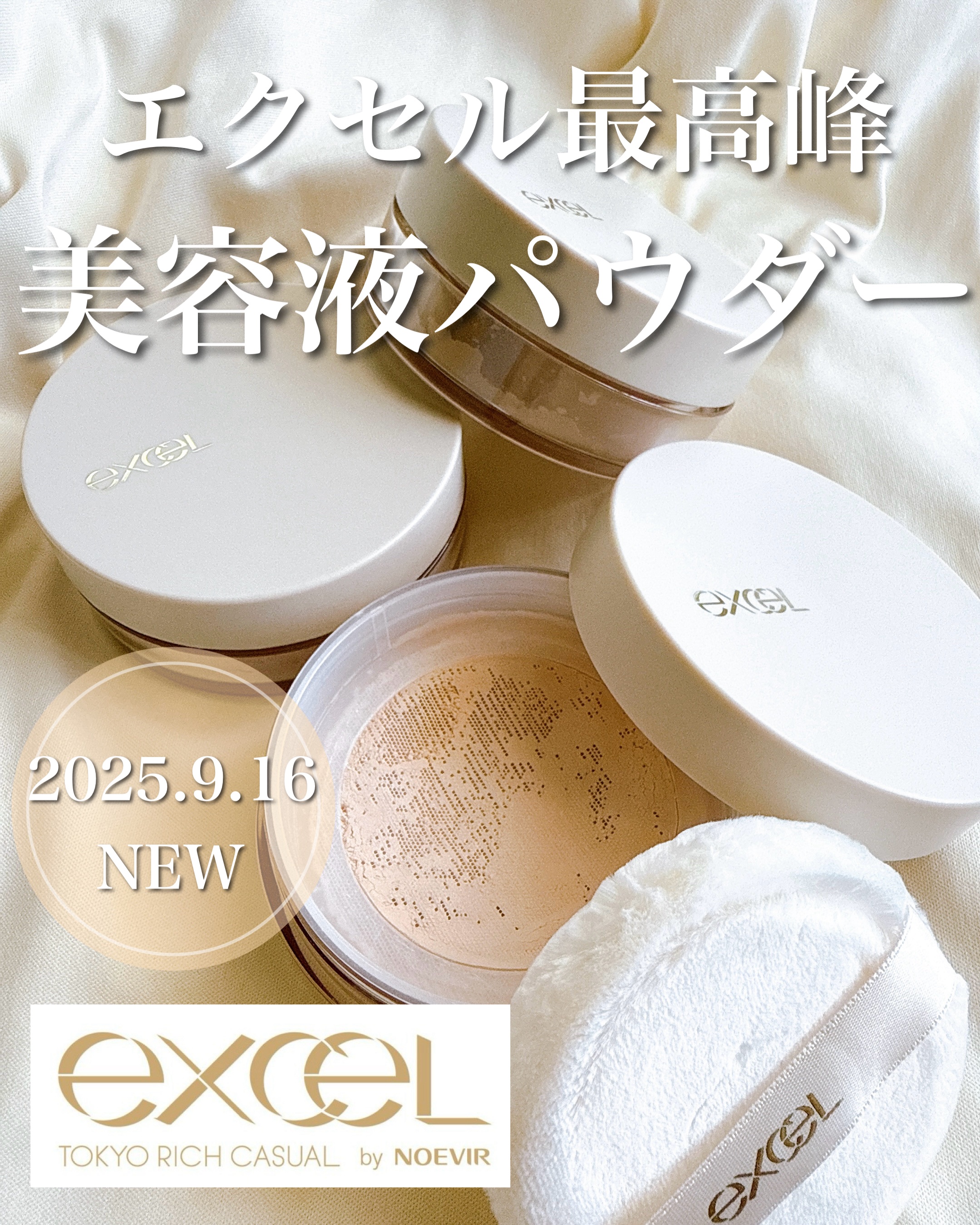 - 触れた瞬間お肌に溶け込むようにとろけて、贅沢うるふわ肌へ 美容液で包み込む、プレミアムなスキンケアパウダー 1. しっとりとお肌に溶け込むように馴染む、美肌パウダー設計。 上質な肌ざわりを叶えます。 ・メルティレア処方(NEW) お肌の上でとろけるようなパウダーで、なめらかでやわらかい仕上がりに。 ・アミノ酸コーティング処方 ベースとなるパウダーをアミノ酸*1でコーティング。お肌にしっとりと密着し、贅沢うるふわ肌に仕上げます。 ・セラミド内包パウダー*2 お肌のうるおいバリアをサポートし、乾燥から守ります。 2. お肌をケアするこだわりの 20 種の美容液成分(保湿)を贅沢配合。 3. 毛穴やお肌の凹凸をカバー。 乾燥・くずれを防いで、透明感*3あふれるようなつけたての美しい仕上がりが続きます。 <EX01 シルキーベージュ> やわらかなセミマット肌に。ピンクパール配合。 <EX02 グロウベージュ> 明るく華やかな印象のツヤ肌に。 7色(ピンク、パープル、ブルー、グリーン、オレンジ、 ゴールド、シルバー)の微細パール配合。 <EX03 シマーピンク> ほんのり血色感をもたらすツヤ肌に。 ピンク&パープルパール配合。 *1 ジラウロイルグルタミン酸リシンNa(保湿) *2 コメヌカスフィンゴ糖脂質、コメヌカ油、シクロデキストリン(すべて保湿) *3 メイクアップ効果 <EX01 シルキーベージュ,EX02 グロウベージュ,EX03 シマーピンク> ◆2025年8月29日からロフト及びプラザ、9月2日よりエクセル公式オンラインショップにて先行販売