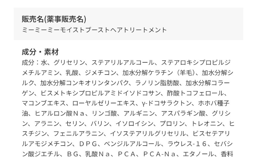 - <シャンプー> 水、ココイルメチルタウリンNa、ラウロイルメチルアラニンNa、コカミドメチルMEA、ココアンホ酢酸Na、ラウラミドプロピルベタイン、ラウレス-11カルボン酸、ラウレス-23、ラウロイル加水分解シルクNa、加水分解ケラチン(羊毛)、加水分解シルク、加水分解コンキオリンタンパク、ラノリン脂肪酸、グリセリン、加水分解コラーゲン、ラウロイルサルコシンTEA、ビスメトキシプロピルアミドイソドコサン、酢酸トコフェロール、マコンブエキス、ローヤルゼリーエキス、γ-ドコサラクトン、ホホバ種子油、ヒアルロン酸Na、リンゴ酸、アルギニン、アスパラギン酸、グリシン、アラニン、セリン、バリン、イソロイシン、プロリン、トレオニン、ヒスチジン、フェニルアラニン、乳酸、乳酸Na、オレイン酸PEG-6ソルビタン、ポリクオタニウム-10、ベンジルアルコール、PPG-2コカミド、トリイソステアリン酸PEG-160ソルビタン、安息香酸Na、エチルヘキシルグリセリン、PPG-3カプリリルエーテル、水酸化Na、クエン酸、ラウレス-16、ポリクオタニウム-52、PPG-2ヒドロキシプロピルトリモニウムセルロース、DPG、ステアロキシプロピルジメチルアミン、グリチルリチン酸2K、EDTA-2Na、セバシン酸ジエチル、BG、ステアリルアルコール、PCA、PCA-Na、エタノール、フェノキシエタノール、香料 <トリートメント> 水、グリセリン、ステアリルアルコール、ステアロキシプロピルジメチルアミン、乳酸、ジメチコン、加水分解ケラチン(羊毛)、加水分解シルク、加水分解コンキオリンタンパク、ラノリン脂肪酸、加水分解コラーゲン、ビスメトキシプロピルアミドイソドコサン、酢酸トコフェロール、マコンブエキス、ローヤルゼリーエキス、γ-ドコサラクトン、ホホバ種子油、ヒアルロン酸Na、リンゴ酸、アルギニン、アスパラギン酸、グリシン、アラニン、セリン、バリン、イソロイシン、プロリン、トレオニン、ヒスチジン、フェニルアラニン、イソステアリルグリセリル、ビスセテアリルアモジメチコン、DPG、ベンジルアルコール、ラウレス-16、セバシン酸ジエチル、BG、乳酸Na、PCA、PCA-Na、エタノール、香料 <シャンプー つめかえ用> 水、ココイルメチルタウリンNa、ラウロイルメチルアラニンNa、コカミドメチルMEA、ココアンホ酢酸Na、ラウラミドプロピルベタイン、ラウレス-11カルボン酸、ラウレス-23、ラウロイル加水分解シルクNa、加水分解ケラチン(羊毛)、加水分解シルク、加水分解コンキオリンタンパク、ラノリン脂肪酸、グリセリン、加水分解コラーゲン、ラウロイルサルコシンTEA、ビスメトキシプロピルアミドイソドコサン、酢酸トコフェロール、マコンブエキス、ローヤルゼリーエキス、γ-ドコサラクトン、ホホバ種子油、ヒアルロン酸Na、リンゴ酸、アルギニン、アスパラギン酸、グリシン、アラニン、セリン、バリン、イソロイシン、プロリン、トレオニン、ヒスチジン、フェニルアラニン、乳酸、乳酸Na、オレイン酸PEG-6ソルビタン、ポリクオタニウム-10、ベンジルアルコール、PPG-2コカミド、トリイソステアリン酸PEG-160ソルビタン、安息香酸Na、エチルヘキシルグリセリン、PPG-3カプリリルエーテル、水酸化Na、クエン酸、ラウレス-16、ポリクオタニウム-52、PPG-2ヒドロキシプロピルトリモニウムセルロース、DPG、ステアロキシプロピルジメチルアミン、グリチルリチン酸2K、EDTA-2Na、セバシン酸ジエチル、BG、ステアリルアルコール、PCA、PCA-Na、エタノール、フェノキシエタノール、香料 <トリートメント つめかえ用> 水、グリセリン、ステアリルアルコール、ステアロキシプロピルジメチルアミン、乳酸、ジメチコン、加水分解ケラチン(羊毛)、加水分解シルク、加水分解コンキオリンタンパク、ラノリン脂肪酸、加水分解コラーゲン、ビスメトキシプロピルアミドイソドコサン、酢酸トコフェロール、マコンブエキス、ローヤルゼリーエキス、γ-ドコサラクトン、ホホバ種子油、ヒアルロン酸Na、リンゴ酸、アルギニン、アスパラギン酸、グリシン、アラニン、セリン、バリン、イソロイシン、プロリン、トレオニン、ヒスチジン、フェニルアラニン、イソステアリルグリセリル、ビスセテアリルアモジメチコン、DPG、ベンジルアルコール、ラウレス-16、セバシン酸ジエチル、BG、乳酸Na、PCA、PCA-Na、エタノール、香料