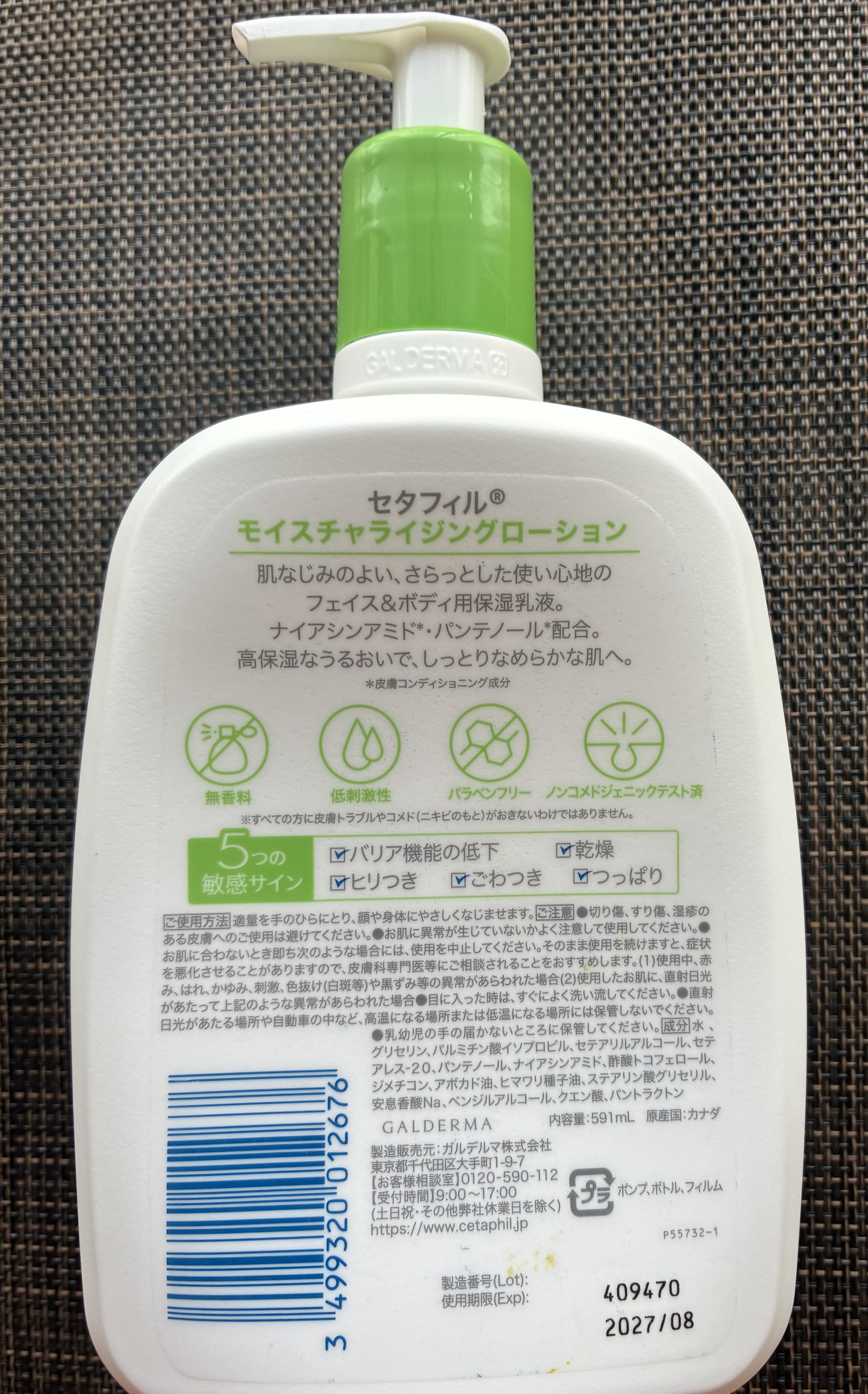 - 乾燥肌・敏感肌向け保湿乳液 フェイス&ボディ 高保湿なうるおいで、しっとりなめらか肌へ ナイアシンアミド*1、パンテノール*1、グリセリン*2配合。 肌なじみのよい、さらっとした使い心地。 ・高保湿なうるおいで、しっとりなめらかな肌へ導きます。 無香料、低刺激性。 日本の敏感肌の方でパッチテスト*3、スティンギングテスト済。*4 *1: 皮膚コンディショニング成分 *2: 保湿成分 *3: すべての方に皮膚トラブルがおきないわけではありません。 *4: ピリピリ、ヒリヒリといった使用直後の刺激感を確かめるテストです。すべての方に刺激感がないというわけではありません。