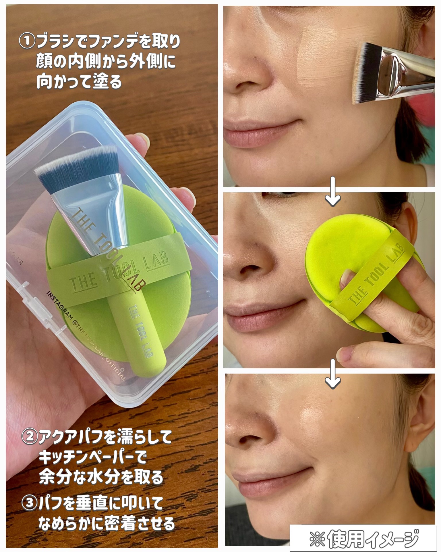 THETOOLLABアクアデュオ3mmのフラットブラシで、薄く均一に密着!ひんやりとした使い心地が嬉しい、水に濡らして使う“アクアパフ”で、密着感と心地よさを感じました。メイクアップアーティスト・ヘリム先生のYouTubeをよく見ていたので動...