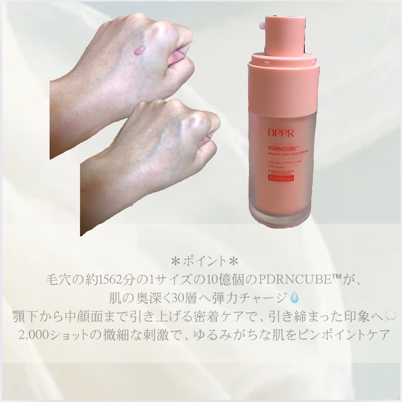 使用した商品PDRNキューブミドルショット2000セラム30ml「PDRNCUBE™」とは毛穴の約1562分の1サイズの弾力キューブ3層構造の高・中・低分子ヒアルロン酸キューブに純度99%のPDRNを閉じ込め、ターゲット層までの生存率と吸収率...