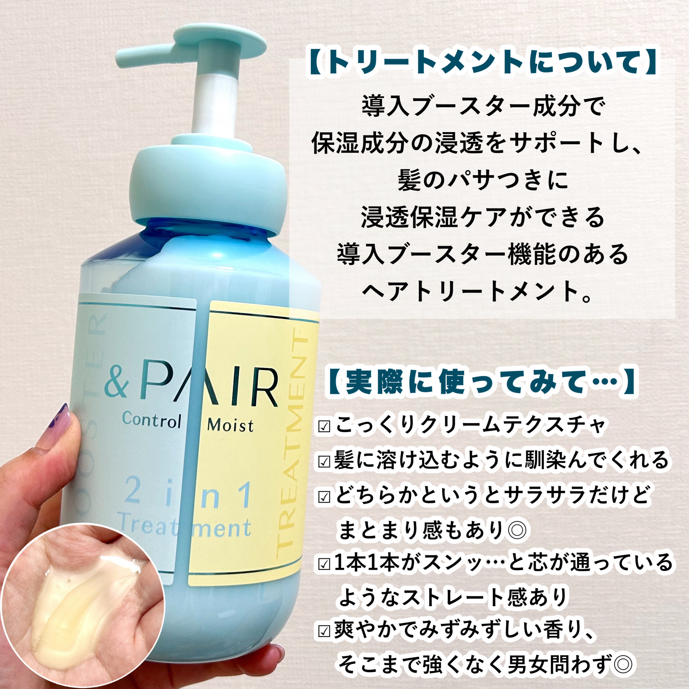 - &PAIRは「タイパ美容」に着目し、1本で2つの機能を持ち合わせたヘアケアブランドです。 コントロール モイストシリーズはうねり※1とパサつきを同時にケアし、しっとりな仕上がりに導きます。 シャンプーにはナノバブルパーツが採用されており、本体を振ることでナノバブルを発生させることができます。 ナノサイズの微細な泡で毛穴の皮脂汚れを滑らかに洗い流します。 ヘアトリートメントは導入ブースター成分*1で保湿成分の浸透をサポートし、 髪のパサつきに浸透保湿ケアができる導入ブースター機能のあるヘアトリートメント。 製品の90%以上が保湿&うねり※1ケア成分*2で構成し※2、指通り滑らかなしっとり髪へ導きます。 石油系洗浄成分不使用・パラベン不使用・動物実験不実施(製品として)・合成着色料不使用・サルフェート不使用(ラウレス硫酸Na)・鉱物油不使用 ※1 乾燥により髪のしなやかさが不足し、まとまりにくい状態 ※2 基剤を除く、水を含む *1 アルギニン、加水分解ケラチン(羊毛)、加水分解ヒアルロン酸(全て保湿) *2 γードコサラクトン(補修)