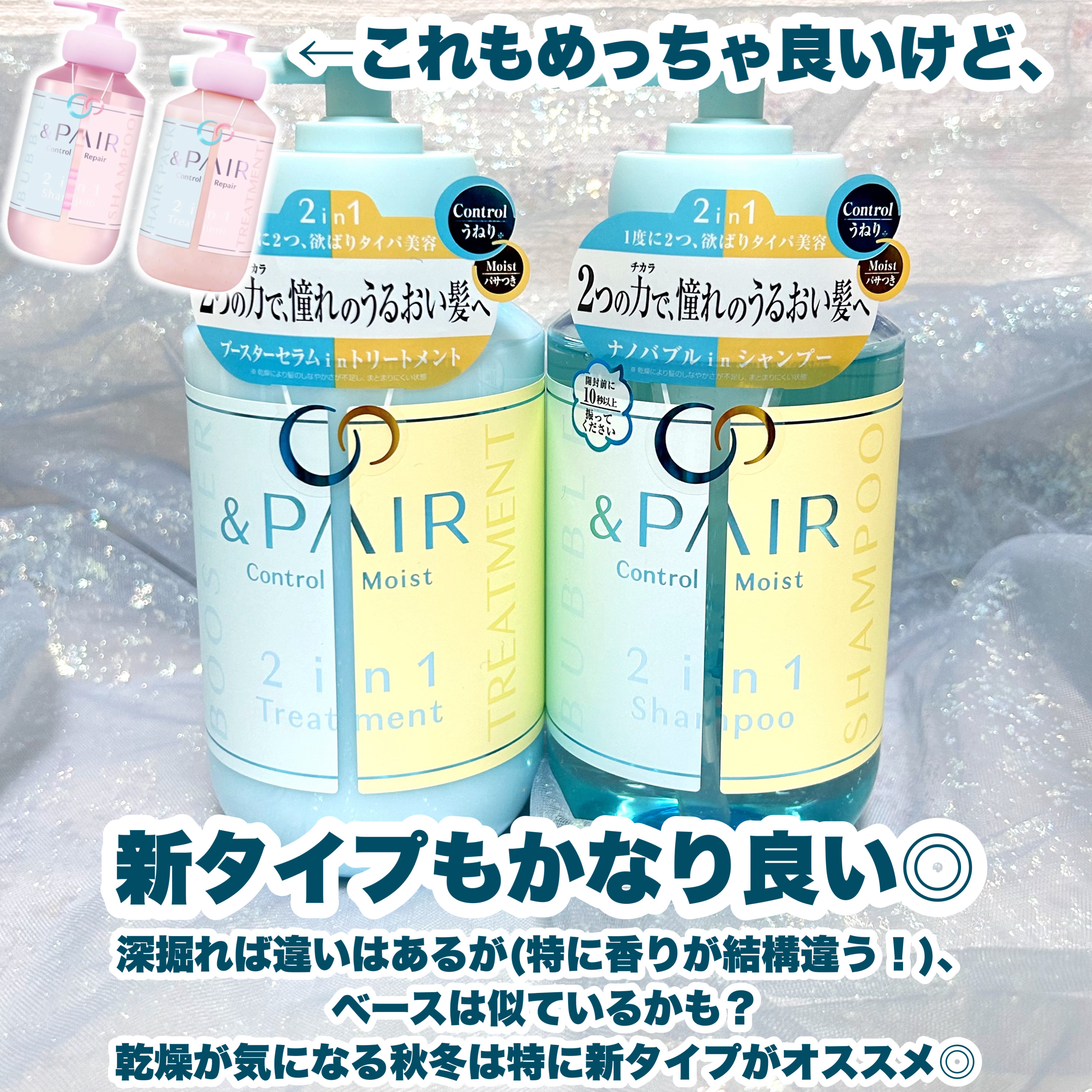 「&PAIR(アンドペア)コントロールモイスト2in1シャンプー/ヘアトリーメント」&PAIR(アンドペア)は、独自のナチュラル処方で髪にうるおいを与えてうねり※1やパサつきを軽減し、指どおりなめらかなしっとり髪へ導いてくれるというヘアケア。...