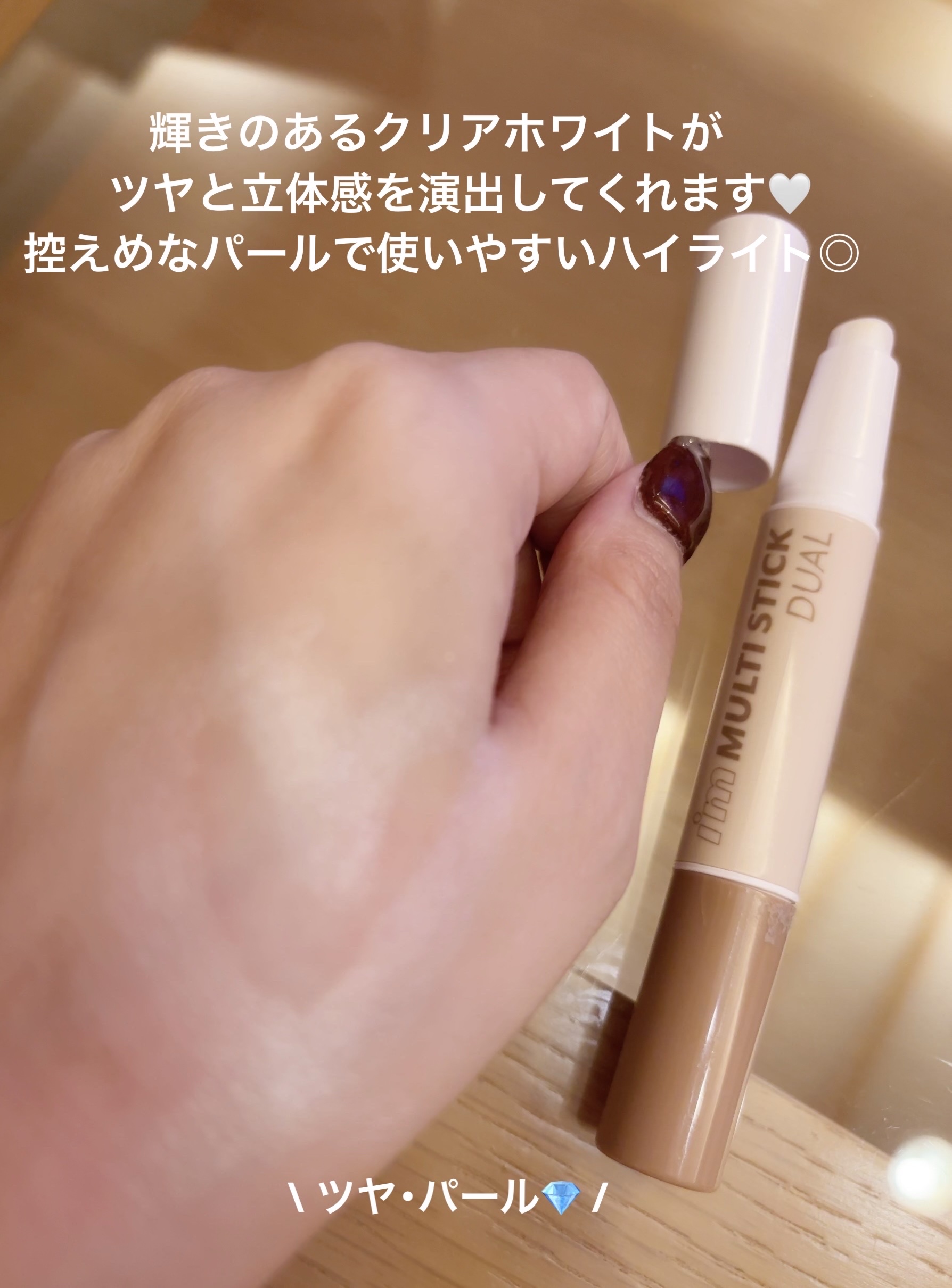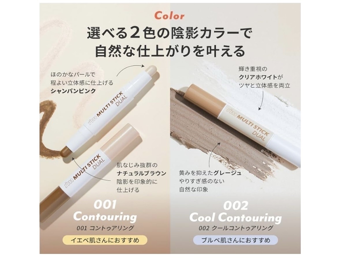 手早く済ませたい時はこのアイムミミのアイムマルチスティック デュアルを使っています♪ 指でなじませやすくて、想像以上に馴染む!! 001はイエベさん向き、002クールコントゥアリングはブルベさん向きのようですが、あまり違和感なく使えています♡ 2色使いすることで、ハッキリさせたい部分と自然に仕上げたい部分でまとまってる気がします♡