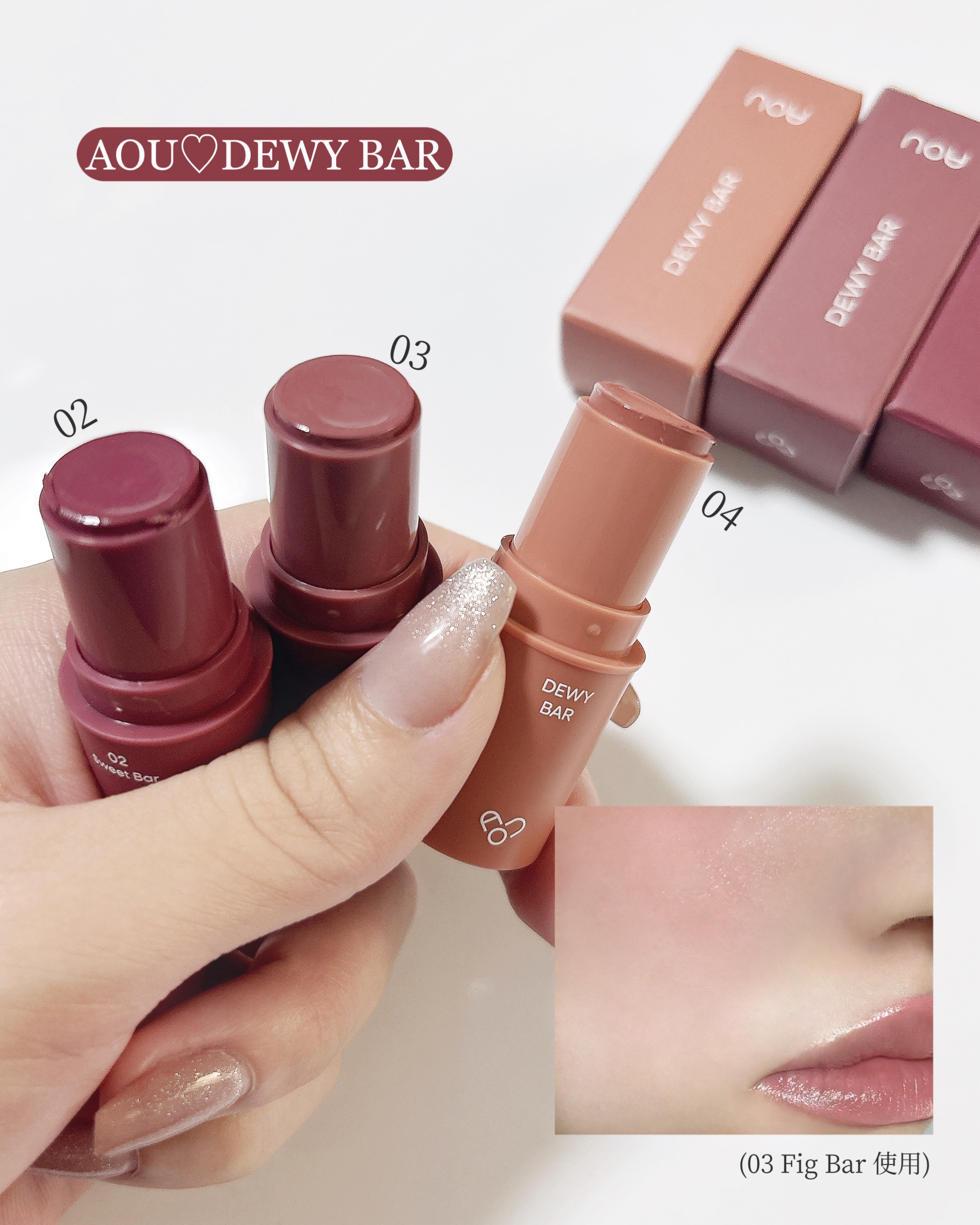 #prAOU新商品マット/デューイバーから新カラーが3色ずつローンチ!手にすっぽりと収まるミニコスメでAOUの既存のバーム商品のようにリップにもチークにも使える💓.⋆𝜗𝜚MATTEBAR.⋆𝜗𝜚唇をふんわりカバーするプライマーリップ&チーク0...