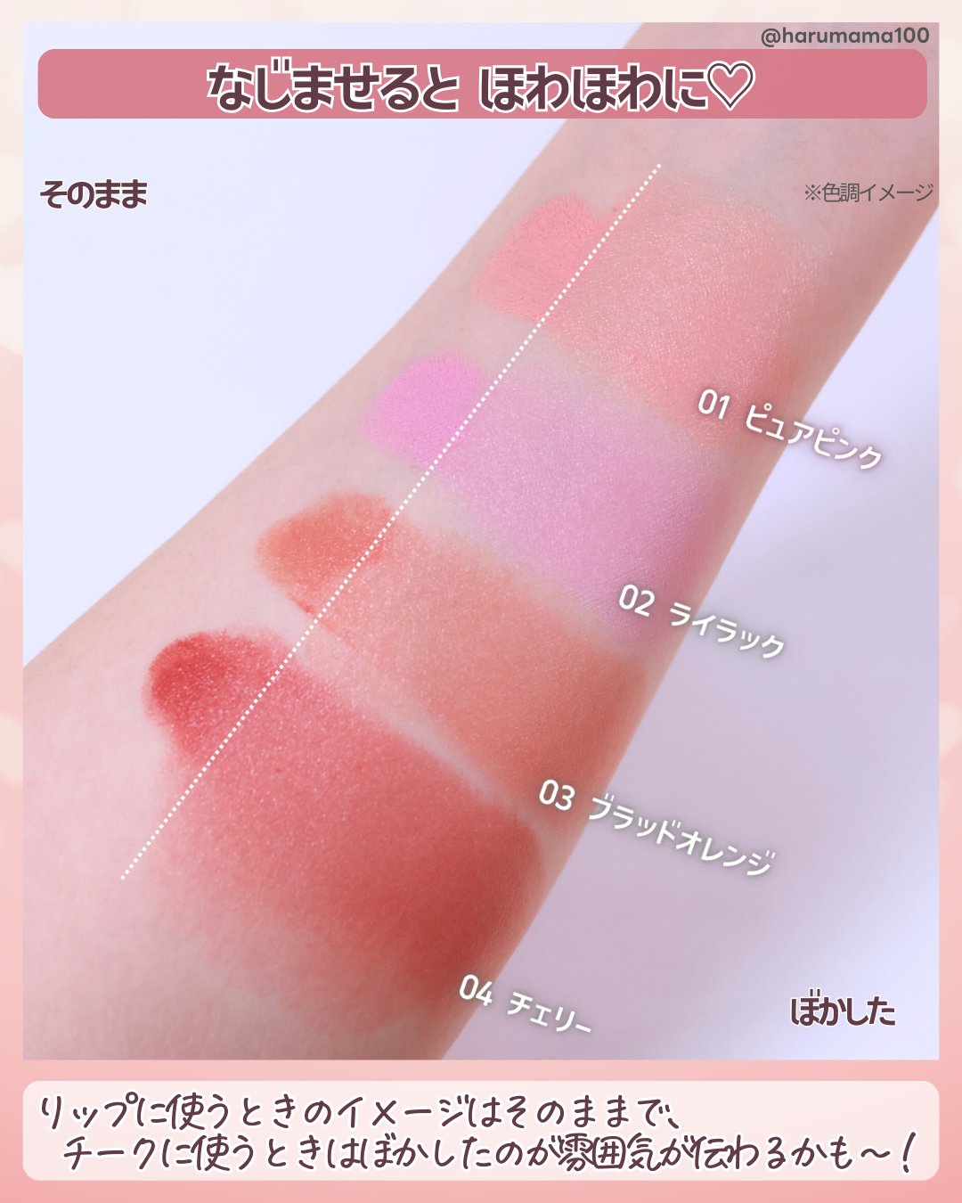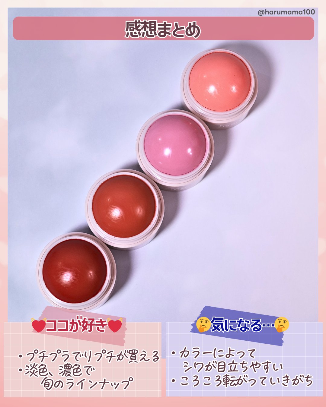 とろとろに柔らかいバームはリップにもチークにも使えるしっとりアイテム! ナチュ艶のうるうる感が凄く可愛い・・・💕 6色の多彩なラインナップだよ!ぜひチェックしてみてね🫶