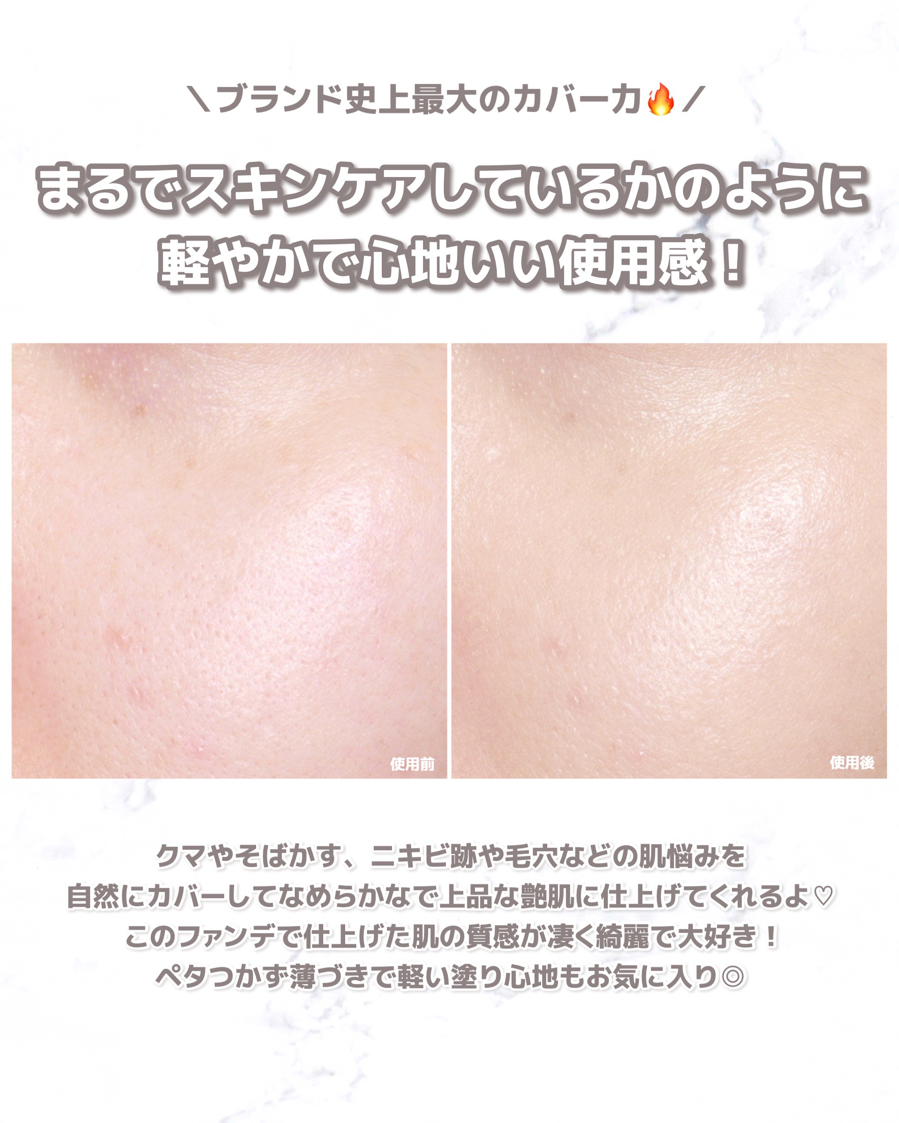 | ファンデーションランキング第49位 | スっと伸びの良いテクスチャーで肌にのせた瞬間の艶がとても綺麗!塗りたてはもちろんだけど時間が経った時の肌の状態がとっても綺麗でした♡ | 詳細を見る | |