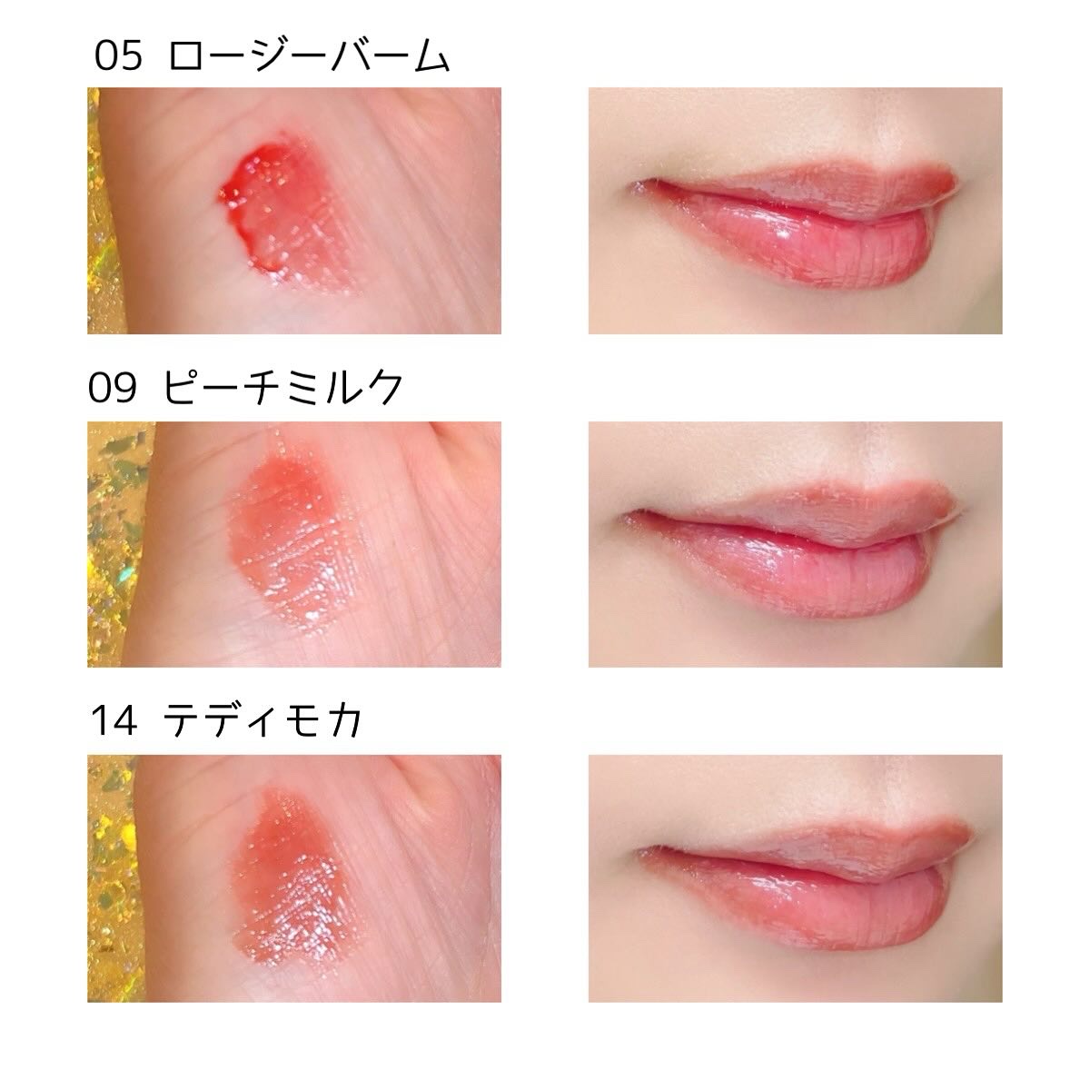 - <02 ペール・モーブ> リンゴ酸ジイソステアリル、ジフェニルシロキシフェニルトリメチコン、ビスジグリセリルポリアシルアジペート、水、ジフェニルジメチコン、水素化ポリイソブテン、Cetyl PEG/PPG-10/1 Dimethicone、ポリソルベート60、ペンチレングリコール、ソルビタンイソステアリン酸塩、グリセリン、1,2-Hexanediol、イソステアリン酸ポリグリセリル-4、セテアレス-20、アクリル酸ヒドロキシエチル、アクリロイルジメチルタウレート共重合体、スクワラン、ディラウラミドグルタミドナトリウムリジン、カプリル酸トリグリセリド、エチレンジアミン二酢酸トリナトリウム、水素化レシチン、水酸化アルミニウム、ポリアクリル酸アンモニウム、セラミドNP、ブチレングリコール、フェノキシエタノール、フレグランス (パルファム)、二酸化チタン、CI 77891、CI 17200、CI 19140、CI 15985、CI 42090 <03 ファンシー・アプリコット> リンゴ酸ジイソステアリル、ジフェニルシロキシフェニルトリメチコン、ビスジグリセリルポリアシルアジペート、水、ジフェニルジメチコン、水素化ポリイソブテン、Cetyl PEG/PPG-10/1 Dimethicone、ポリソルベート60、ペンチレングリコール、ソルビタンイソステアリン酸塩、グリセリン、1,2-Hexanediol、イソステアリン酸ポリグリセリル-4、セテアレス-20、アクリル酸ヒドロキシエチル、アクリロイルジメチルタウレート共重合体、スクワラン、ディラウラミドグルタミドナトリウムリジン、カプリル酸トリグリセリド、エチレンジアミン二酢酸トリナトリウム、水素化レシチン、水酸化アルミニウム、ポリアクリル酸アンモニウム、セラミドNP、ブチレングリコール、フェノキシエタノール、フレグランス (パルファム)、二酸化チタン、CI 77891、CI 15985、CI 19140、CI 45410、CI 17200 <04 ピンク・ベイブ> リンゴ酸ジイソステアリル、ジフェニルシロキシフェニルトリメチコン、ビスジグリセリルポリアシルアジペート、水、ジフェニルジメチコン、水素化ポリイソブテン、Cetyl PEG/PPG-10/1 Dimethicone、ポリソルベート60、ペンチレングリコール、ソルビタンイソステアリン酸塩、グリセリン、1,2-Hexanediol、イソステアリン酸ポリグリセリル-4、セテアレス-20、アクリル酸ヒドロキシエチル、アクリロイルジメチルタウレート共重合体、スクワラン、ディラウラミドグルタミドナトリウムリジン、カプリル酸トリグリセリド、エチレンジアミン二酢酸トリナトリウム、水素化レシチン、水酸化アルミニウム、ポリアクリル酸アンモニウム、セラミドNP、ブチレングリコール、フェノキシエタノール、フレグランス (パルファム)、二酸化チタン、CI 77891、CI 17200、CI 45410、CI 15985、CI 19140、CI 42090 <05 ロージー・バーム> リンゴ酸ジイソステアリル、ジフェニルシロキシフェニルトリメチコン、ビスジグリセリルポリアシルアジペート、水、ジフェニルジメチコン、水素化ポリイソブテン、Cetyl PEG/PPG-10/1 Dimethicone、ポリソルベート60、ペンチレングリコール、ソルビタンイソステアリン酸塩、グリセリン、1,2-Hexanediol、イソステアリン酸ポリグリセリル-4、セテアレス-20、アクリル酸ヒドロキシエチル、アクリロイルジメチルタウレート共重合体、スクワラン、ディラウラミドグルタミドナトリウムリジン、カプリル酸トリグリセリド、エチレンジアミン二酢酸トリナトリウム、水素化レシチン、水酸化アルミニウム、ポリアクリル酸アンモニウム、セラミドNP、ブチレングリコール、フェノキシエタノール、フレグランス (パルファム)、二酸化チタン、CI 77891、CI 15985、CI 17200、CI 42090 <06 フェード・モーブ> リンゴ酸ジイソステアリル、ジフェニルシロキシフェニルトリメチコン、ビスジグリセリルポリアシルアジペート、水、ジフェニルジメチコン、水素化ポリイソブテン、Cetyl PEG/PPG-10/1 Dimethicone、ポリソルベート60、ペンチレングリコール、ソルビタンイソステアリン酸塩、グリセリン、1,2-Hexanediol、イソステアリン酸ポリグリセリル-4、セテアレス-20、アクリル酸ヒドロキシエチル、アクリロイルジメチルタウレート共重合体、スクワラン、ディラウラミドグルタミドナトリウムリジン、カプリル酸トリグリセリド、エチレンジアミン二酢酸トリナトリウム、水素化レシチン、水酸化アルミニウム、ポリアクリル酸アンモニウム、セラミドNP、ブチレングリコール、フェノキシエタノール、フレグランス (パルファム)、二酸化チタン、CI 77891、CI 17200、CI 19140、CI 15985、CI 42090 <07 ミューデッド・キャラメル> リンゴ酸ジイソステアリル、ジフェニルシロキシフェニルトリメチコン、ビスジグリセリルポリアシルアジペート、水、ジフェニルジメチコン、水素化ポリイソブテン、Cetyl PEG/PPG-10/1 Dimethicone、ポリソルベート60、ペンチレングリコール、ソルビタンイソステアリン酸塩、グリセリン、1,2-Hexanediol、イソステアリン酸ポリグリセリル-4、セテアレス-20、アクリル酸ヒドロキシエチル、アクリロイルジメチルタウレート共重合体、スクワラン、ディラウ