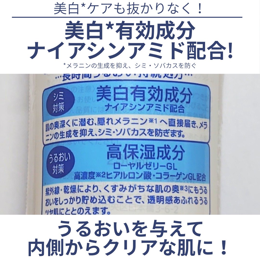 - 【医薬部外品】 みずみずしくやさしい使い心地の1品3役薬用美白エッセンスローション。 ・今あるシミ・シミ予備軍にも美白有効成分が直接届く。 肌の奥※1に潜む隠れメラニン※2に直接届くことで、今あるシミだけでなく、 未来のシミのもとにもアプローチ。メラニンの生成を抑え、シミ・ソバカスを防ぎます。 ●美白有効成分:高純度ビタミンC誘導体配合 ・うるおいツヤ成分 ローヤルゼリーエキス新配合。 紫外線や乾燥などにより、くすみがちな肌の奥※1にもうるおいをしっかり貯めこむことで、 透明感あふれるうるツヤ肌にととのえます。 ●高保湿成分:ローヤルゼリー・ヒアルロン酸・コラーゲンGL配合GLは濃グリセリンです。 ・やさしい使い心地にこだわった4フリー処方 ●無香料・無着色・無鉱物油・ノンアルコール(エチルアルコール) ※1 角層 ※2 肌の奥でつくられるシミのもと