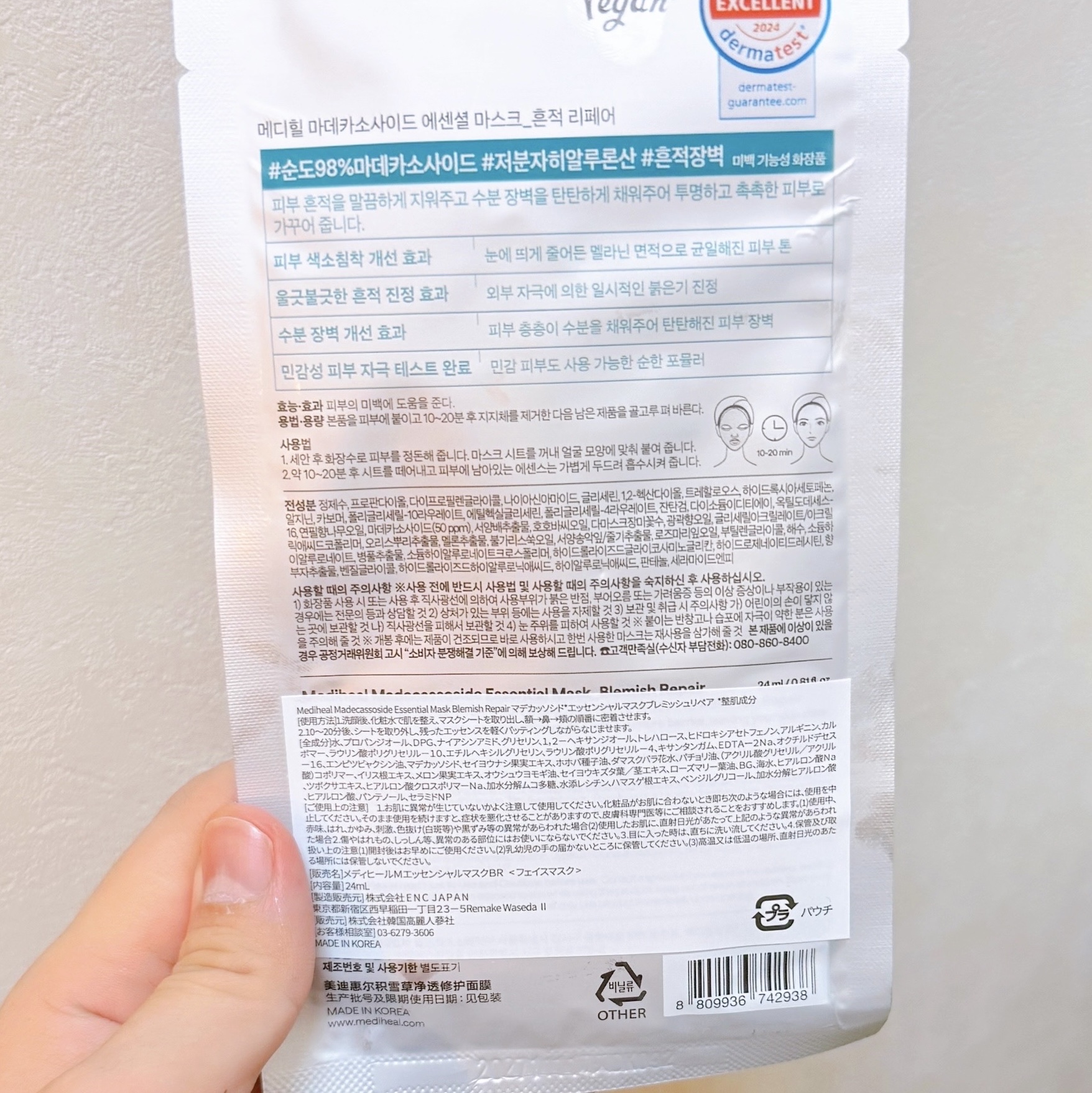 \ケアしたい時にぴったりのマスクシート🫧/☁️MEDIHEALマデカッソシドエッセンシャルマスク肌の跡ケア•肌荒れケア、保湿から肌バリアケアまで簡単にケアしたい時に使えるパック。特に鎮静•保湿に特化してるみたいで...💭とにかくうるおいはたっ...