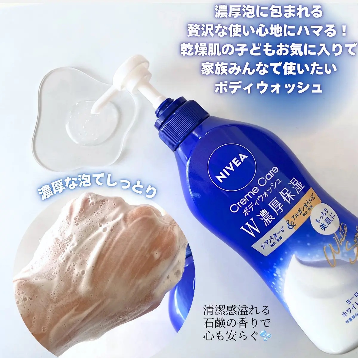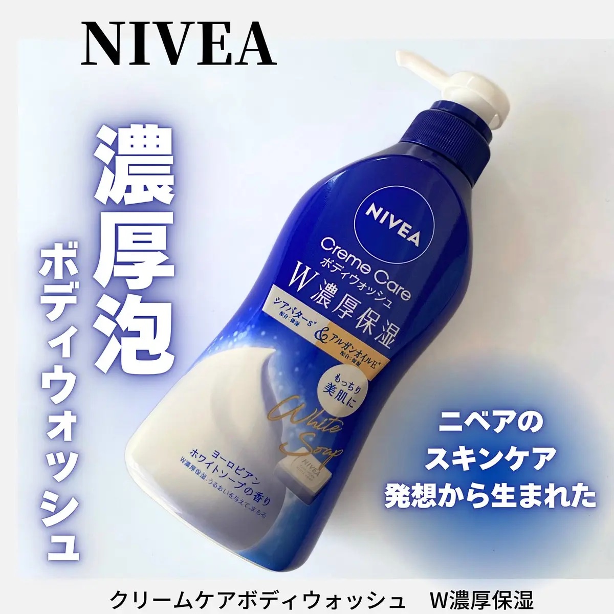 - ニベアのスキンケア発想から生まれたW濃厚保湿※処方のボディウォッシュ。 ボディミルク成分*とシアバターs**配合。クリームのような濃厚な泡でやさしく洗い上げます。 すっきり洗い流せるのに、しっとりリッチにうるおう肌に。ヨーロピアンホワイトソープの香り。 *ボディミルク成分(グリセリン・ジグリセリン)配合:保湿**シアバターs(シアバター・ポリクオタニウム‐7)配合:保湿 ※うるおいを与えて、まもる
