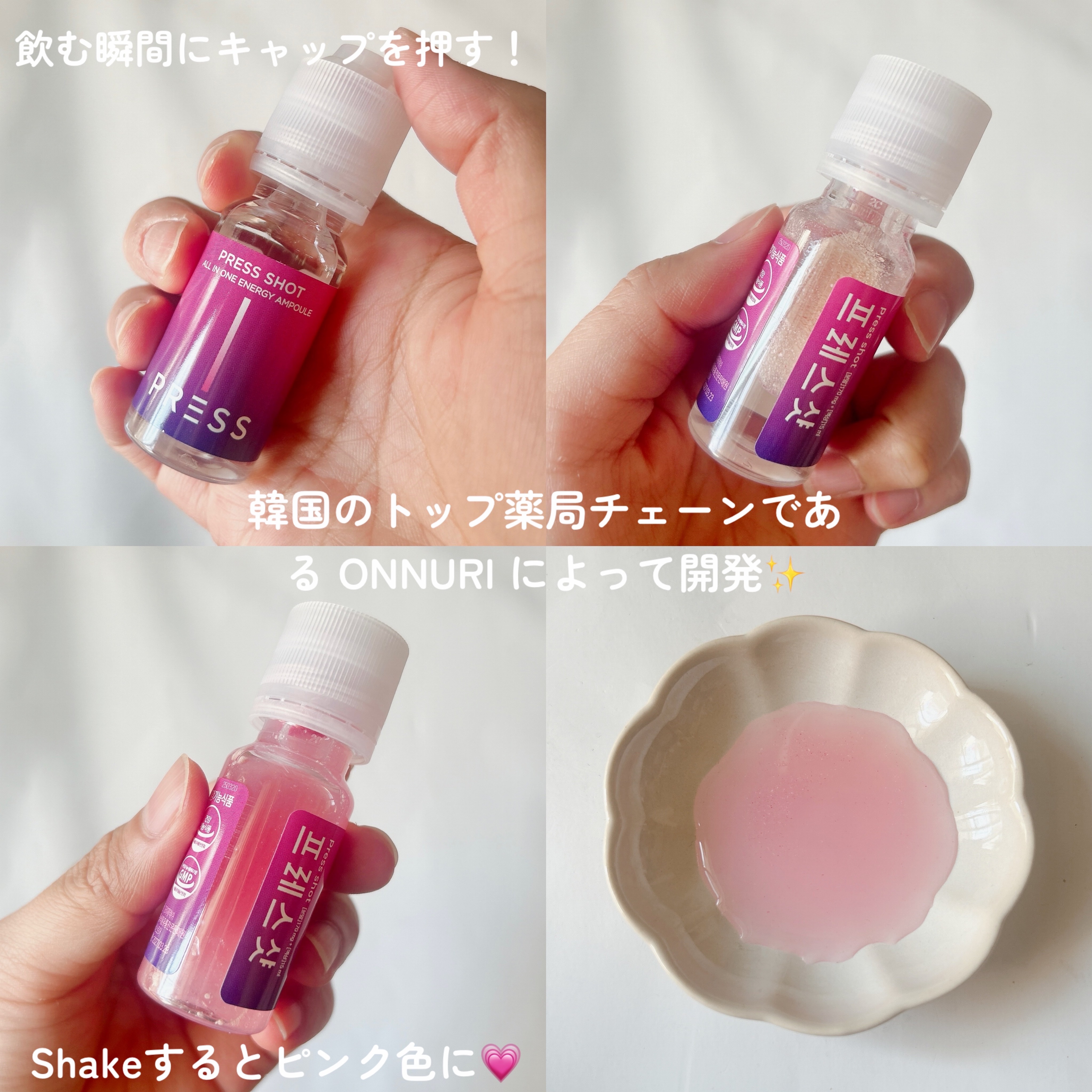 - ・PRESSしてSHAKEするだけ!魔法のようなピンクビタミンに! ・飲むインナービューティー ・飲むピンクビタミン ・粉末にはビタミン B12/D/E、葉酸、ナイアシン、亜鉛が含まれています ・吸収力を重視した液状タイプでの商品設計 ・特許取得の特殊キャップにビタミンを真空密封 ・ビタミンB群を集中配合 ・ビタミンB12は1日の基準値に対し16,667%配合 ・液体は11種類のアミノ酸で吸収しやすい設計 ・飲む瞬間にキャップを押す⇒ビタミンが液体に混ざりフレッシュなビタミンドリンクが完成! 【注意事項】 ・高カルシウム血症がある場合、または医薬品を服用されている方は専門家に相談してください。 ・体に異変を感じた場合は使用を中止し、速やかに専門家に相談してください。 ●本品は、多量摂取により疾病が治癒したり、より健康が増進するものではありません。 亜鉛の摂り過ぎは、銅の吸収を阻害するおそれがありますので、過剰摂取にならないよう注意してください。一日の摂取目安量を守ってください。乳幼児・小児は本品の摂取を避けてください。 ●本品は、特定保健用食品と異なり、消費者庁長官による個別審査を受けたものではありません。 ●食生活は、主食、主菜、副菜を基本に、食事のバランスを。 ●本品製造工場では卵、小麦、そば、落花生、えび、かに、くるみを含む製品を製造しています。 ●摂取目安量:1日当たり1本を目安にお飲みください。 ●摂取の方法:キャップを押すと粉末が落ちます。上下に振り、混ぜてからお飲みください。※粉末が固まる場合がございますが、品質には問題ありません。よく振ってからお飲みください。 2024年12月中旬より全国のウエルシア薬局とロフト※にて先行販売をいたします。 ※一部お取り扱いがない店舗がございます。