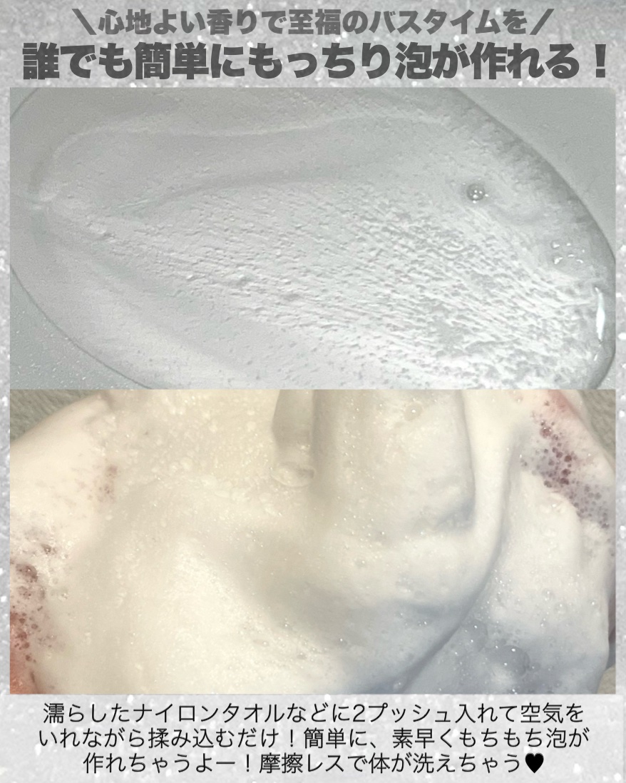| 泡がしっとりなめらか濃密!! なのに泡切れも良くさらっと流れせてぬるつきも残らないのがうれしいポイントです♬ | 詳細を見る | |