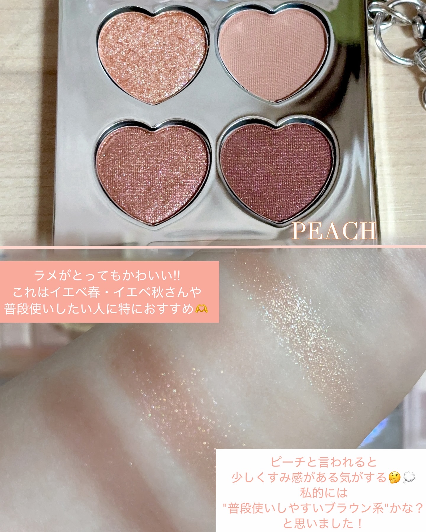 全商品が手のひらサイズのミニサイズコスメ♡ 持ち運びも便利でありながら 今、流行のバレエコア🩰のような リボンモチーフがとっても可愛らしくて 購入せざるを得ませんでした。笑 驚いたのが発色の良さ。 ②と④のカラーが一見使いづらいかな?と思うカラーですが、全然そんなことはなく みんな大好きなピンクグリッター。 ピンクベースの中に多色のラメがちらちらと 配合されていて、これがほんっとうに可愛い。