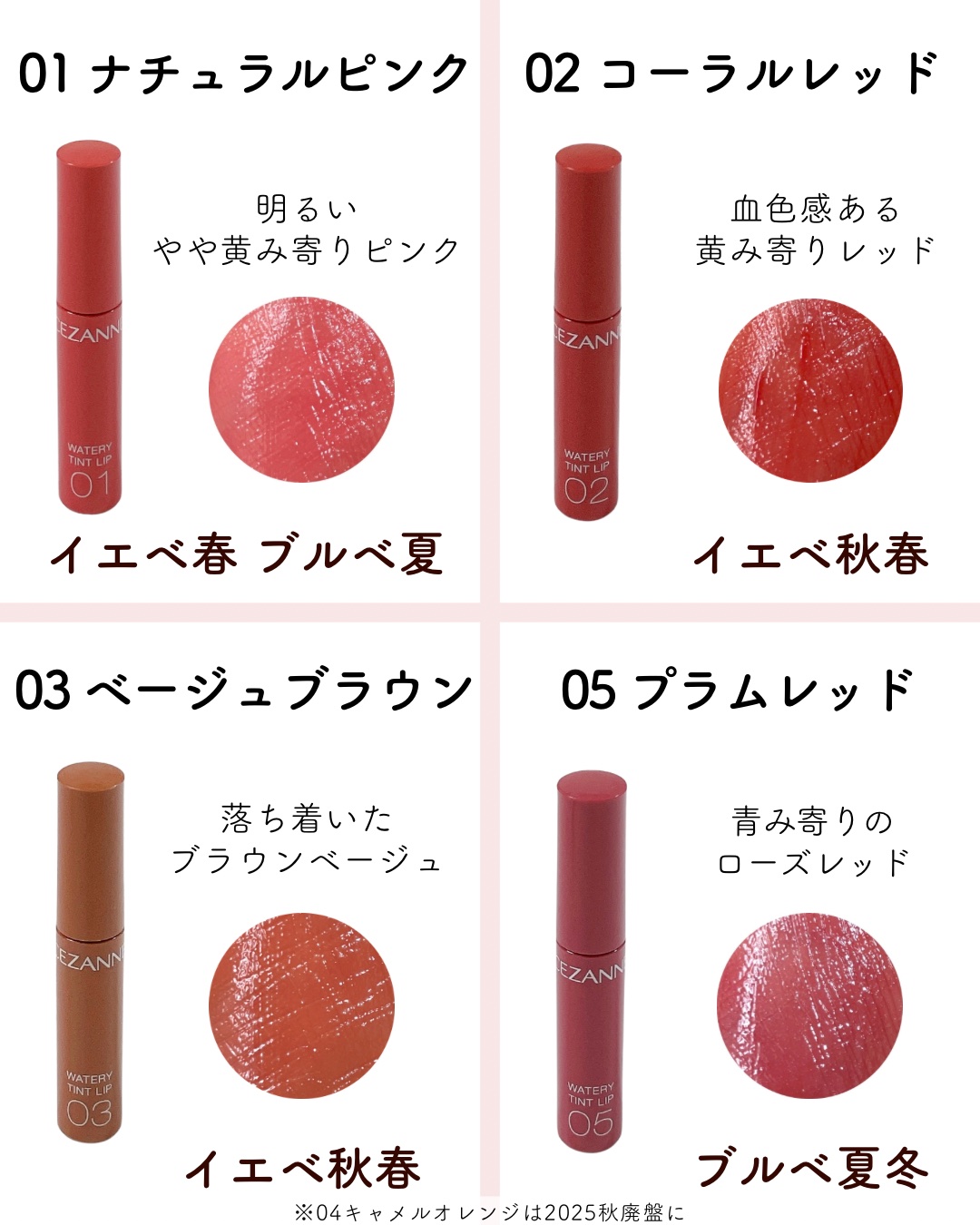 - ツヤ×色×潤いをキープする、セザンヌの新濡れツヤリップ みずみずしい濡れツヤ感ある仕上がりで、発色とツヤが長続きするティントリップです。ティントの発色を透明のベールで覆うリップコートのような処方で、ツヤ感と色をキープします。さらに、唇表面のべたつきは少なく、しっとり潤うオイルinウォーター処方を採用しています。