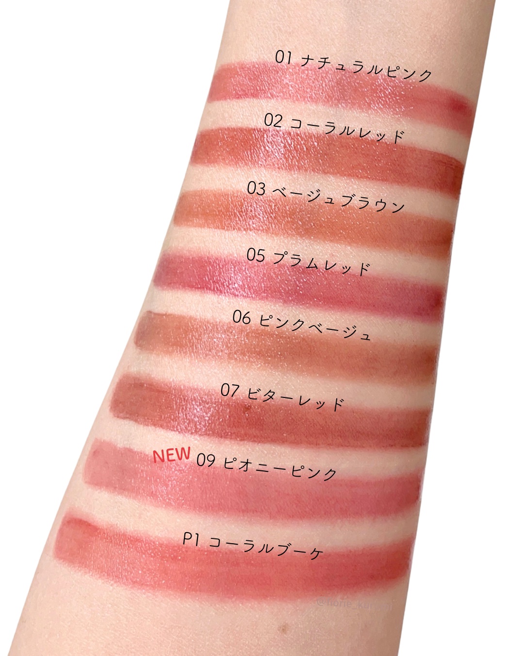 - <01 ナチュラルピンク> 水、ダイマージリノール酸(フィトステリル/イソステアリル/セチル/ステアリル/ベヘニル)、ダイマージリノール酸ダイマージリノレイル、ジフェニルシロキシフェニルトリメチコン、オクチルドデカノール、ラウロイルグルタミン酸ジ(フィトステリル/オクチルドデシル)、水添ポリイソブテン、BG、ジフェニルジメチコン、セテス-10、グリセリン、エタノール、セチルPEG/PPG-10/1ジメチコン、(アクリル酸ヒドロキシエチル/アクリロイルジメチルタウリンNa)コポリマー、イソヘキサデカン、フェノキシエタノール、メチルパラベン、トコフェロール、ポリソルベート60、エチルパラベン、デヒドロ酢酸Na、リン酸2Na、リン酸Na、イソステアリン酸ソルビタン、シメチコン、スクワラン、ハチミツ、ステアリン酸ソルビタン、ステアリン酸グリセリル、ローヤルゼリーエキス、オレイン酸ポリグリセリル-10、セルロースガム、ヒアルロン酸Na、ローズマリー葉エキス、カミツレ花エキス、水溶性コラーゲン、クエン酸、クエン酸Na、(+/-)ジカプリン酸ネオペンチルグリコール、トリイソステアリン酸ポリグリセリル-2、酸化チタン、マイカ、赤227、黄4、青1、水酸化Al、ポリアスパラギン酸Na、シリカ、キサンタンガム、EDTA-2Na、酸化鉄、PVP <02 コーラルレッド> 水、ダイマージリノール酸(フィトステリル/イソステアリル/セチル/ステアリル/ベヘニル)、ダイマージリノール酸ダイマージリノレイル、ジフェニルシロキシフェニルトリメチコン、オクチルドデカノール、ラウロイルグルタミン酸ジ(フィトステリル/オクチルドデシル)、水添ポリイソブテン、BG、ジフェニルジメチコン、セテス-10、グリセリン、エタノール、セチルPEG/PPG-10/1ジメチコン、(アクリル酸ヒドロキシエチル/アクリロイルジメチルタウリンNa)コポリマー、イソヘキサデカン、フェノキシエタノール、メチルパラベン、トコフェロール、ポリソルベート60、エチルパラベン、デヒドロ酢酸Na、リン酸2Na、リン酸Na、イソステアリン酸ソルビタン、シメチコン、スクワラン、ハチミツ、ステアリン酸ソルビタン、ステアリン酸グリセリル、ローヤルゼリーエキス、オレイン酸ポリグリセリル-10、セルロースガム、ヒアルロン酸Na、ローズマリー葉エキス、カミツレ花エキス、水溶性コラーゲン、クエン酸、クエン酸Na、(+/-)ジカプリン酸ネオペンチルグリコール、トリイソステアリン酸ポリグリセリル-2、酸化チタン、マイカ、赤227、黄4、青1、水酸化Al、ポリアスパラギン酸Na、シリカ、キサンタンガム、EDTA-2Na、酸化鉄、PVP <03 ベージュブラウン> 水、ダイマージリノール酸(フィトステリル/イソステアリル/セチル/ステアリル/ベヘニル)、ダイマージリノール酸ダイマージリノレイル、ジフェニルシロキシフェニルトリメチコン、オクチルドデカノール、ラウロイルグルタミン酸ジ(フィトステリル/オクチルドデシル)、水添ポリイソブテン、BG、ジフェニルジメチコン、セテス-10、グリセリン、エタノール、セチルPEG/PPG-10/1ジメチコン、(アクリル酸ヒドロキシエチル/アクリロイルジメチルタウリンNa)コポリマー、イソヘキサデカン、フェノキシエタノール、メチルパラベン、トコフェロール、ポリソルベート60、エチルパラベン、デヒドロ酢酸Na、リン酸2Na、リン酸Na、イソステアリン酸ソルビタン、シメチコン、スクワラン、ハチミツ、ステアリン酸ソルビタン、ステアリン酸グリセリル、ローヤルゼリーエキス、オレイン酸ポリグリセリル-10、セルロースガム、ヒアルロン酸Na、ローズマリー葉エキス、カミツレ花エキス、水溶性コラーゲン、クエン酸、クエン酸Na、(+/-)ジカプリン酸ネオペンチルグリコール、トリイソステアリン酸ポリグリセリル-2、酸化チタン、マイカ、赤227、黄4、青1、水酸化Al、ポリアスパラギン酸Na、シリカ、キサンタンガム、EDTA-2Na、酸化鉄、PVP <05 プラムレッド> 水、ダイマージリノール酸(フィトステリル/イソステアリル/セチル/ステアリル/ベヘニル)、ダイマージリノール酸ダイマージリノレイル、ジフェニルシロキシフェニルトリメチコン、オクチルドデカノール、ラウロイルグルタミン酸ジ(フィトステリル/オクチルドデシル)、水添ポリイソブテン、BG、ジフェニルジメチコン、セテス-10、グリセリン、エタノール、セチルPEG/PPG-10/1ジメチコン、(アクリル酸ヒドロキシエチル/アクリロイルジメチルタウリンNa)コポリマー、イソヘキサデカン、フェノキシエタノール、メチルパラベン、トコフェロール、ポリソルベート60、エチルパラベン、デヒドロ酢酸Na、リン酸2Na、リン酸Na、イソステアリン酸ソルビタン、シメチコン、スクワラン、ハチミツ、ステアリン酸ソルビタン、ステアリン酸グリセリル、ローヤルゼリーエキス、オレイン酸ポリグリセリル-10、セルロースガム、ヒアルロン酸Na、ローズマリー葉エキス、カミツレ花エキス、水溶性コラーゲン、クエン酸、クエン酸Na、(+/-)ジカプリン酸ネオペンチルグリコール、トリイソステア
