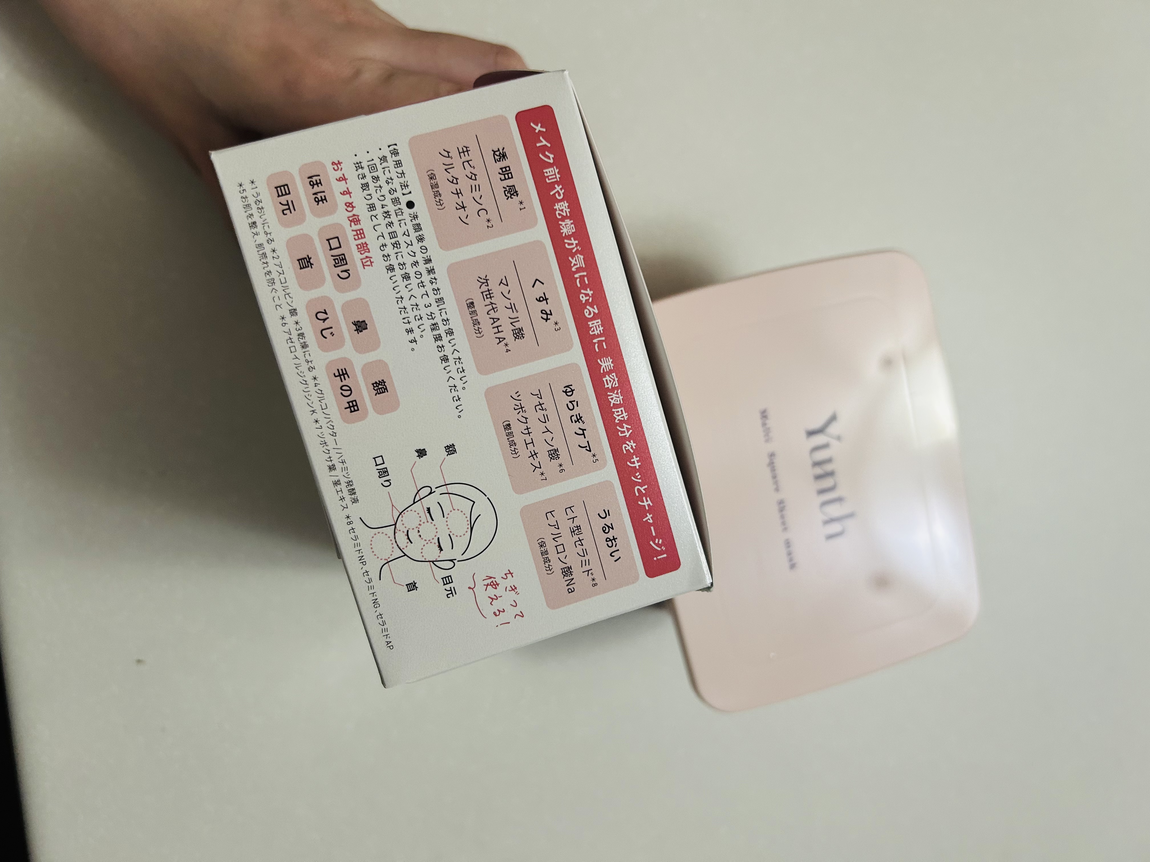 - ① 生ビタミンC×グルタチオンで、輝きあふれる透明感へ。与える+オフのWアプローチ Yunthでおなじみの生ビタミンC※1に加え、グルタチオン※2やセラミド※3、ヒアルロン酸※4など肌の保湿と透明感※5を底上げする成分だけでなく、ふき取り用途として次世代型AHA※6、肌を整えるアゼライン酸※7やツボクサエキス※8も配合。あらゆる肌悩みに多角的にアプローチする処方設計です。 ※1 アスコルビン酸 ※2 グルタチオン (保湿) ※3 セラミドNP、セラミドNG、セラミドAP (保湿) ※4 ヒアルロン酸Na (保湿) ※5 うるおいによる ※6 グルコノバクター/ハチミツ発酵液 (整肌) ※7 アゼロイルジグリシンK (整肌) ※8 ツボクサ葉/茎エキス (整肌) ②たっぷり使える120枚入り。毎日使いやすい“ちぎれる”スクエア形状 液含みがよく、手で簡単にちぎれるシートを採用。 顔全体はもちろん、小鼻・目元・首元など気になるパーツにサッと貼ることができます。お好みのサイズにちぎって、Tゾーンや目元などのピンポイントケアにも最適です。たっぷり使える大容量120枚入り。 ③高密着&高保のシートで忙しい朝でも3分で潤いチャージ 絶妙な厚みの高密着シートが肌にぴたりとフィットし、美容液のうるおいをしっかり届けます。たった3分で肌をみずみずしく整え、メイクのノリもアップ。夏のメイク崩れも防ぎやすくします。「毎日のスキンケアをもっと手軽に」「隙間時間に賢くケアしたい」という方にぴったりの時短アイテムです。 ④肌にやさしい6つのフリー パラベン、エタノール、鉱物油、石油系界面活性剤、香料、着色料がフリー。毎日使えるやさしい使い心地を追求しました。