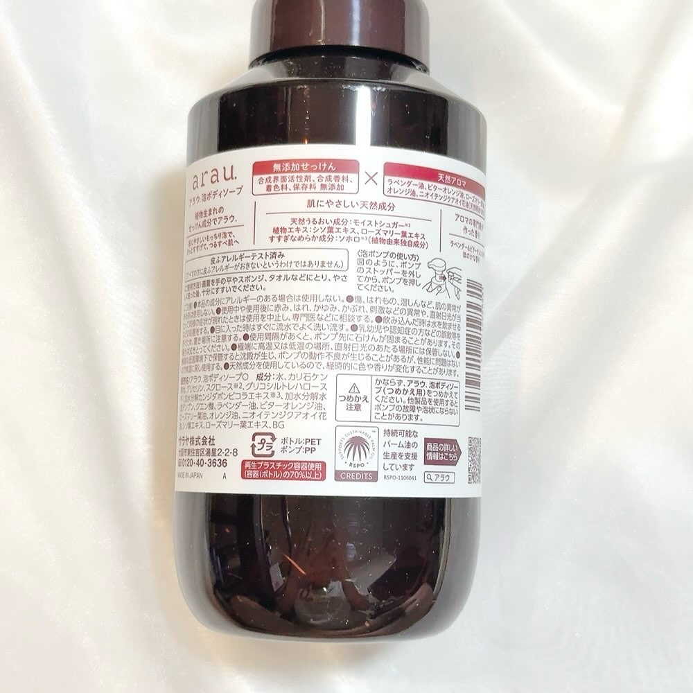 ☆✼••••✼••••✼アラウ泡ボディソープ✼••••✼••••✼無添加せっけんで天然アロマオイル100%の香り。「アラウ泡ボディソープ」ってピンクの容器なイメージ。こちらのブラウンの容器は限定発売みたい。植物うまれの洗浄成分の無添加せっけん...