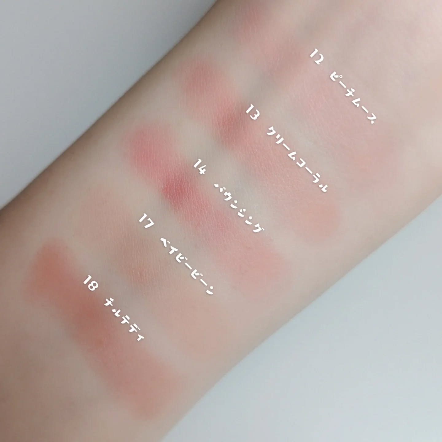 バニラコロマンティックブラッシュリップ&チーク全22色のうち10色を紹介するよ✨️ヒアルロン酸·植物性バター・ボリュームケアペプチドなど配合Milkyline青みがかったブルベカラーにライトなミルクを一滴入ったようなカラーに感じました02ピン...