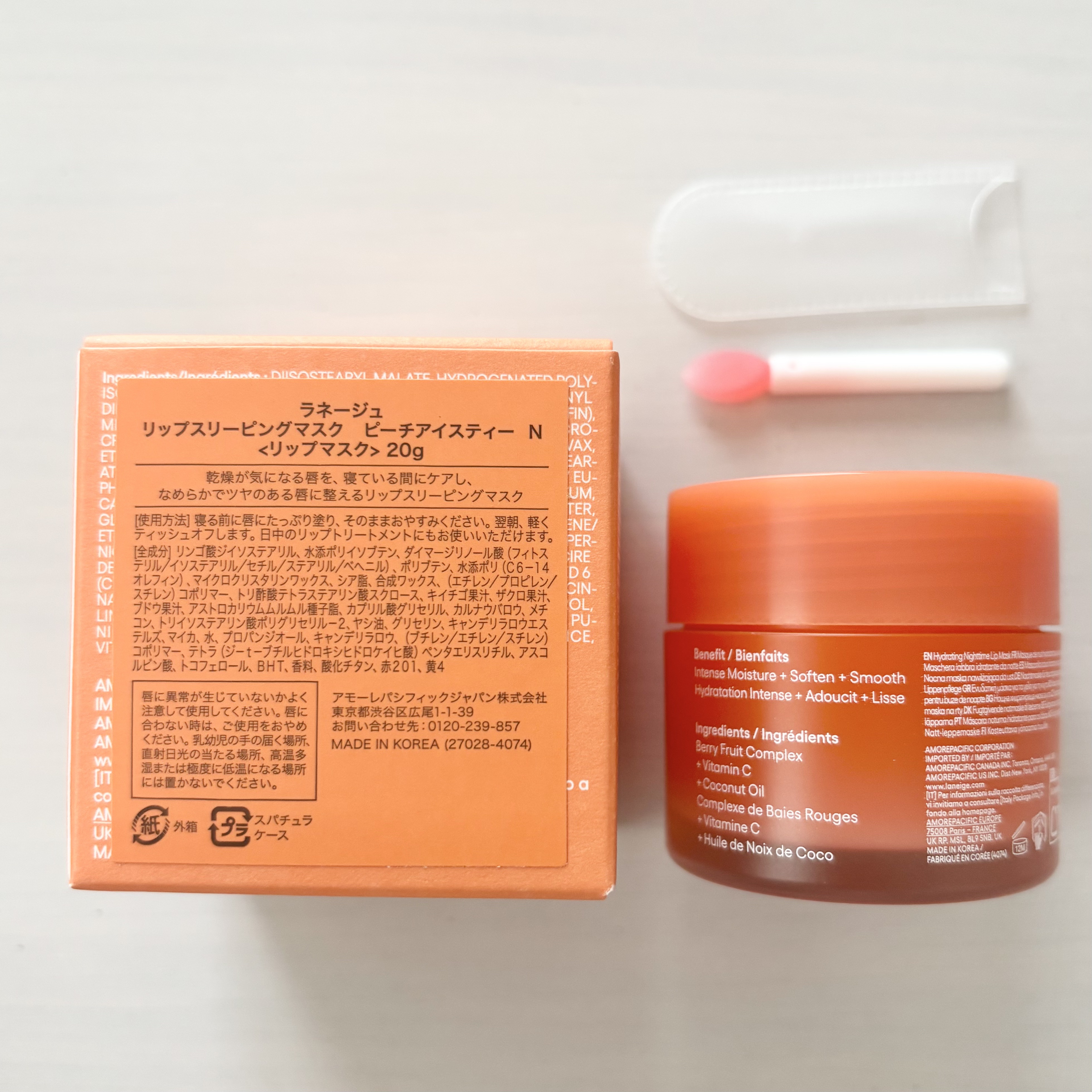 - 寝ている間にケアしてふっくらぷるぷるにうるおった唇へ。 2015年の初代発売以降、世界で2秒に1個売れている*¹LANEIGE大ヒットシリーズ *¹ 2024年グローバル販売実績 1.角質にアプローチするBerryFruitComplex (ベリーフルーツコンプレックス)*²が、 寝ている間に気になる乾燥や角質にうるおいを与え、つやのあるふっくらとうるおった唇に仕上げます。 *²ザクロ果実エキス、ブドウ果実エキス、ラズベリー果実エキス 2.ココナッツオイル(ヤシ油)を配合で、うるおいをあたえ睡眠中の乾燥を防ぎます。 3.今夜はどんな気分?5つのフレーバーから選べるワクワク感。 ■テクスチャー:やさしく馴染むなめらかなバームタイプ ■アレルギーテスト済み*³ *³全ての方にアレルギーが起こらないということではありません。 ■使用方法 寝る前に唇にたっぷり塗り、そのままお休みください。 翌朝、軽くティッシュオフします。付属のスパチュラで塗ることで、より唇の角質に馴染みやすくなります。 日中のリップトリートメントにも使用できます。