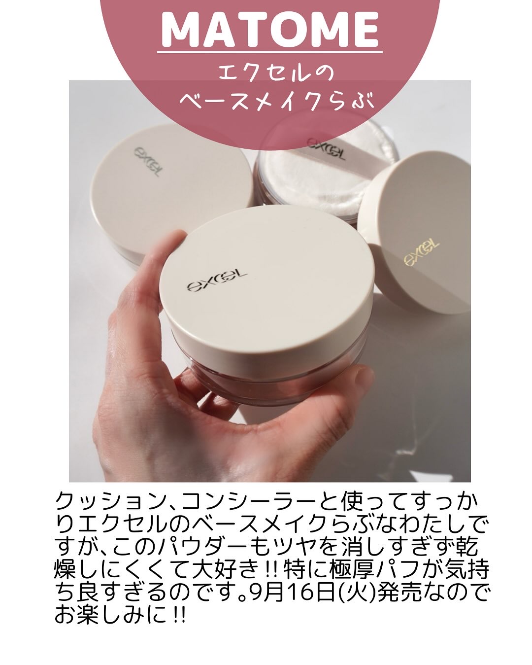 - 触れた瞬間お肌に溶け込むようにとろけて、贅沢うるふわ肌へ 美容液で包み込む、プレミアムなスキンケアパウダー 1. しっとりとお肌に溶け込むように馴染む、美肌パウダー設計。 上質な肌ざわりを叶えます。 ・メルティレア処方(NEW) お肌の上でとろけるようなパウダーで、なめらかでやわらかい仕上がりに。 ・アミノ酸コーティング処方 ベースとなるパウダーをアミノ酸*1でコーティング。お肌にしっとりと密着し、贅沢うるふわ肌に仕上げます。 ・セラミド内包パウダー*2 お肌のうるおいバリアをサポートし、乾燥から守ります。 2. お肌をケアするこだわりの 20 種の美容液成分(保湿)を贅沢配合。 3. 毛穴やお肌の凹凸をカバー。 乾燥・くずれを防いで、透明感*3あふれるようなつけたての美しい仕上がりが続きます。 <EX01 シルキーベージュ> やわらかなセミマット肌に。ピンクパール配合。 <EX02 グロウベージュ> 明るく華やかな印象のツヤ肌に。 7色(ピンク、パープル、ブルー、グリーン、オレンジ、 ゴールド、シルバー)の微細パール配合。 <EX03 シマーピンク> ほんのり血色感をもたらすツヤ肌に。 ピンク&パープルパール配合。 *1 ジラウロイルグルタミン酸リシンNa(保湿) *2 コメヌカスフィンゴ糖脂質、コメヌカ油、シクロデキストリン(すべて保湿) *3 メイクアップ効果 <EX01 シルキーベージュ,EX02 グロウベージュ,EX03 シマーピンク> ◆2025年8月29日からロフト及びプラザ、9月2日よりエクセル公式オンラインショップにて先行販売
