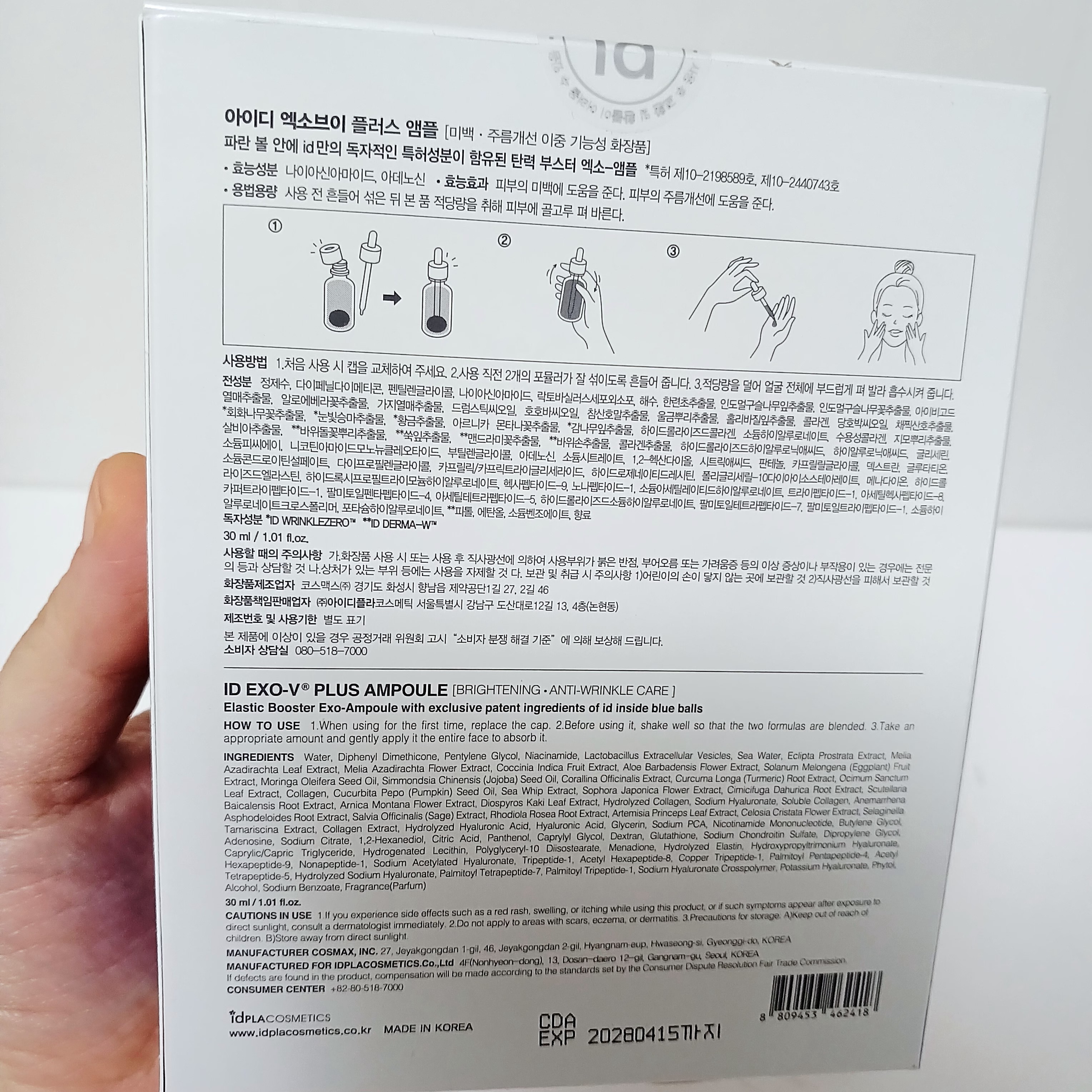 idEXO-Vプラスアンプル(30ml)です。初回はキャップを替えてよく振り、2層を混ぜてから適量を顔全体になじませます。パッケージ記載:EXOSOME&NMN、IDDERMA-W™/IDWRINKLEZERO™。20代にも取り入れやすく、リ...