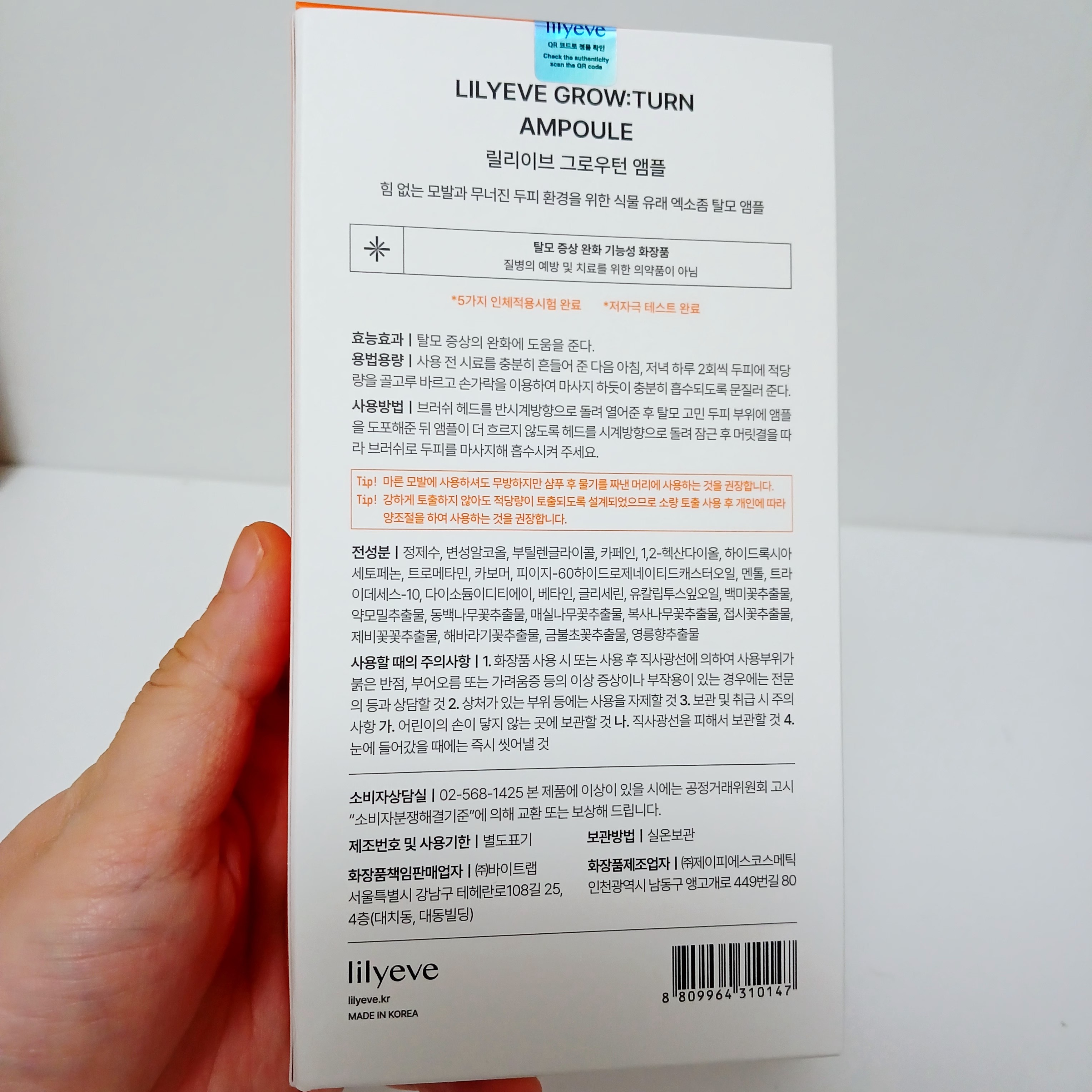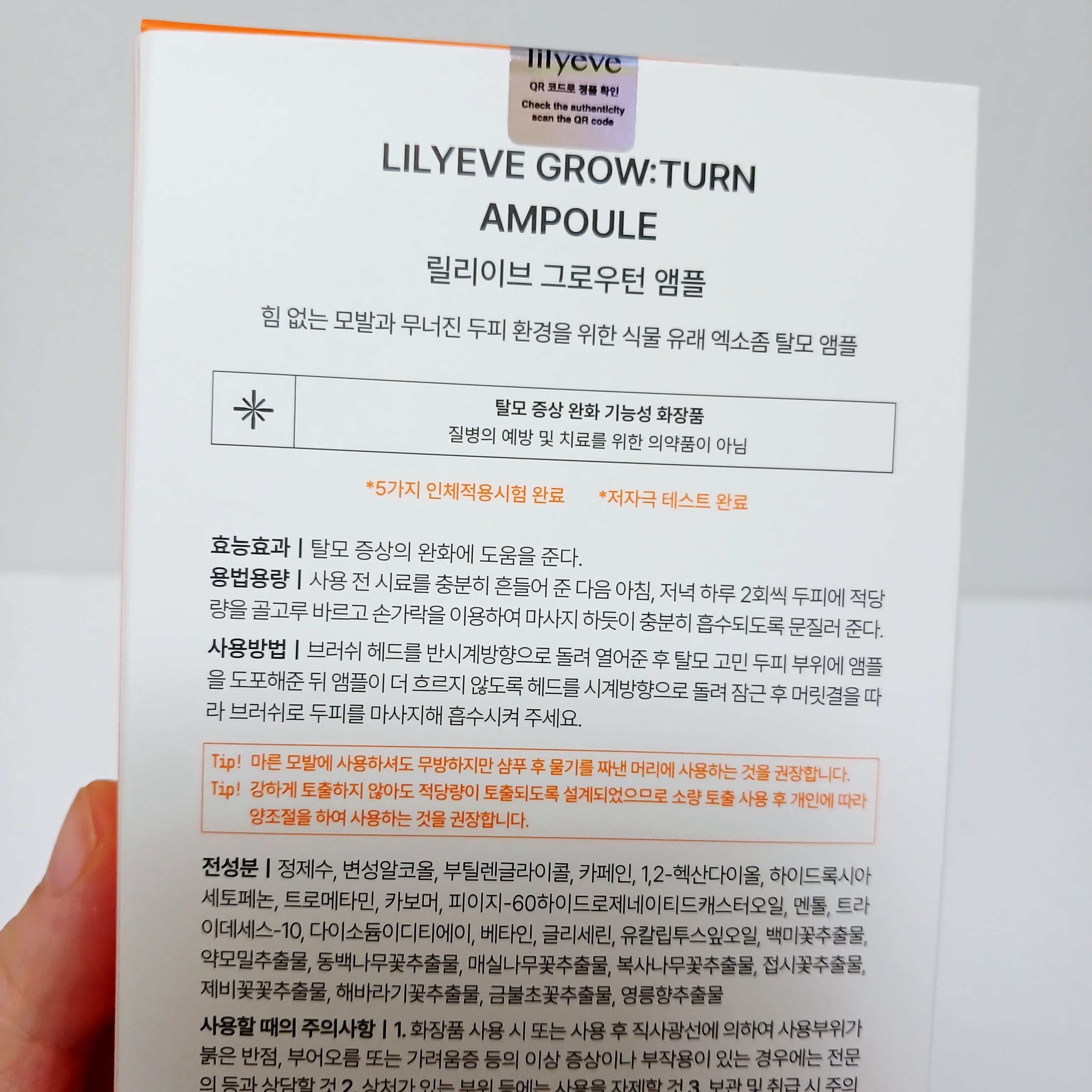 LILYEVEGROW:TURNAMPOULE(100ml)です。健やかな頭皮環境のためのスカルプケア用で、朝晩に頭皮へ適量をなじませます。パッケージ記載:機能性化粧品(脱毛症状ケア用途)、5種のヒト適用試験完了・低刺激テスト完了。韓国でも注...