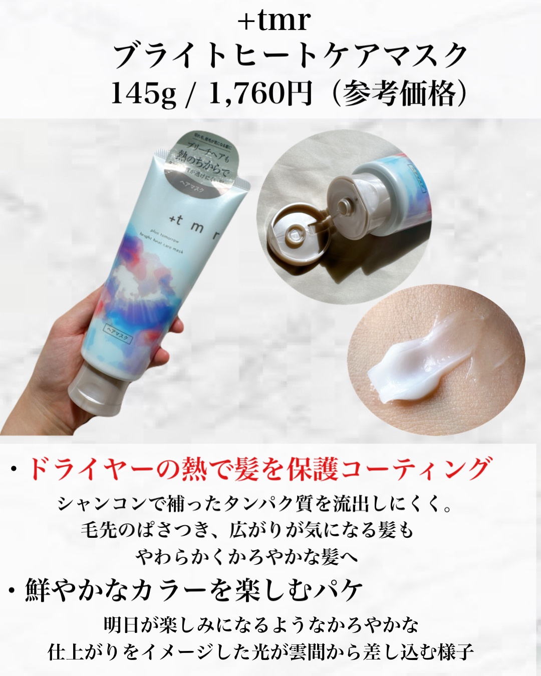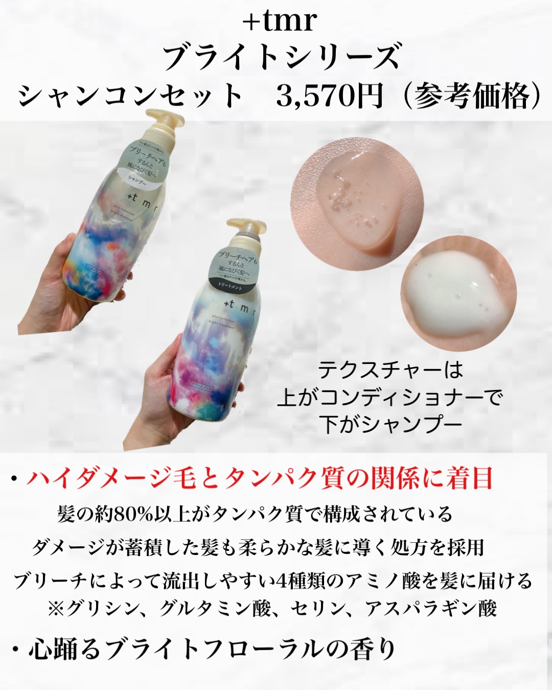 やさしく洗えてつるんとまとまるところが気に入って使っている「+tmr(プラストゥモロー)」いままで、ふんわり軽い仕上がりの"スムースシリーズ"と、なめらかにまとまる"モイストシリーズ"2つの展開だったのが...ブリーチやカラー繰り返したよ...