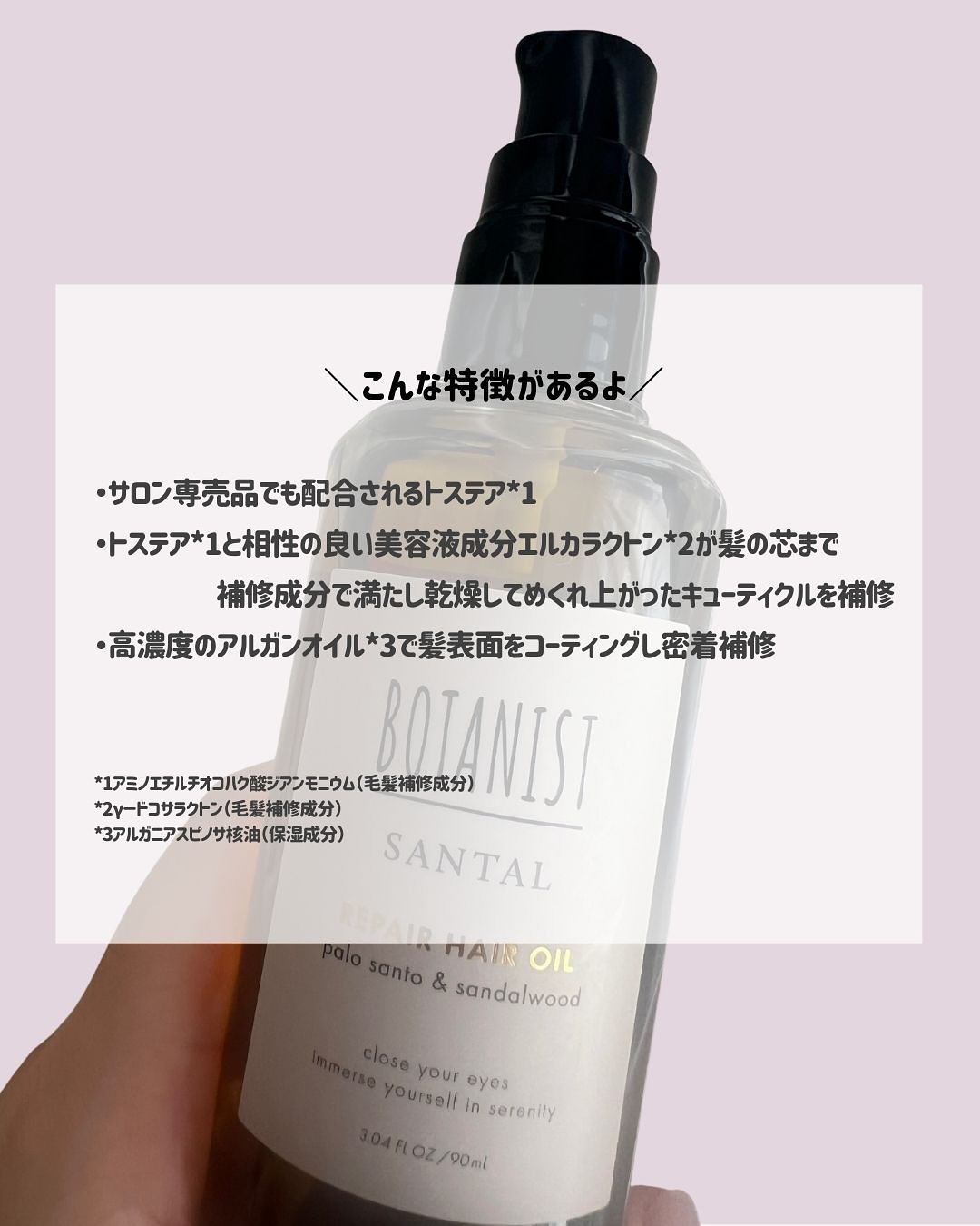 \BOTANISTから新商品登場♡/@botanist_officialから本格ダメージケア濃香ヘアオイルが登場したよ(*^^*)*BOTANISTSANTALリペアヘアオイル1,980円(税込)サロン専売品でも配合されるトステア*1で...