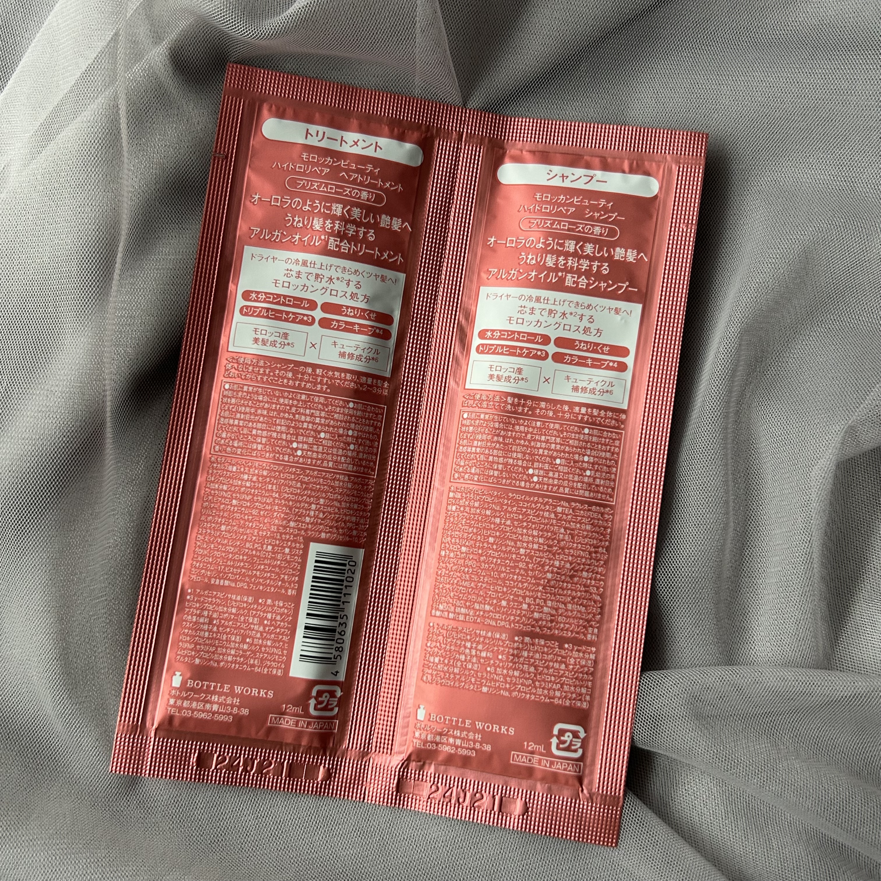 - <シャンプー (本体)> 水、コカミドプロピルベタイン、ラウロイルメチルアラニンNa、ラウレス-6カルボン酸Na、ラウラミドプロピルベタイン、ココイルグルタミン酸TEA、コカミドDEA、ラウロイル加水分解シルクNa、アルガニアスピノサ核油、アルガニアスピノサカルス培養エキス、加水分解シルク、ヒドロキシプロピルトリモニウム加水分解シルク、オプンチアフィクスインジカ種子油、センチフォリアバラ花油、γ-ドコサラクトン、ステアルジモニウムヒドロキシプロピル加水分解ケラチン(羊毛)、(ジヒドロキシメチルシリルプロポキシ)ヒドロキシプロピル加水分解シルク、ポリクオタニウム-64、ジラウロイルグルタミン酸リシンNa、加水分解コラーゲン、セラミドNG、セラミドNP、セラミドAP、テトラヘキシルデカン酸アスコルビル、ヒドロキシエチルウレア、ヒアルロン酸ヒドロキシプロピルトリモニウム、(アブラナ種子油/シナアブラギリ種子油)コポリマー、ポリクオタニウム-92、ゼイン、ダイマージリノール酸ダイマージリノレイル、PPG-3カプリリルエーテル、セバシン酸ジエチル、ポリクオタニウム-7、ポリクオタニウム-10、ポリクオタニウム-47、ポリクオタニウム-53、クオタニウム-33、コレステロール、ココイルグリシンK、ココイルメチルタウリンNa、コカミドメチルMEA、グアーヒドロキシプロピルトリモニウムクロリド、イソマルト、レシチン、イソプロパノール、プロパンジオール、BG、PG、塩化Na、塩化Mg、ジステアリルジモニウムクロリド、フィチン酸、クエン酸、クエン酸Na、デシルグルコシド、ポリソルベート80、ヤシ脂肪酸K、トリイソステアリン酸PEG-160ソルビタン、ペンテト酸5Na、硝酸Mg、メチルクロロイソチアゾリノン、メチルイソチアゾリノン、安息香酸Na、酸化銀、EDTA-2Na、DPG、トコフェロール、フェノキシエタノール、香料 <トリートメント(本体)> 水、セタノール、ベヘントリモニウムクロリド、ジメチコン、アルガニアスピノサ核油、アルガニアスピノサカルス培養エキス、加水分解シルク、ヒドロキシプロピルトリモニウム加水分解シルク、オプンチアフィクスインジカ種子油、センチフォリアバラ花油、γ-ドコサラクトン、ステアルジモニウムヒドロキシプロピル加水分解ケラチン(羊毛)、(ジヒドロキシメチルシリルプロポキシ)ヒドロキシプロピル加水分解シルク、ポリクオタニウム-64、ジラウロイルグルタミン酸リシンNa、加水分解コラーゲン、セラミドNG、セラミドNP、セラミドAP、テトラヘキシルデカン酸アスコルビル、ヒドロキシエチルウレア、ヒアルロン酸ヒドロキシプロピルトリモニウム、(アブラナ種子油/シナアブラギリ種子油)コポリマー、ポリクオタニウム-92、ゼイン、ダイマージリノール酸ダイマージリノレイル、PPG-3カプリリルエーテル、シクロヘキサン-1,4-ジカルボン酸ビスエトキシジグリコール、セバシン酸ジエチル、ポリクオタニウム-7、クオタニウム-33、コレステロール、ラウリン酸ポリグリセリル-10、ジイソステアリン酸ポリグリセリル-3、セテス-13、セテス-15、ステアラミドプロピルジメチルアミン、ヒドロキシエチルセルロース、イソマルト、レシチン、BG、PG、乳酸、クエン酸、ジステアリルジモニウムクロリド、ジアルキル(C12-18)ジモニウムクロリド、シクロペンタシロキサン、フェニルトリメチコン、ジフェニルシロキシフェニルトリメチコン、ジメチコノール、シリコーンクオタニウム-17、ビスセテアリルアモジメチコン、アモジメチコン、グリセリン、イソプロパノール、イソペンチルジオール、トコフェロール、安息香酸Na、DPG、フェノキシエタノール、香料 <シャンプー(詰め替え)> 水、コカミドプロピルベタイン、ラウロイルメチルアラニンNa、ラウレス-6カルボン酸Na、ラウラミドプロピルベタイン、ココイルグルタミン酸TEA、コカミドDEA、ラウロイル加水分解シルクNa、アルガニアスピノサ核油、アルガニアスピノサカルス培養エキス、加水分解シルク、ヒドロキシプロピルトリモニウム加水分解シルク、オプンチアフィクスインジカ種子油、センチフォリアバラ花油、γ-ドコサラクトン、ステアルジモニウムヒドロキシプロピル加水分解ケラチン(羊毛)、(ジヒドロキシメチルシリルプロポキシ)ヒドロキシプロピル加水分解シルク、ポリクオタニウム-64、ジラウロイルグルタミン酸リシンNa、加水分解コラーゲン、セラミドNG、セラミドNP、セラミドAP、テトラヘキシルデカン酸アスコルビル、ヒドロキシエチルウレア、ヒアルロン酸ヒドロキシプロピルトリモニウム、(アブラナ種子油/シナアブラギリ種子油)コポリマー、ポリクオタニウム-92、ゼイン、ダイマージリノール酸ダイマージリノレイル、PPG-3カプリリルエーテル、セバシン酸ジエチル、ポリクオタニウム-7、ポリクオタニウム-10、ポリクオタニウム-47、ポリクオタニウム-53、クオタニウム-33、コレステロール、ココイルグリシンK、ココイルメチルタウリンNa、コカミドメチルMEA、グアーヒドロキシプロ