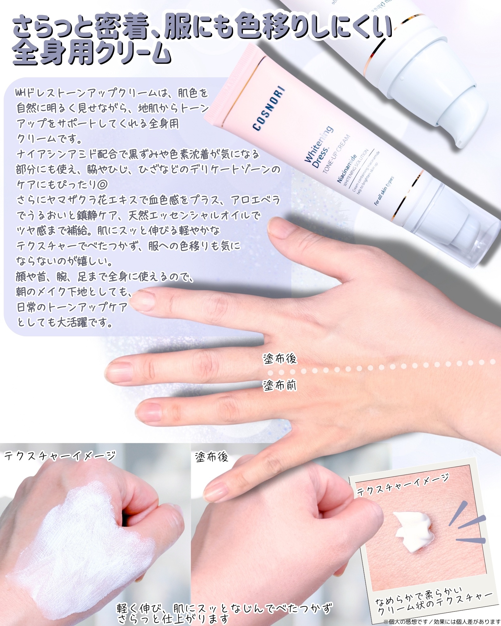 COSNORIWHドレストーンアップクリーム顔だけじゃないよ全身に使えるトーンアップクリームぱっと血色よく見られる肌の秘密は🤫ヤマザクラ花エキス🌸ドレストーンってぴったりな表現って、、、言葉がすでに美し🥰🌸WHドレストーンアップクリーム🌸軽や...