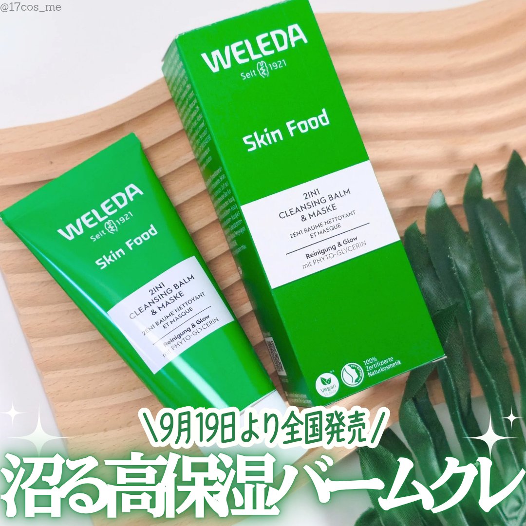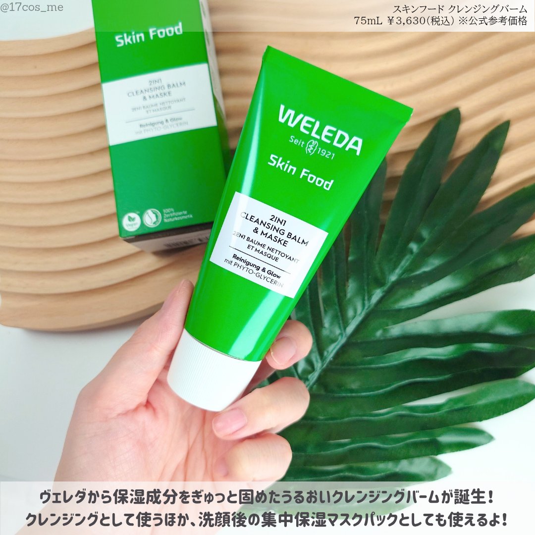 - とろける濃密・温感テクスチャー 植物生まれの濃密クレンジングバーム 乾燥肌のための温感・バームタイプクレンジング。 肌にのせた瞬間とろけ広がり、メイク汚れはもちろん、不要な角質や毛穴汚れまでしっかりオフ。スキンフード伝統ハーブレシピを中心に美容成分を贅沢に配合し、洗い上がりの肌はしっとりやわらかな仕上がりに。乾いた肌に塗布して少し置くことで、フェイスマスクとしてもご使用いただけます。心地よい温感に包まれ、まるでスパのような贅沢な時間をお楽しみください。 100%天然由来成分。 NATRUE 認証取得。 ◇密着汚れも毛穴汚れも浮かせて、するんとオフ 油分汚れとなじみの良いバームが、メイク汚れ・毛穴汚れなどを浮かせてすっきり落とします。角栓・黒ずみ対策にも効果的です。 ◇とろける濃密・温感テクスチャー 肌に乗せた瞬間にじんわりやさしい温感が広がり、バームが優しくとろけ心地よく肌になじみます。 ◇スキンフード伝統ハーブ配合処方。美容成分で洗う高保湿クレンジングバーム 保湿成分をベースに、肌荒れを防ぐ伝統ハーブエキスを溶け込ませました。 洗い流したあとは、うるおいのヴェールが肌を包み、しっとりやわらかな素肌へと導きます。 ◇集中保湿マスクとしてもご使用いただけます 保湿成分をぎゅっと固めたバームは、集中保湿マスクとしても使用可能。 5 ~ 10 分間肌に乗せて洗い流せば、しっとりモチモチの肌に ■先行発売情報 2025年8月29日より (※全国発売/9月19日から) ・ヴェレダ直営店、ヴェレダ公式オンラインショップ https://www.weleda.jp ・ロフト ・コスメキッチン、ビープル (※一部店舗除く)