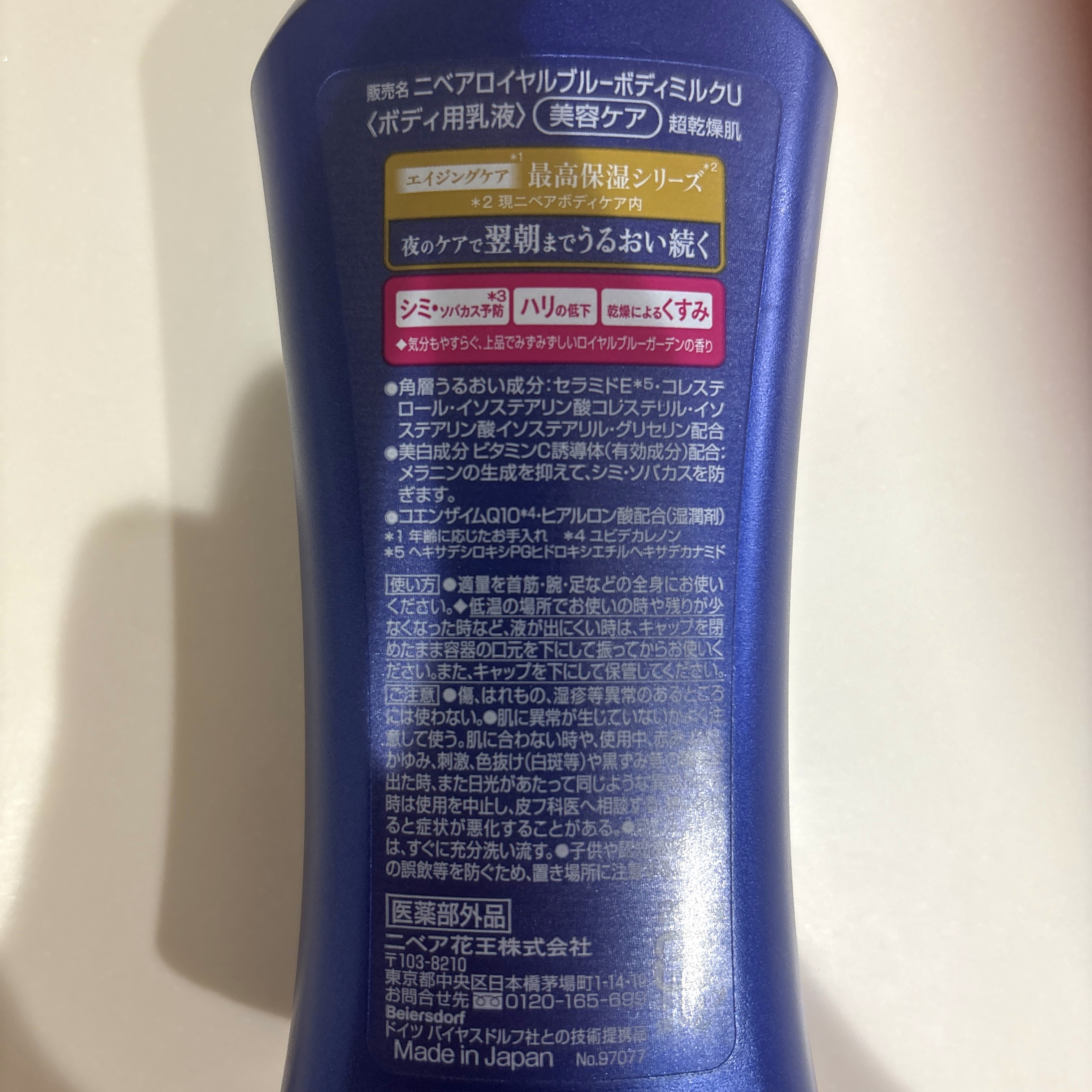 ロイヤルと名前がついているだけあって、高級感があり、ニベアのシリーズでもワンランク上の印象です✨ ベタつかないのに、高保湿なので、ふくらはぎなんかも、恥ずかしながら乾燥がひどく粉をふいたりしてたのも、しっとりとした肌になりました! 角層うるおい成分にセラミド、美白成分にビタミンC誘導体配合、コエンザイムQ10、ヒアルロン酸も配合されているので、シミ、そばかすの予防や、ハリの低下、乾燥によるくすみが気になる方などにもぜひ使ってもらいたいです✨