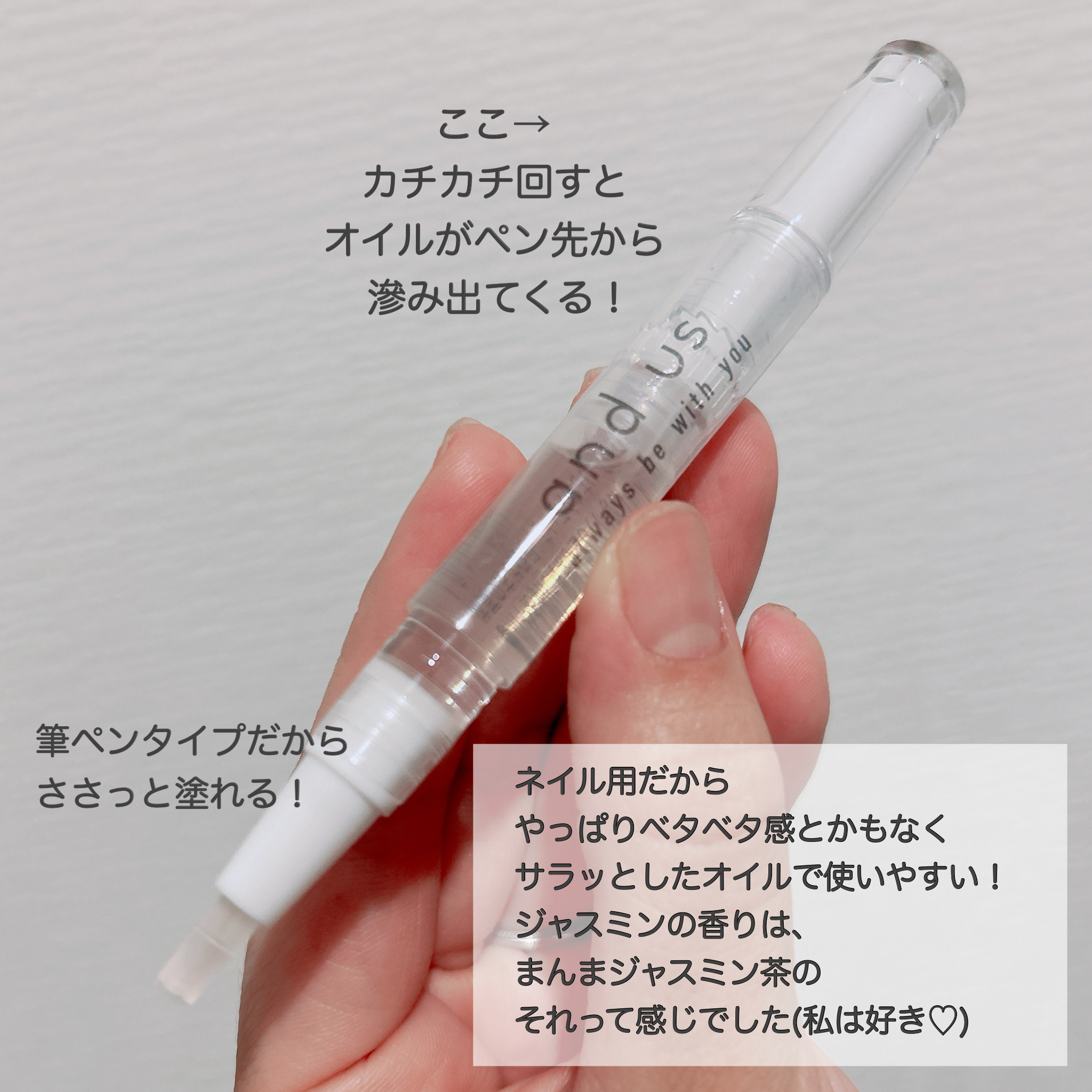 コスパ良き、紅茶のネイルオイル これは、ペンタイプになっていて、ポーチなどに入れやすいです! 甘い紅茶の香りがするので、使うたび、幸せな気持ちになれます♪ お値段的にも、お財布に優しいので、使いやすいです!!